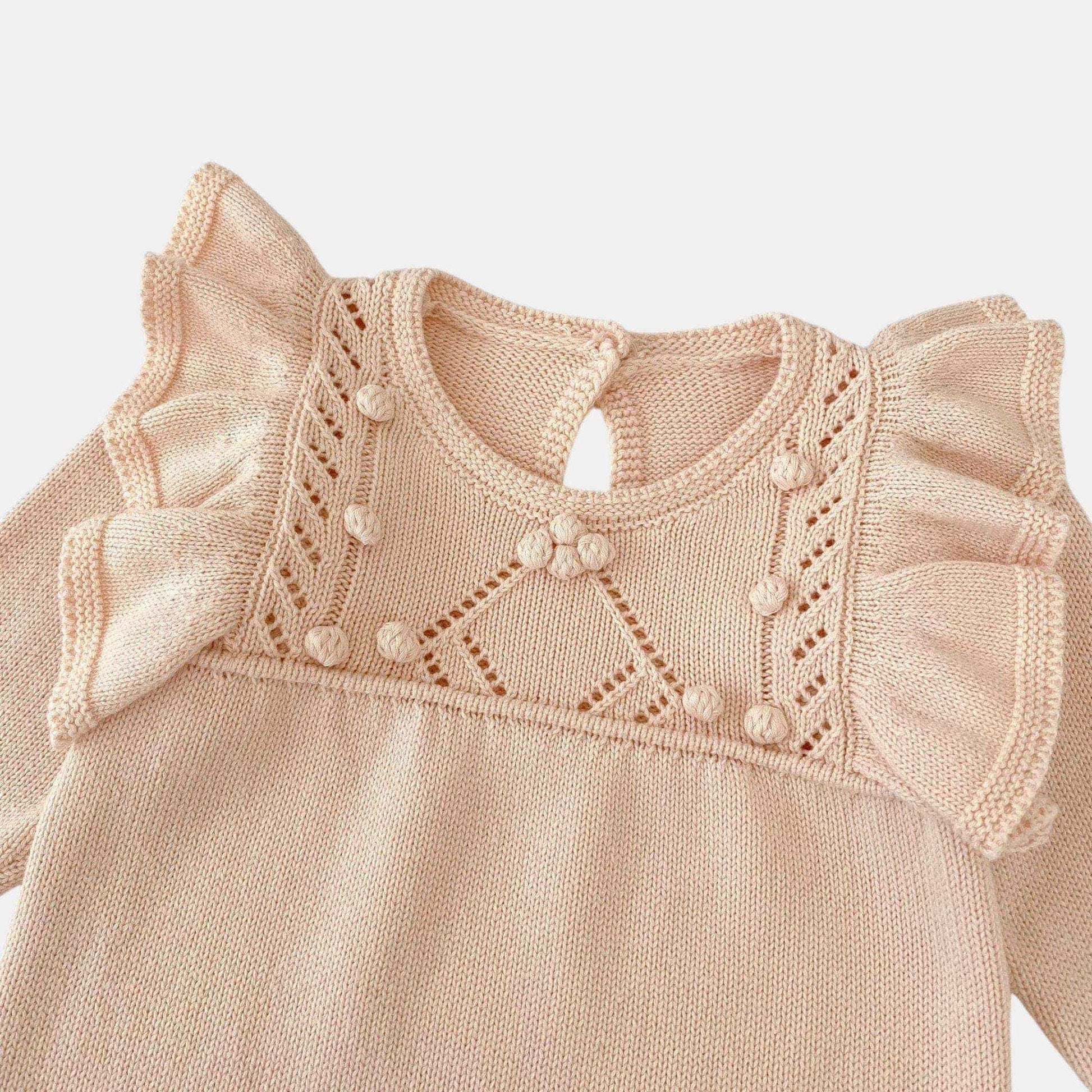 This cosy blush knit romper is finished with ruffle and pom-pom details across the chest and handy crotch buttons for effortless dressing. Long sleeves and soft knit fabric make it ideal for play, naptime, family outings, or layering with a matching cardigan.