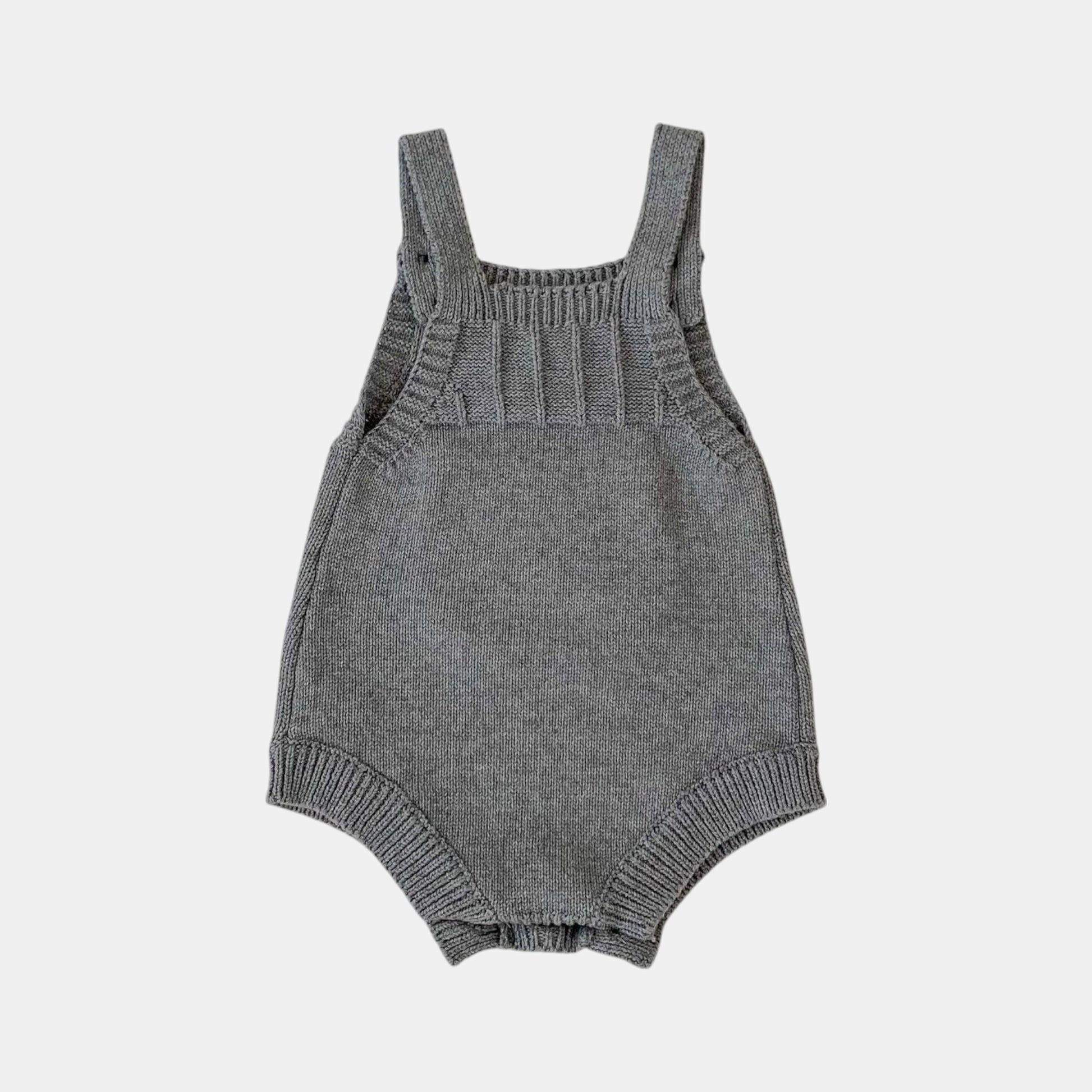 A classic grey cotton romper with soft shoulder and crotch snaps for easy changes, plus a playful chest pocket to tuck little treasures into. Wear it alone on mild days or layer over a bodysuit when the air turns crisp. The kind of no-fuss staple that’s ready for park trips, nursery days, or lazy Sundays at home.