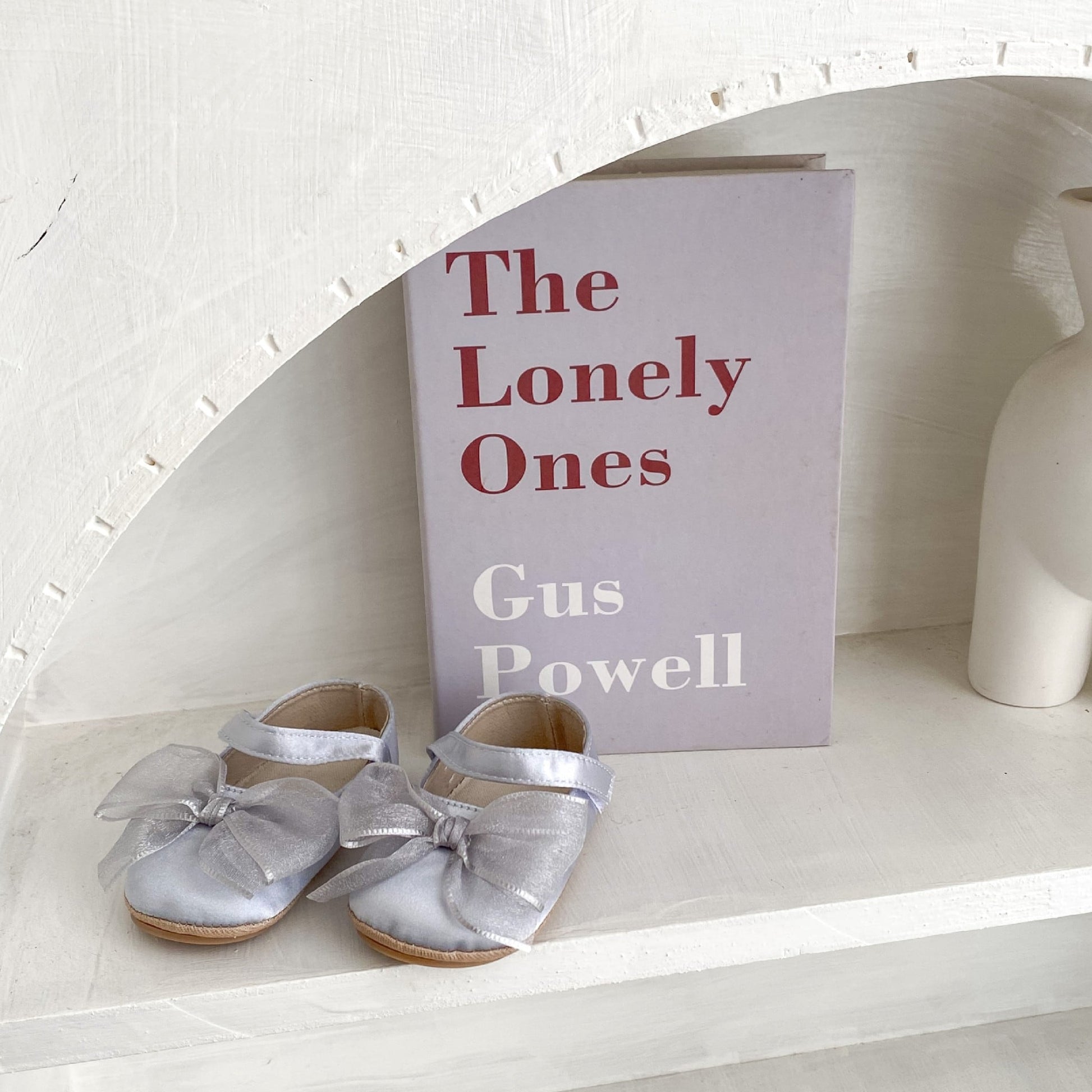 A soft silver satin upper gives these shoes their delicate shine, perfect for catching the light in quiet moments. A matching organza bow adds a dreamy touch, like a little cloud resting on tiny toes. Finished with a velcro strap and sturdy rubber soles, they’re made for special days and little adventures alike.