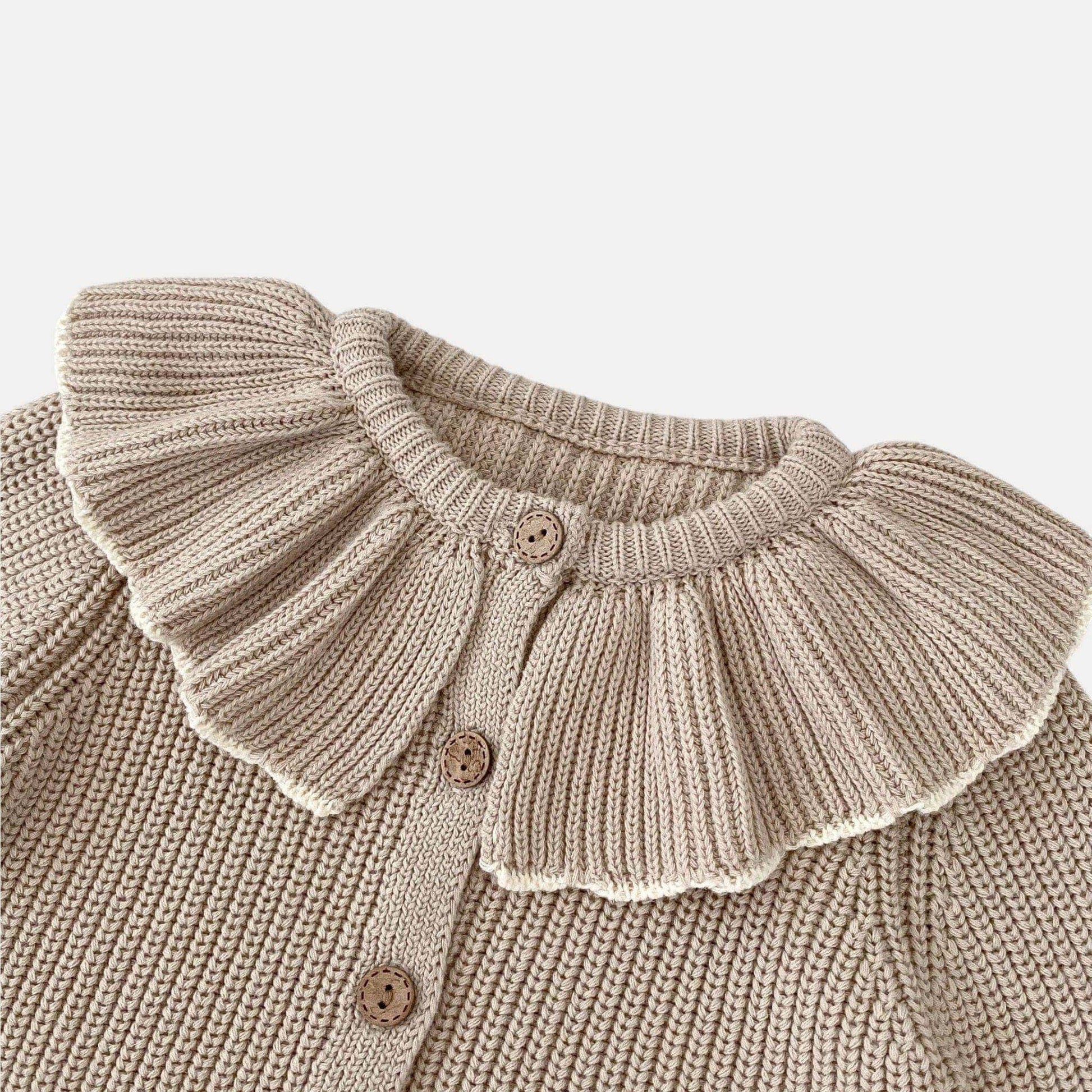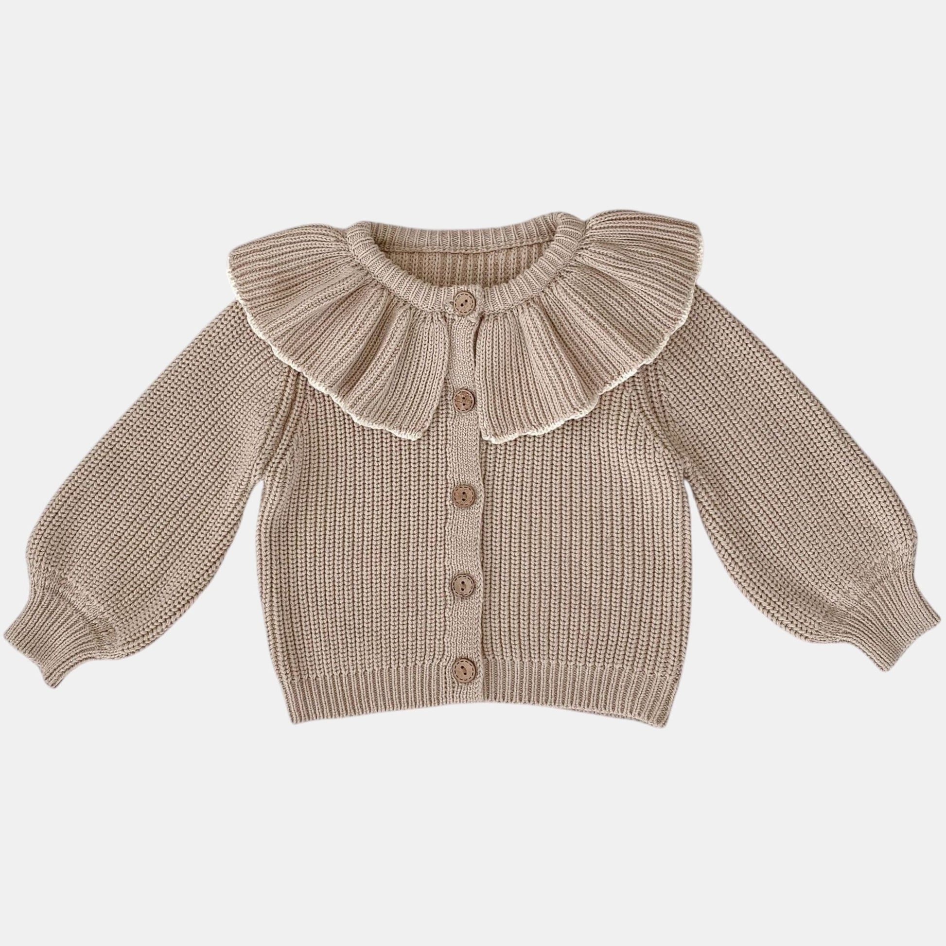 Soft and refined, this khaki cotton knit cardigan brings timeless charm to your little one’s wardrobe. Its statement ruffle collar, edged with delicate ivory trim, frames the neckline with graceful elegance, while balloon sleeves tapering to snug cuffs add a playful, whimsical touch. Crafted from 100% cotton for luxurious softness and comfort, the button-front design makes dressing simple—perfect for layering over dresses or pairing with trousers, blending elegance with everyday practicality.
