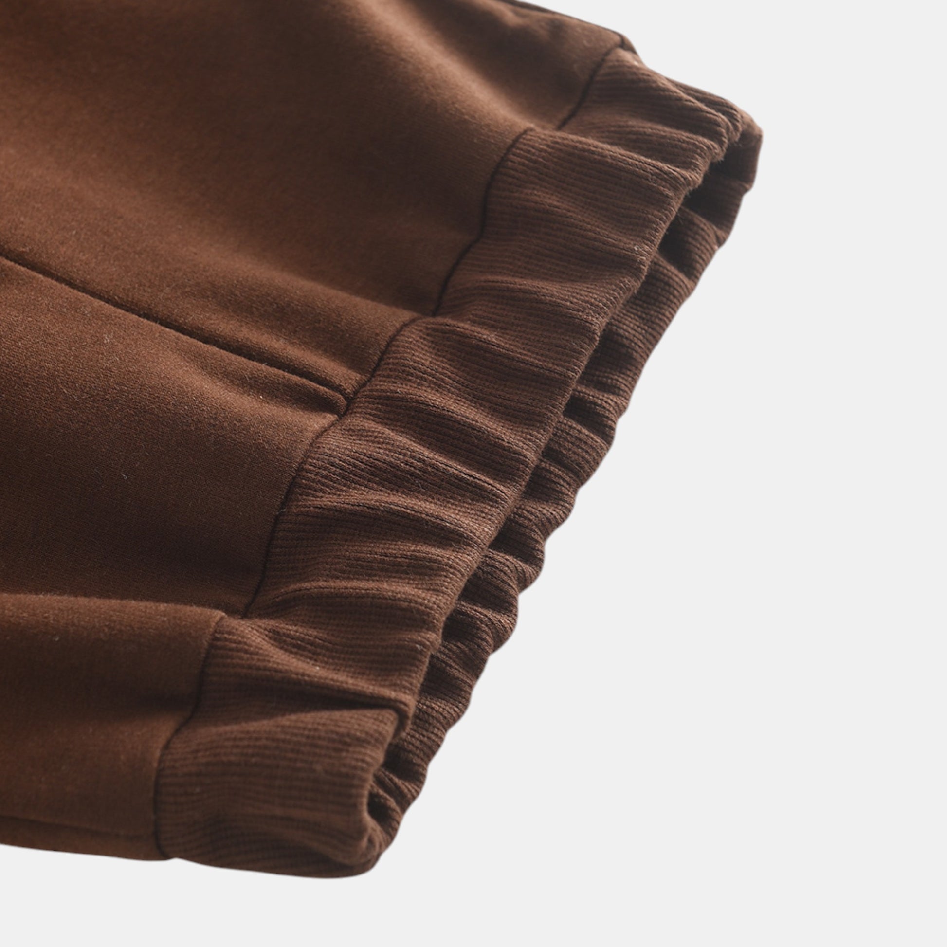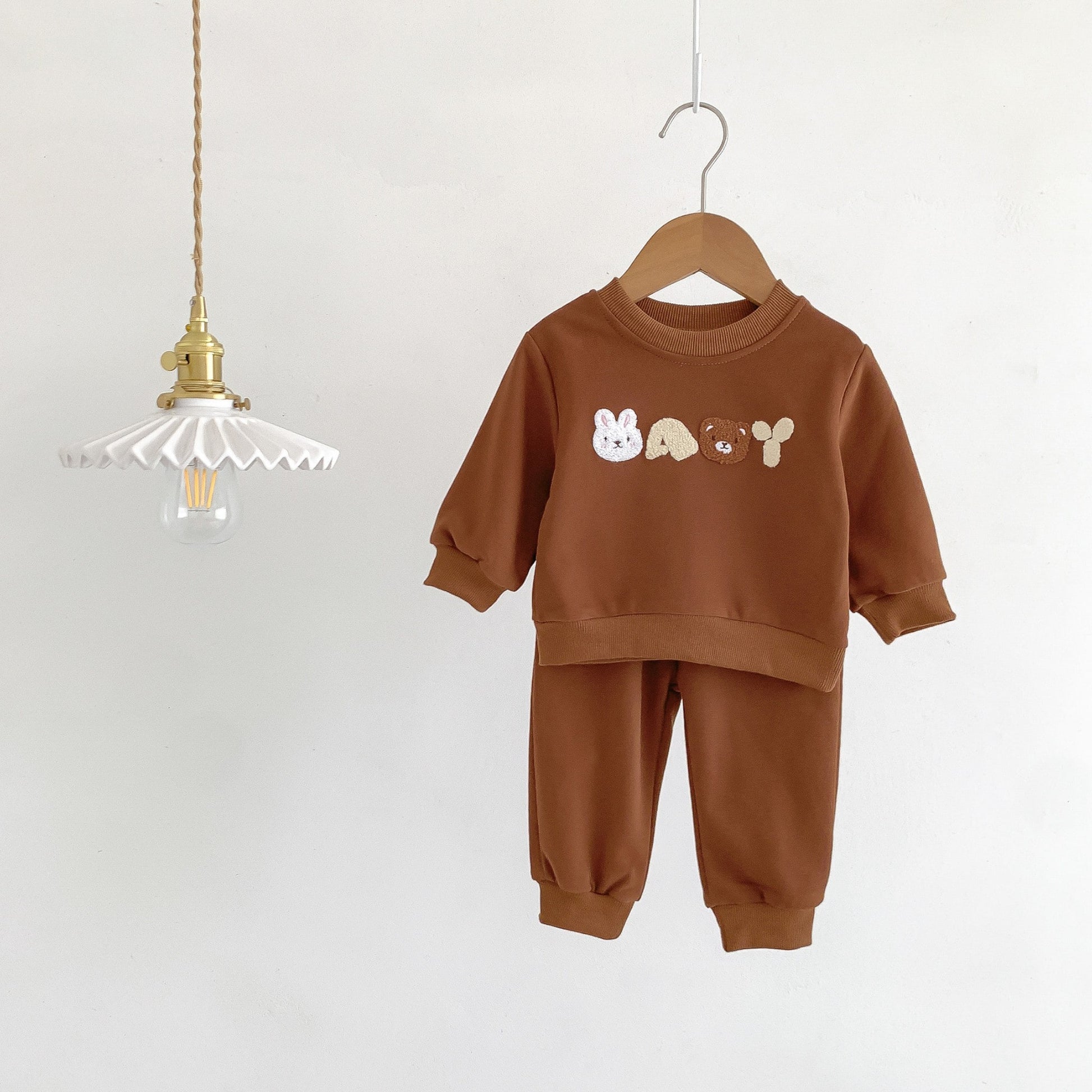 A cosy companion for everyday moments, this two-piece cotton lounge set features an adorable bunny and bear duo, cleverly arranged to spell out "BABY" across the sweater. The warm brown tone adds a touch of richness, while the soft cotton and elasticated waist and cuffs make it a snug fit for relaxed days and gentle play.