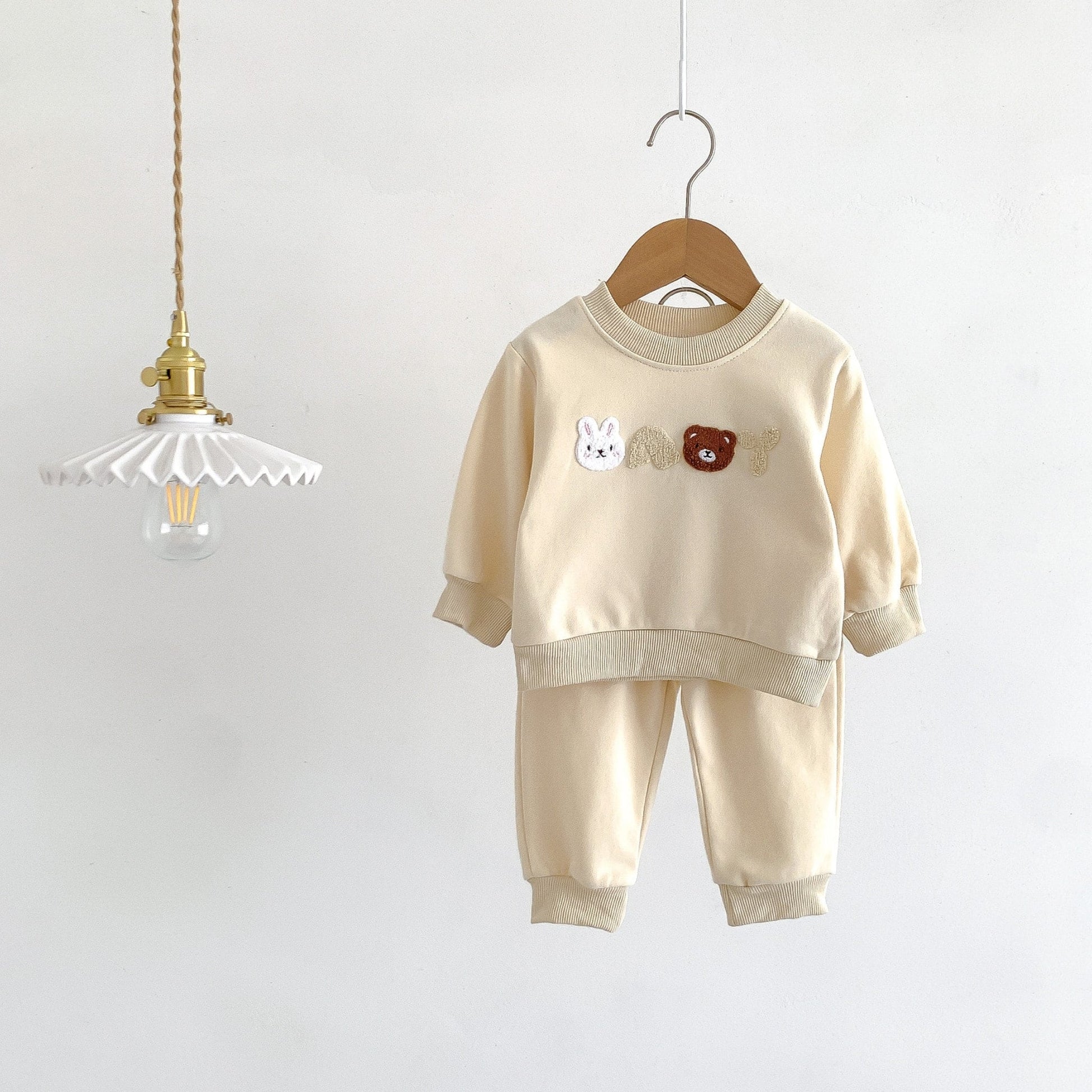 Soft and soothing, this lounge set brings a gentle charm to your little one’s wardrobe. The sweet bunny and bear appliqués form the word "BABY" on the chest, adding a playful detail to the neutral beige base. Made from breathable cotton with stretch cuffs and waistband, it's ideal for comfort from morning cuddles to afternoon naps.