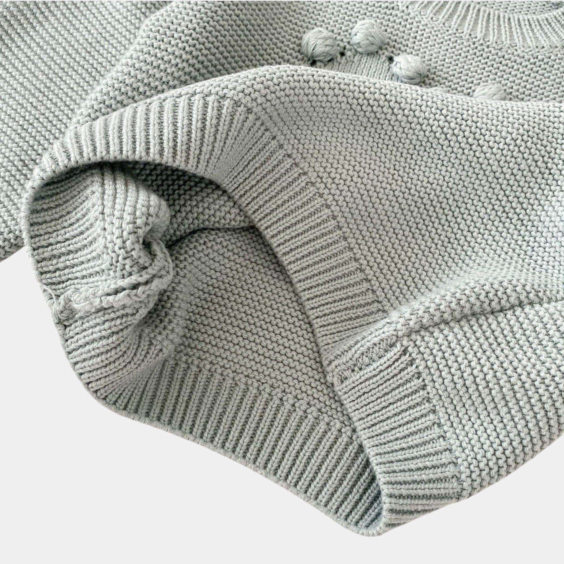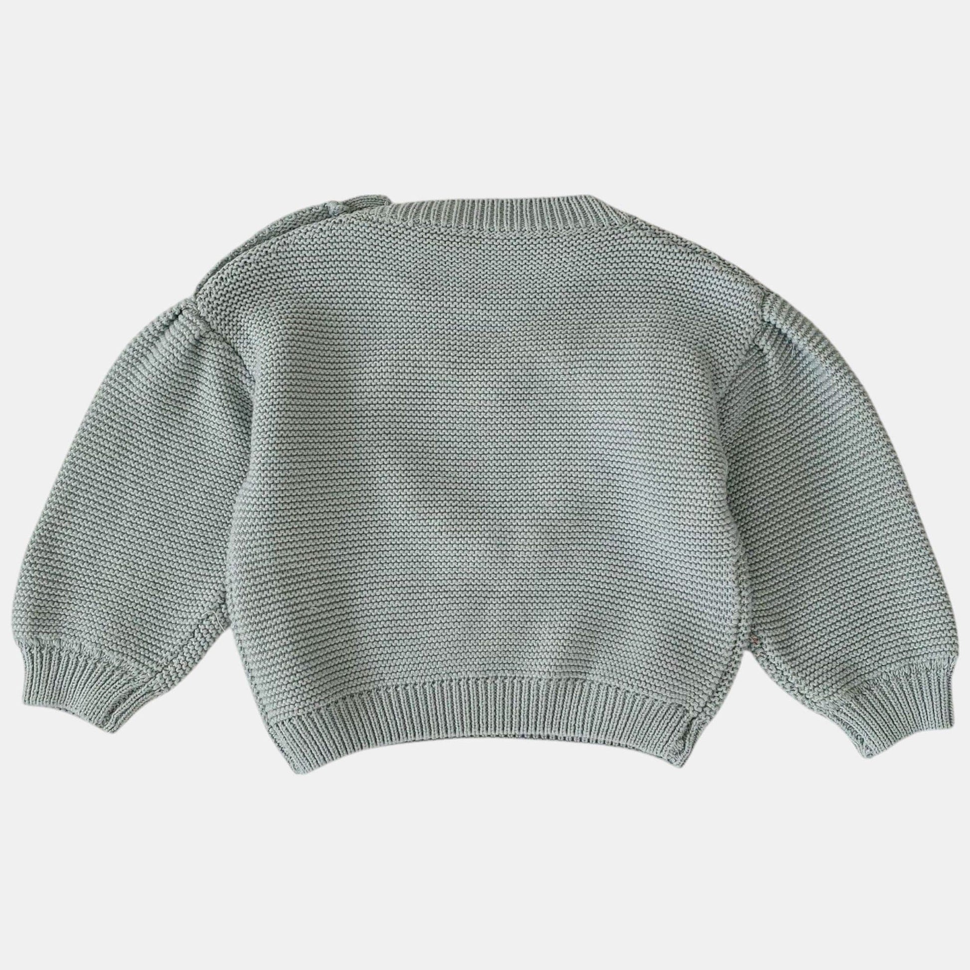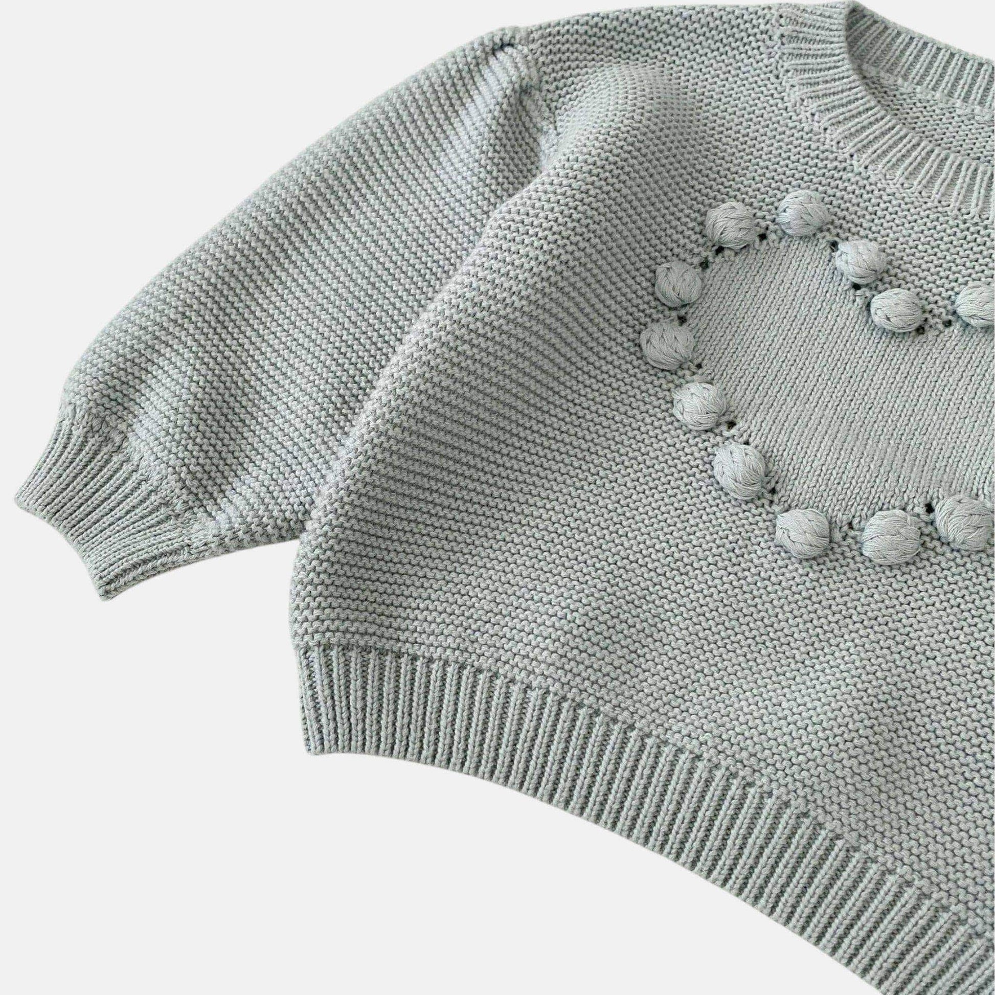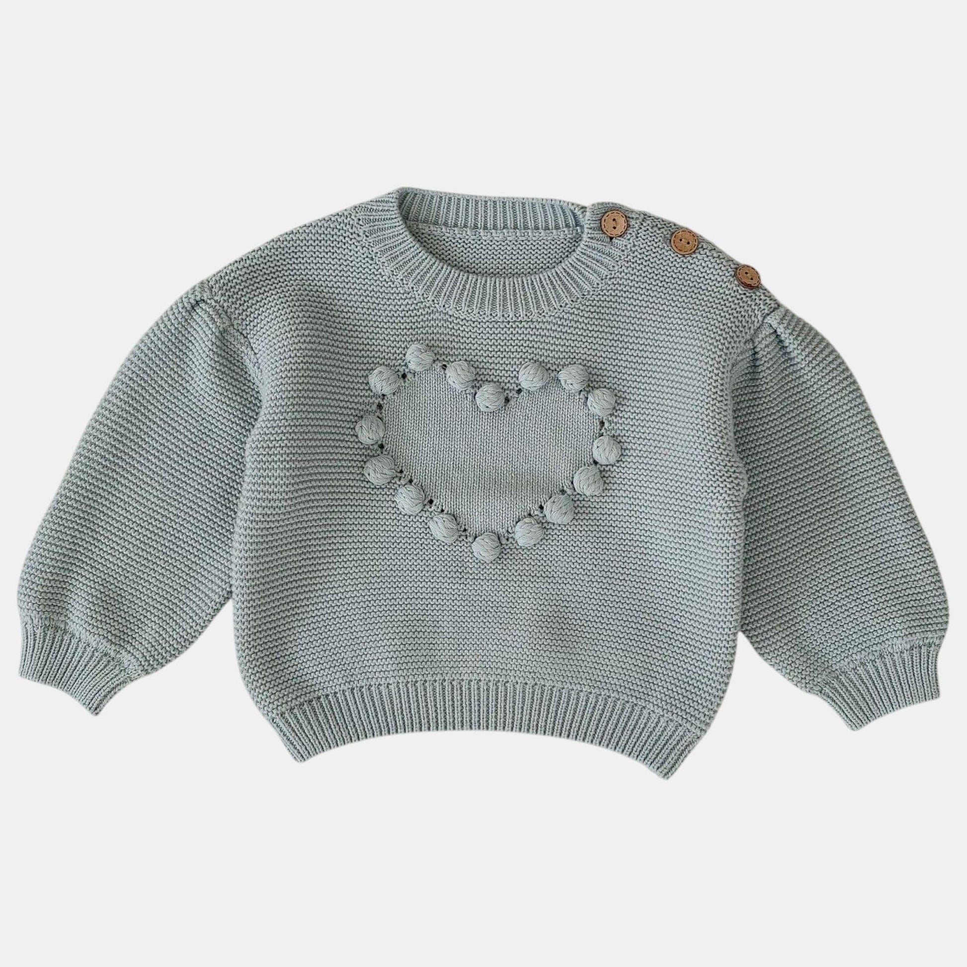 A dusty blue cotton pullover sweater with playful pom-poms woven into a heart shape – a detail made for tiny hands to explore. The shoulder button makes dressing effortless, while the soft knit keeps them cosy during nursery mornings or weekend adventures. Sweet enough to stand out but simple enough to pair with everything, it’s the kind of sweater that becomes their go-to for both playdates and lazy afternoons at home.