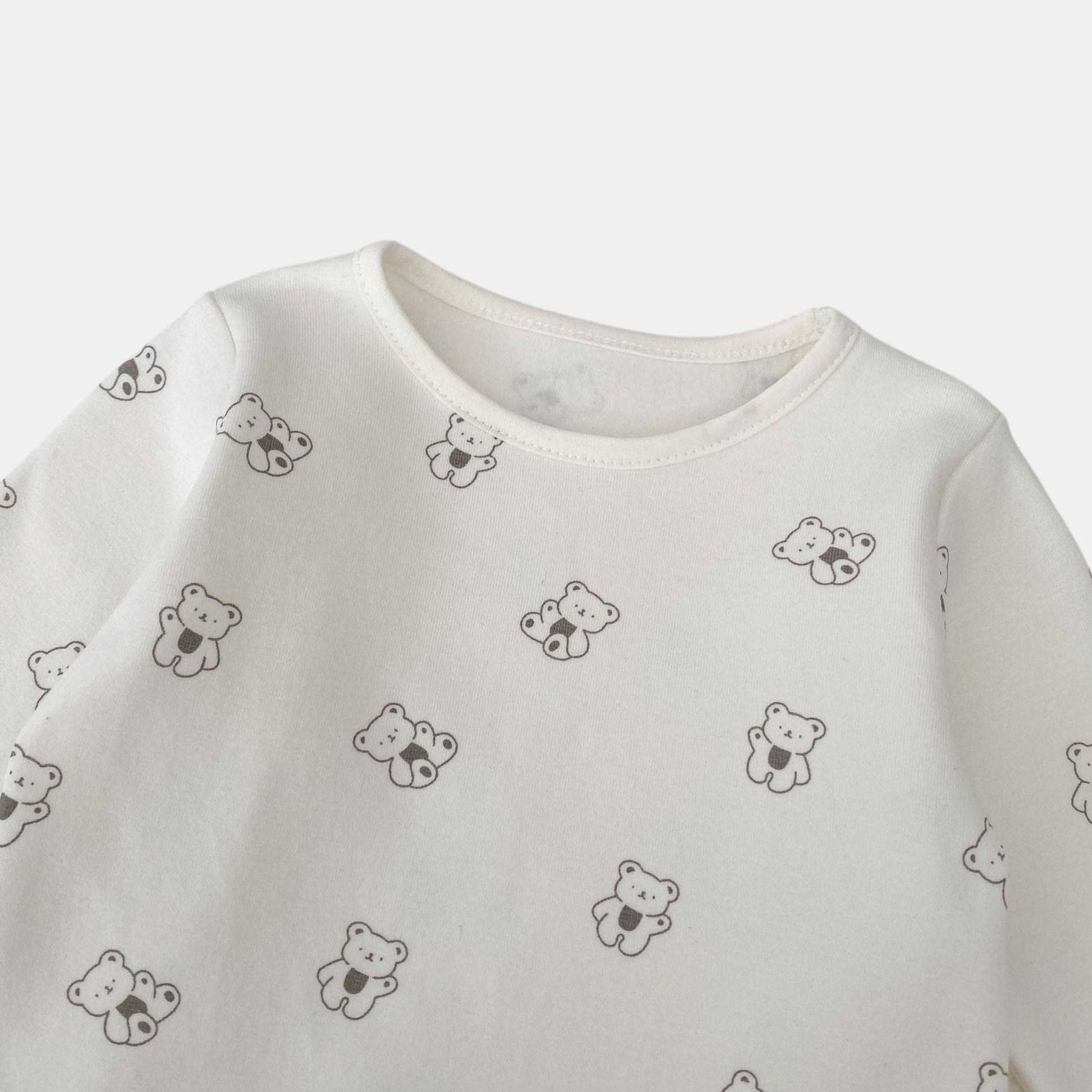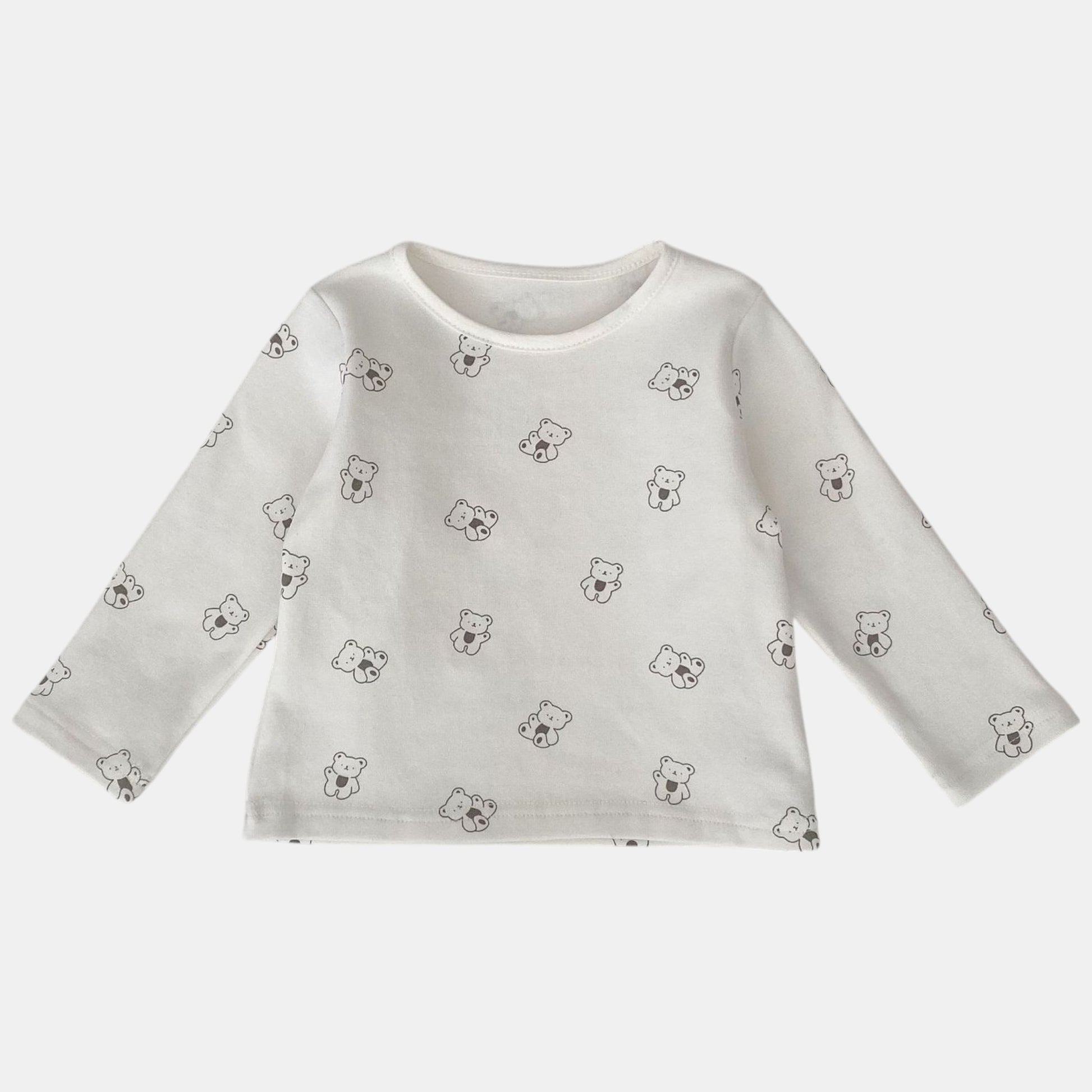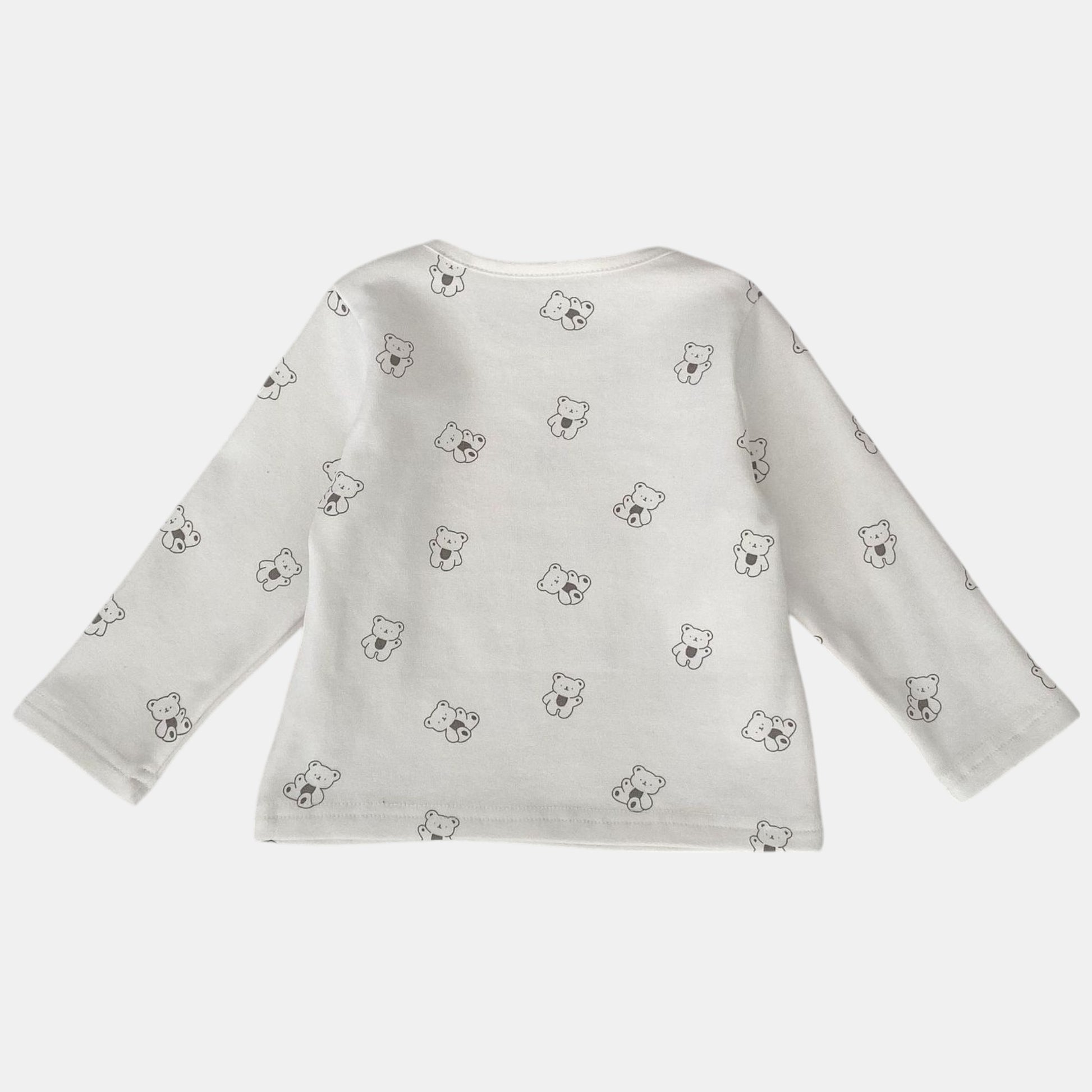 An ivory cotton top with a playful allover print of waving bears—the pullover design making it as easy to wear as it is to love. Pair with denim overalls for park adventures or layer under a cardigan for weekend errands. For little ones who turn grocery runs into bear-hunting expeditions and puddle jumps into grand adventures.