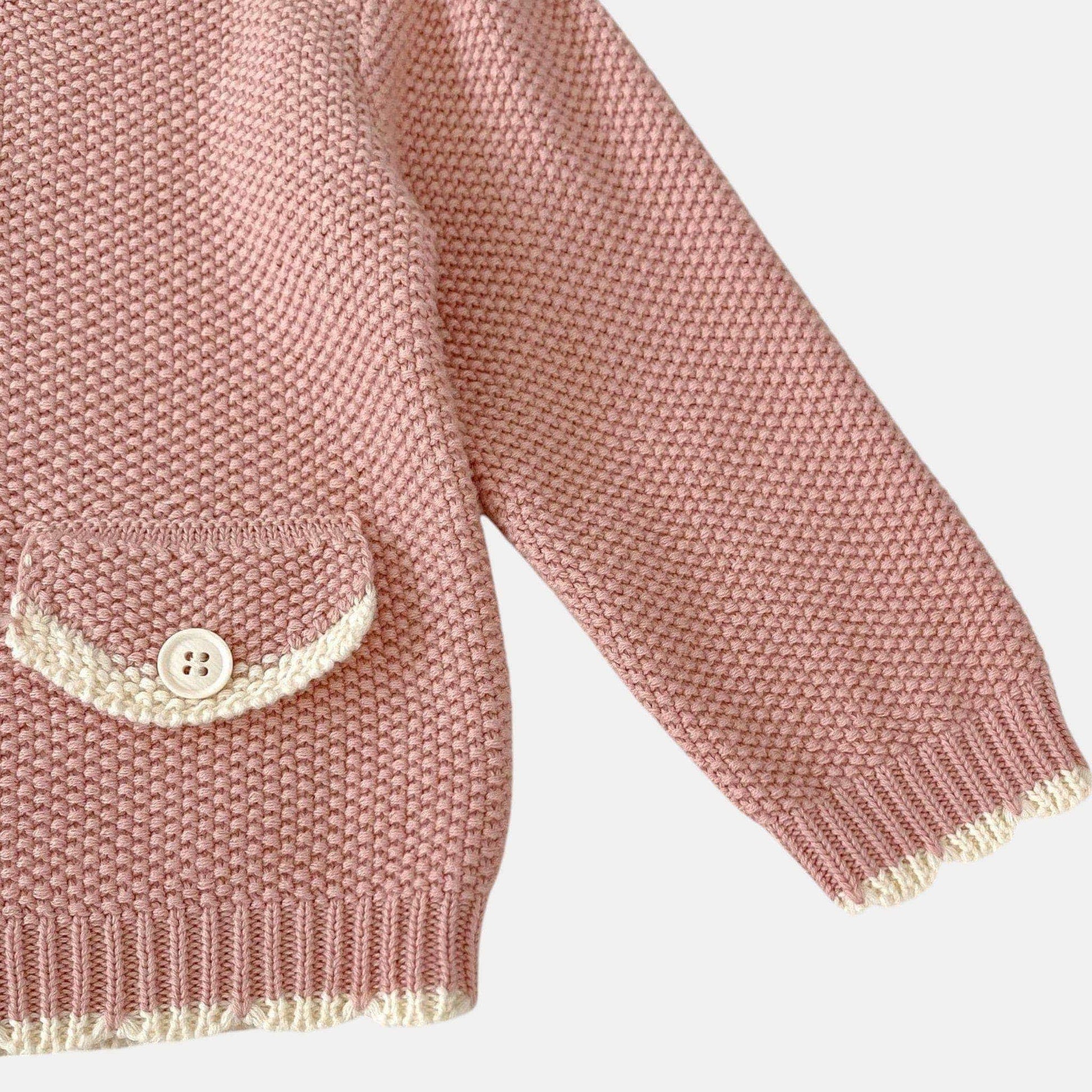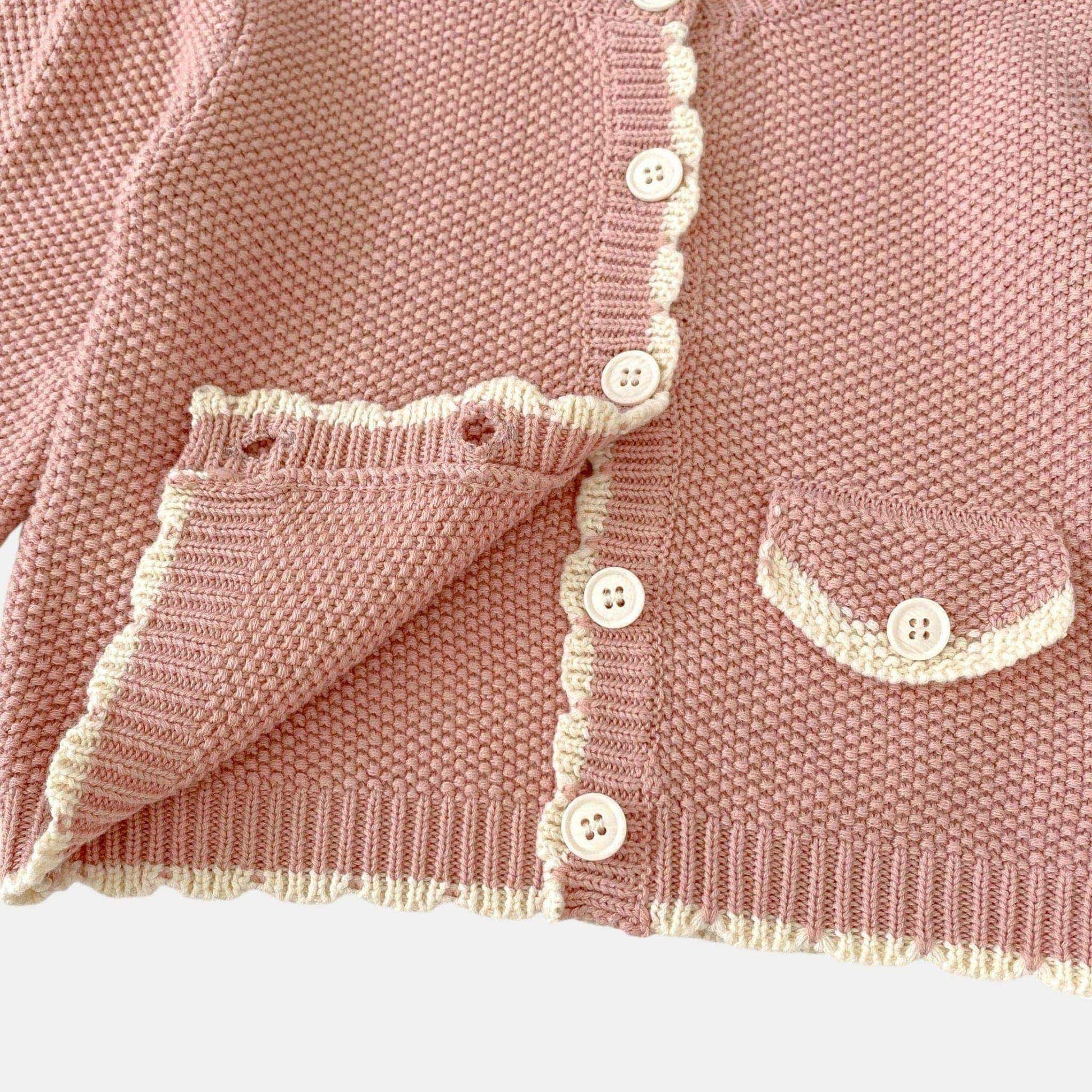 A dusty pink cotton knit cardigan trimmed with delicate white scallops and framed by playful faux pockets. Wear it buttoned over the matching romper for a softly coordinated look, or layer it over a cream cotton dress for understated elegance. Lightweight and gently breathable, it’s the perfect companion for garden playdates, weekend brunches, and every sweet moment in between.