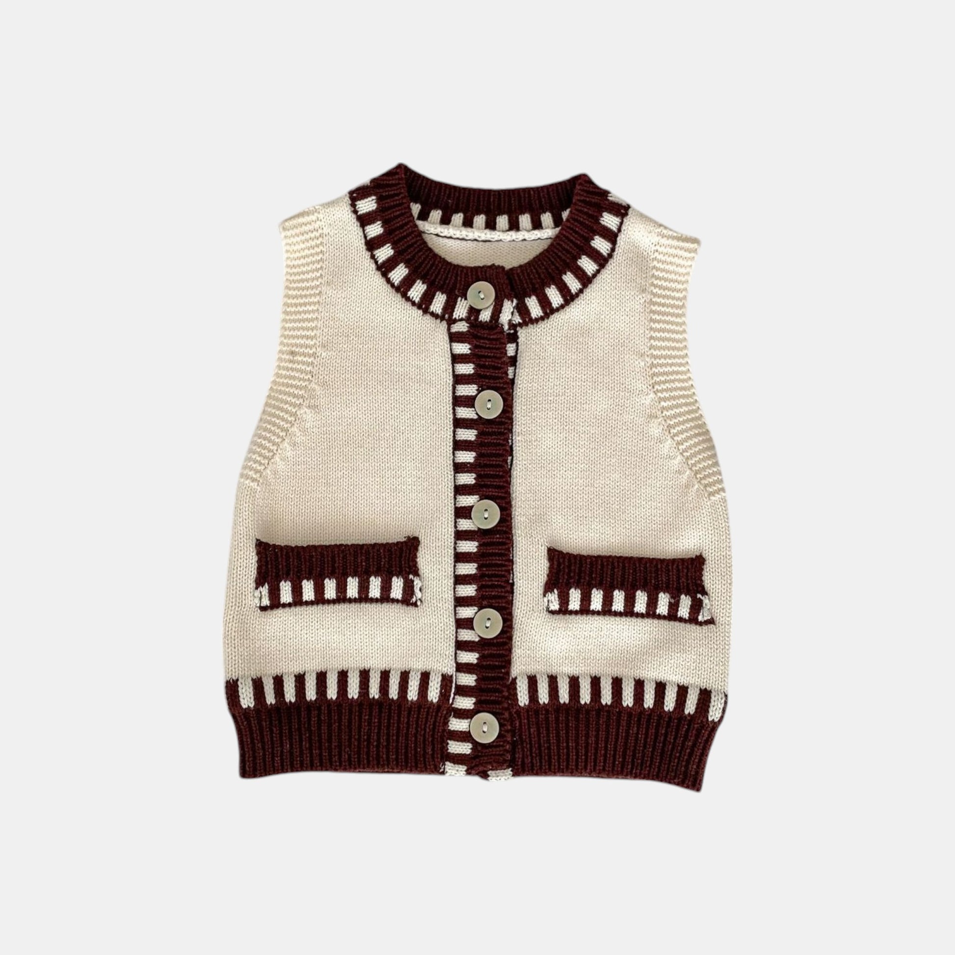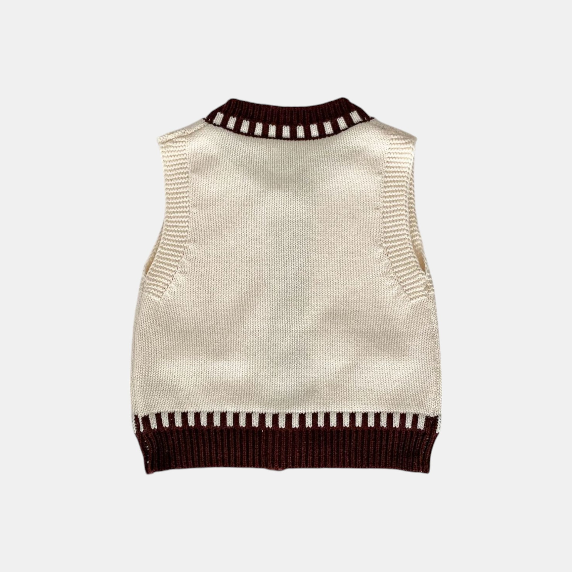 A soft cream cotton vest with a ladder brown trim and playful faux pockets, designed for easy layering over shirts or jumpers. The button-front opening adds practicality, while the heritage-inspired details bring timeless charm. Perfect for nursery days, weekend walks, or adding a polished touch to playtime outfits.