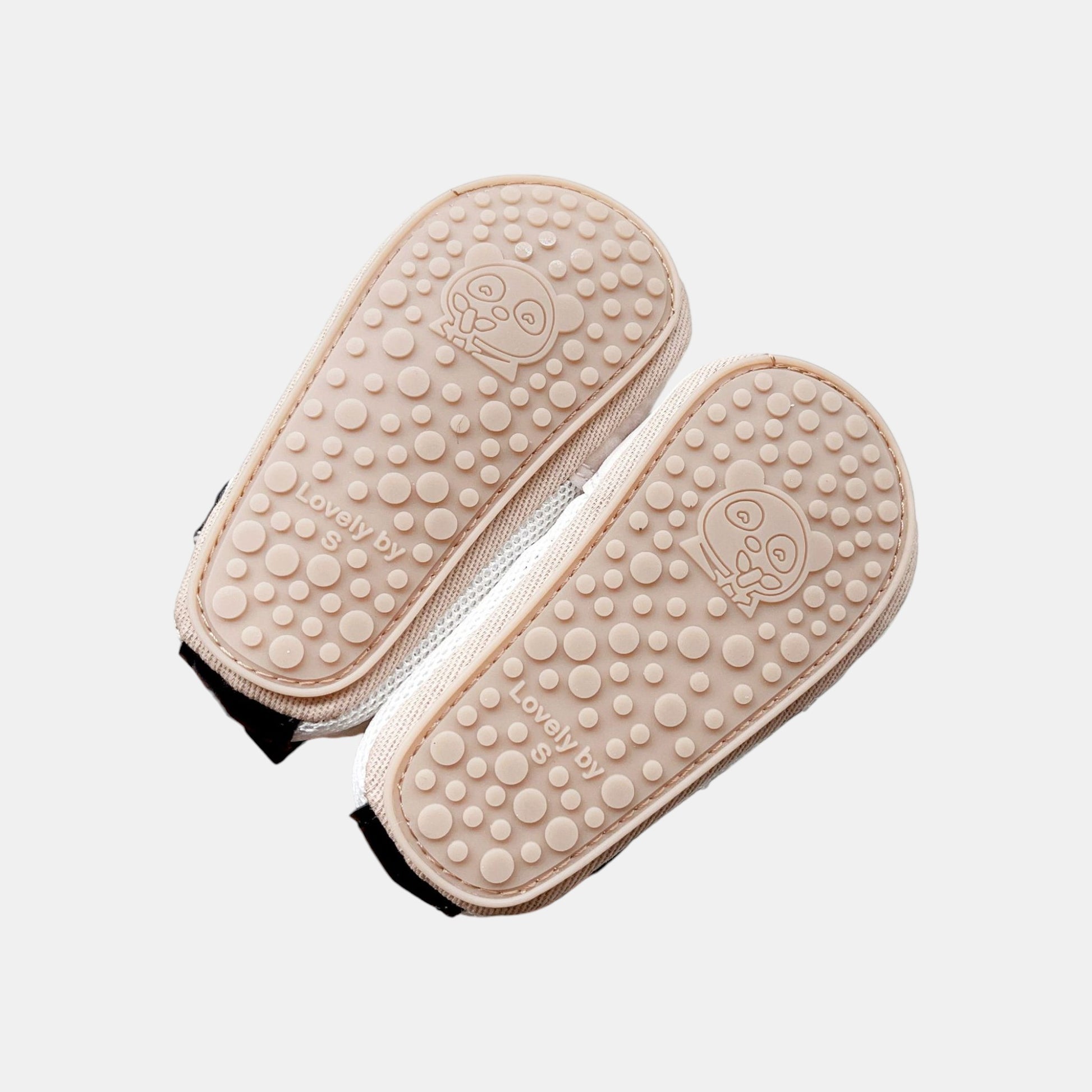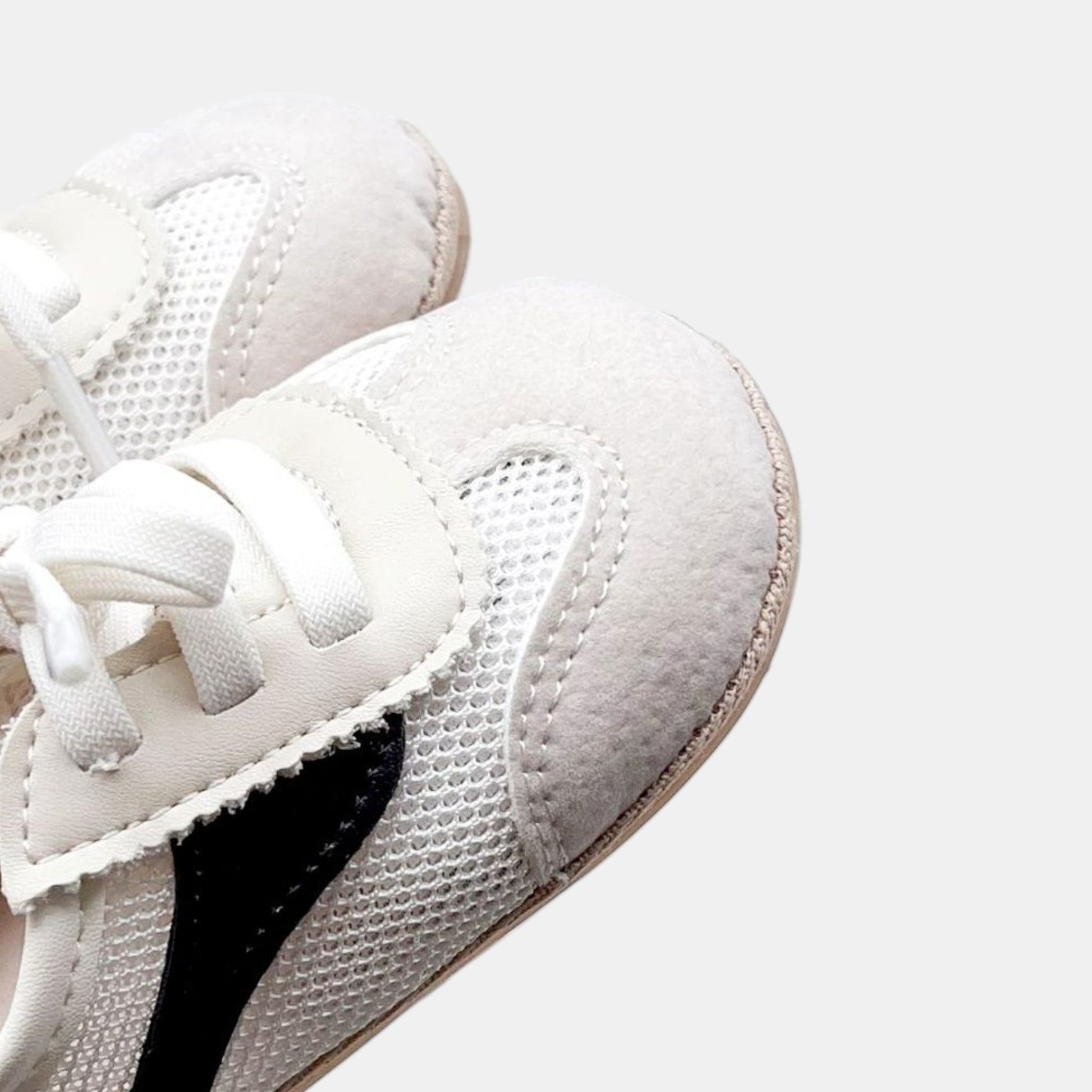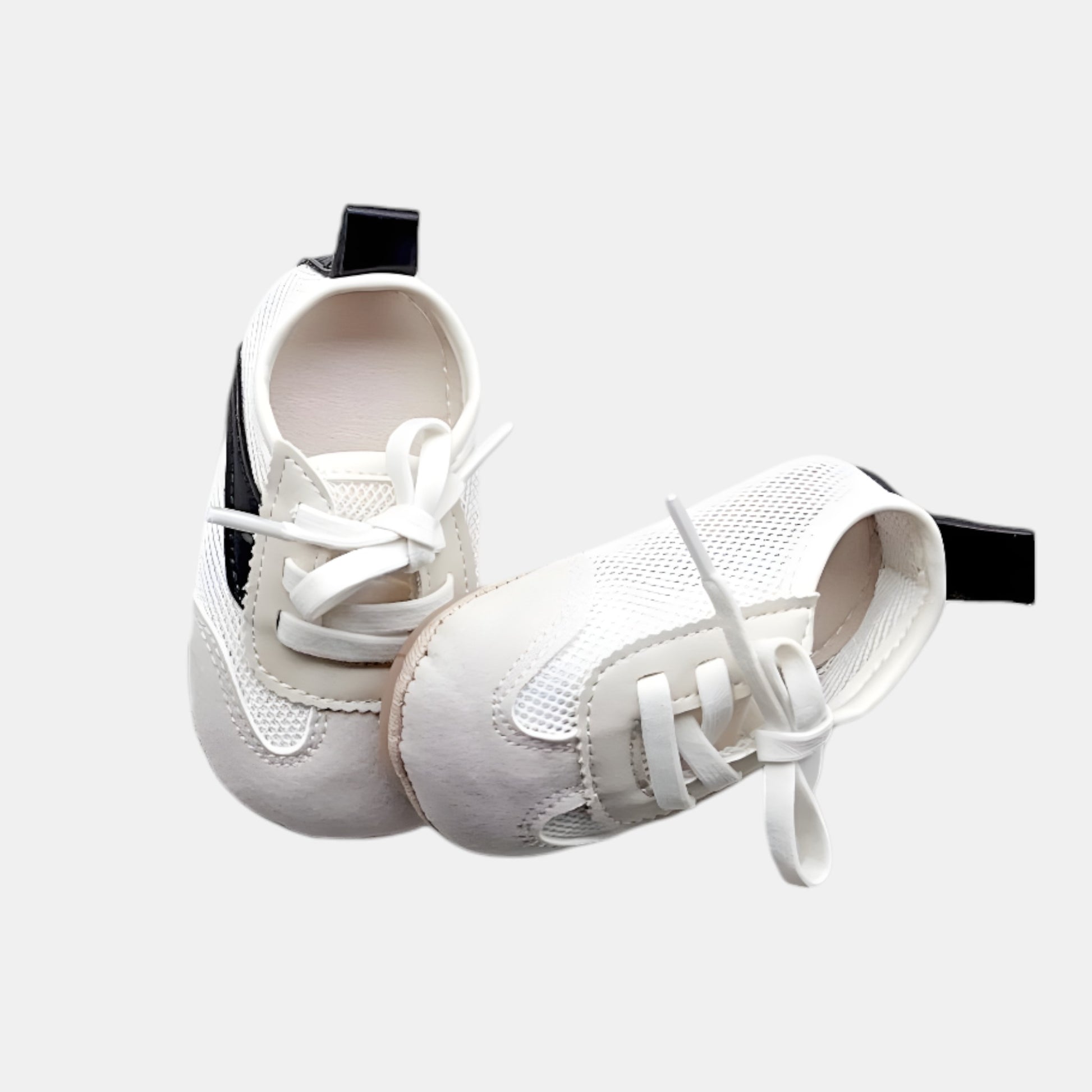 These breathable mesh sneakers pair a soft cream upper with bold contrast details for understated style. The secure lace-up closure and flexible grippy soles support little explorations, from first steps to playground adventures. Lightweight yet practical, they’re designed for comfort wherever tiny feet wander.