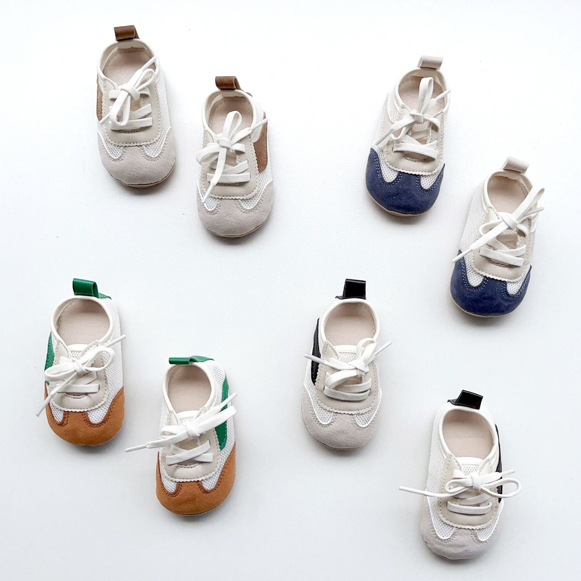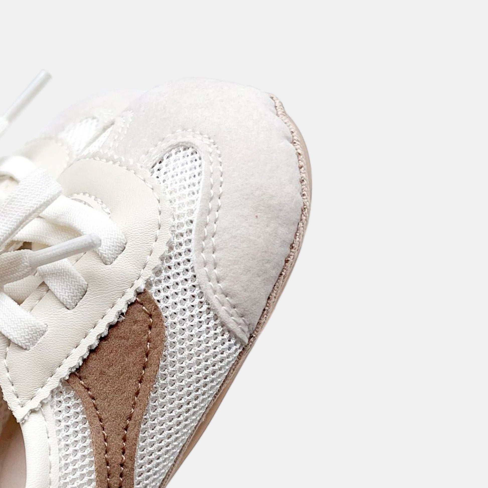 Soft cream sneakers with breathable white mesh and warm brown contrast panels for a timeless look. The lace-up design ensures a snug fit, while flexible grippy soles support every step—from first walks to playground adventures. Practical yet full of understated charm, they’re designed for little explorers on the move.