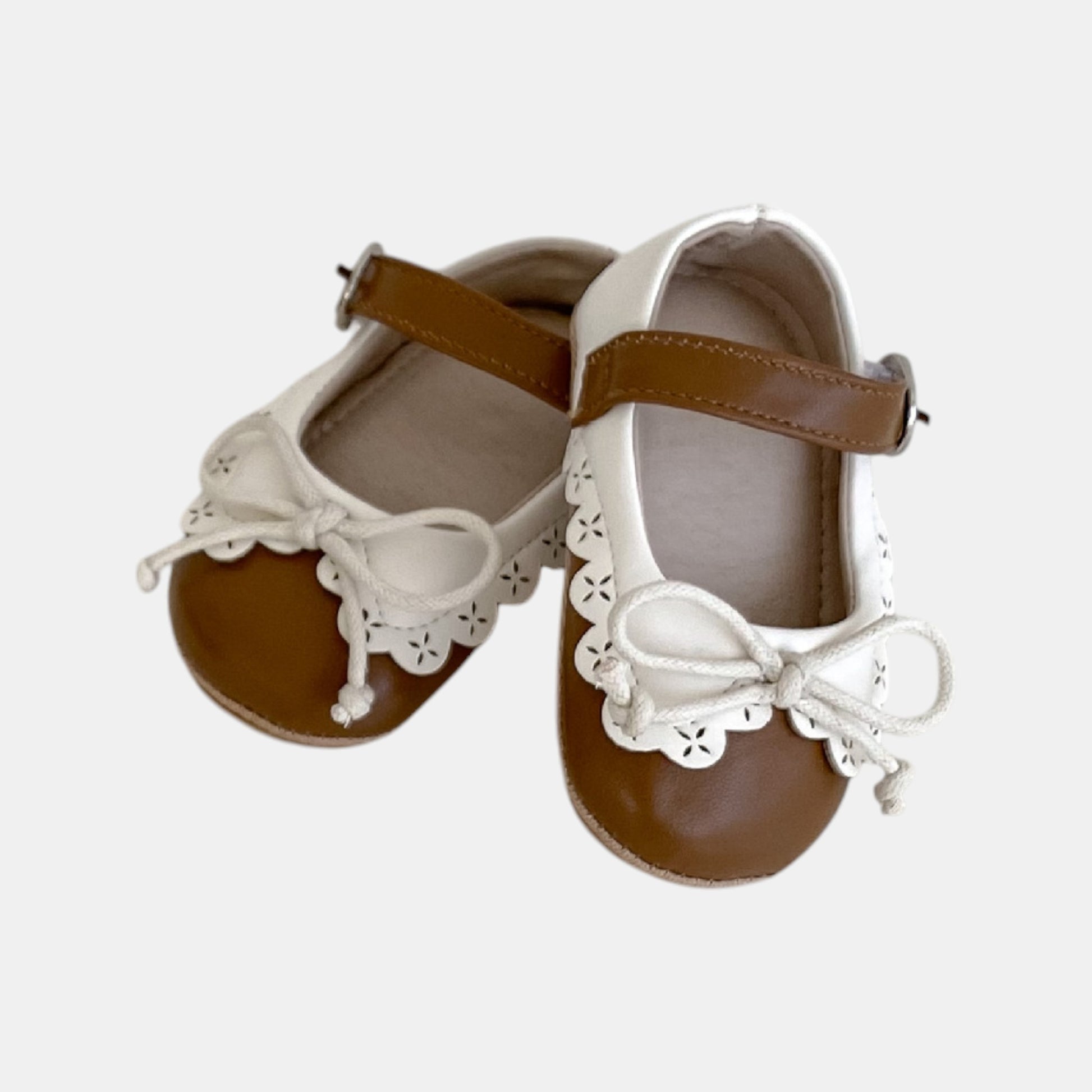 Warm brown faux leather shoes with vintage-inspired white scallop detailing. Featuring an easy-adjust Velcro buckle strap and grippy rubber soles for stable steps. Ideal for adding rustic charm to everyday outfits.