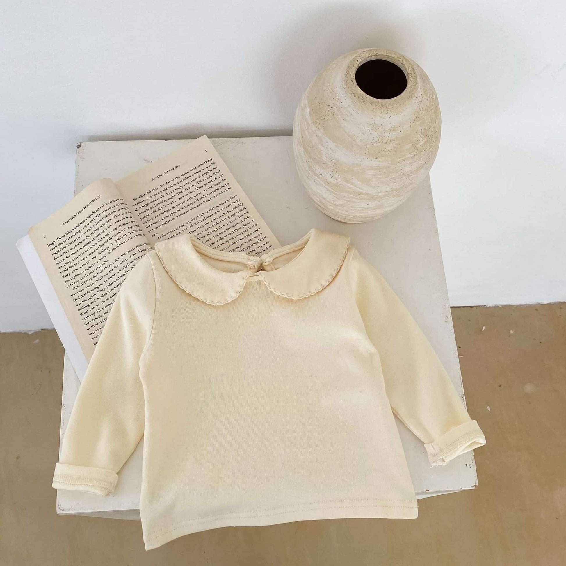 A warm cream cotton-blend top with a delicate scallop-edged Peter Pan collar—soft, stretchy, and full of quiet charm. The long sleeves add just enough warmth for crisp days, while the relaxed fit makes it ideal for layering under pinafores or wearing solo with jeans. Perfect for nursery days, weekend brunches, or adding a polished touch to playtime outfits.