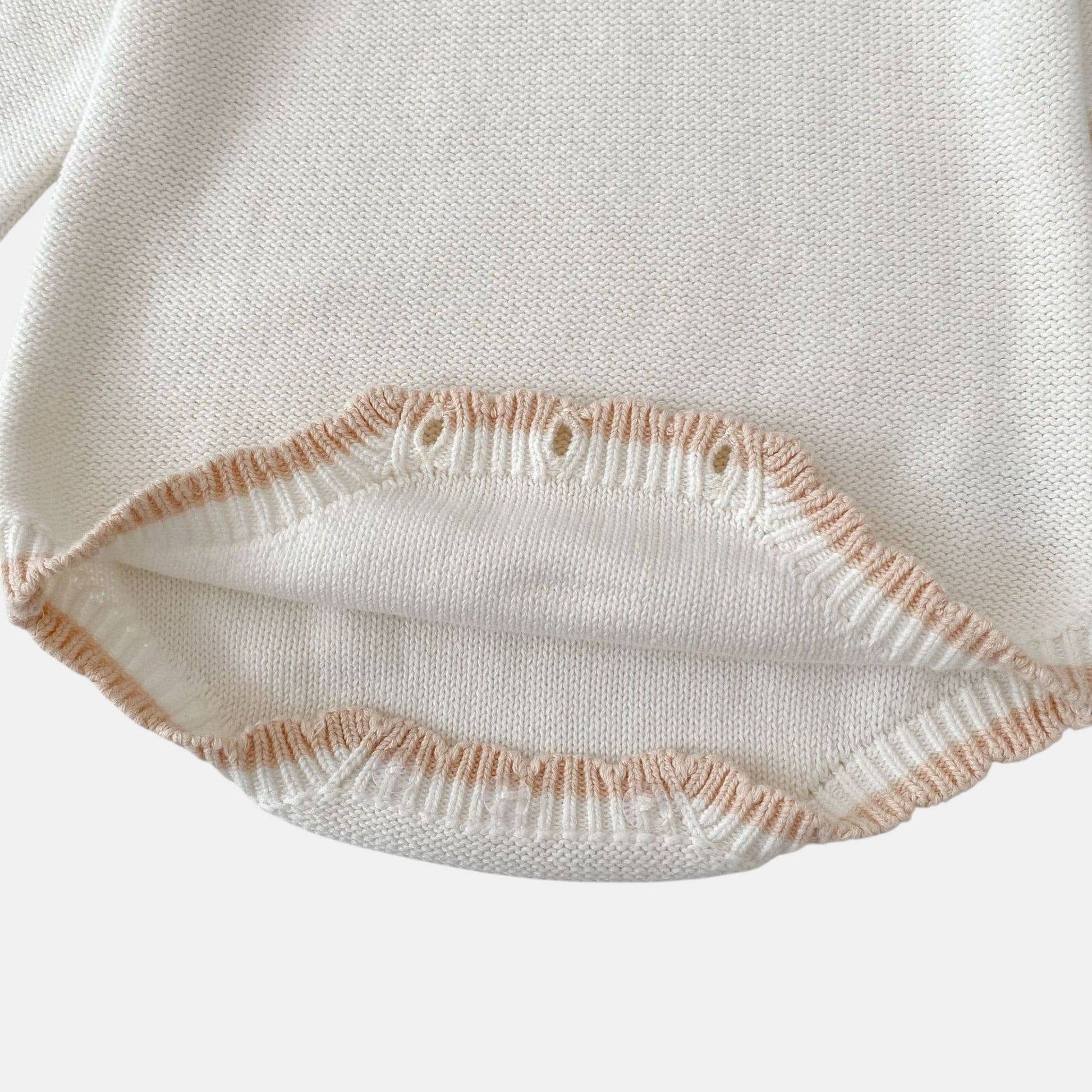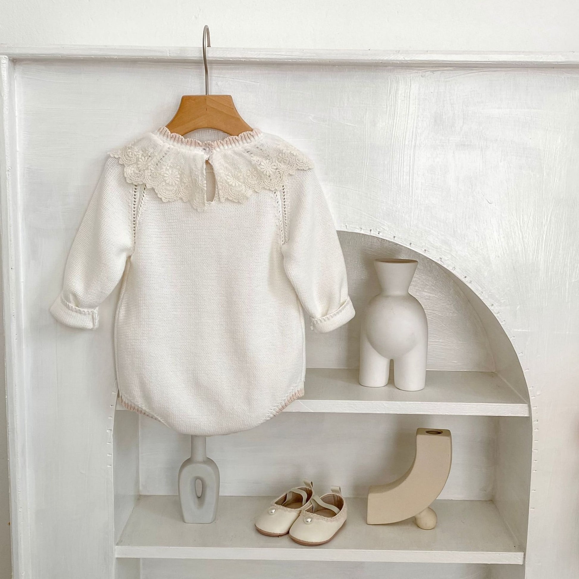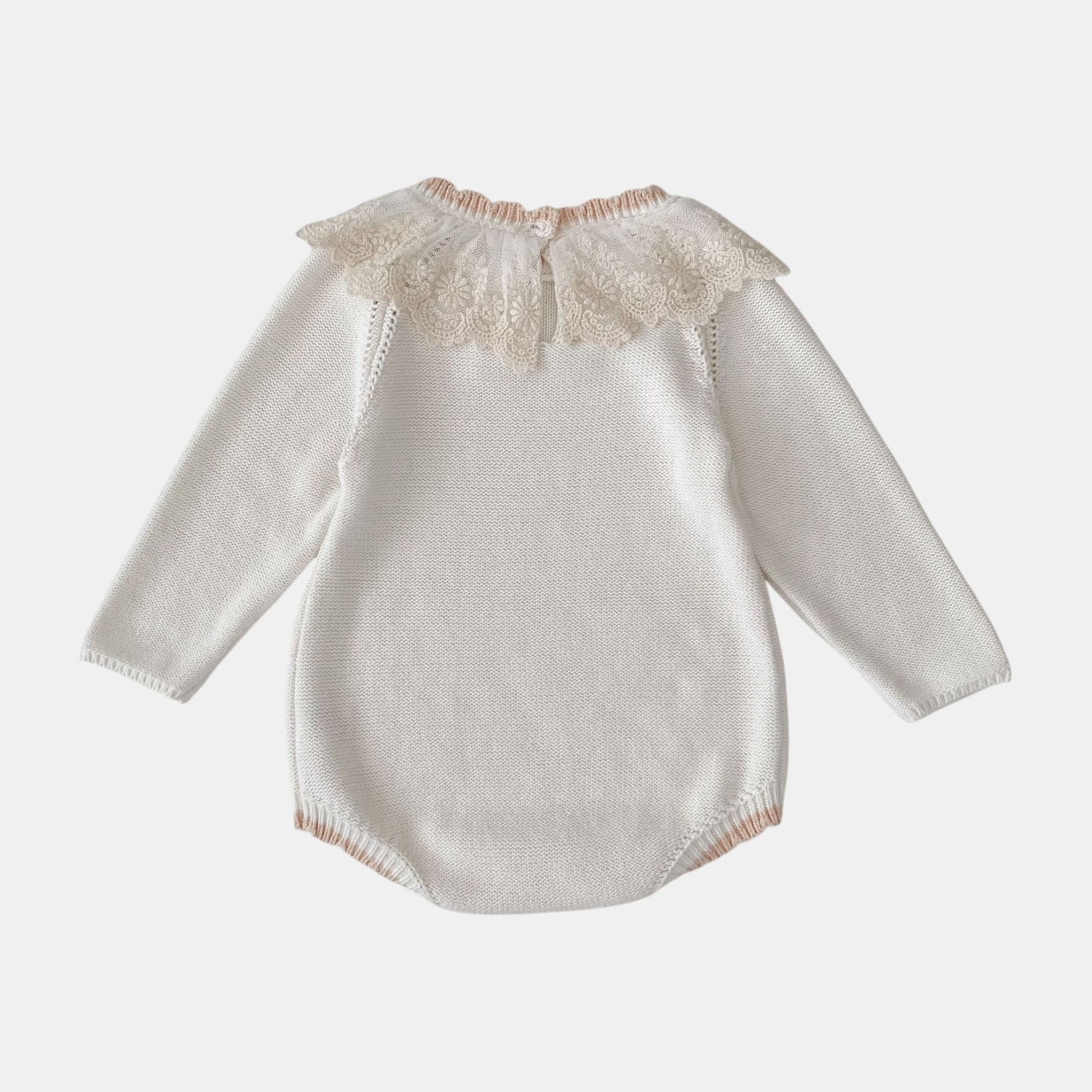 Soft and timeless, this ivory knit romper features a lace-detailed collar and scallop-edged contrast trim for a subtle touch of elegance. Long sleeves and convenient crotch buttons keep it practical, making it a lovely choice for both everyday wear and dressier moments.