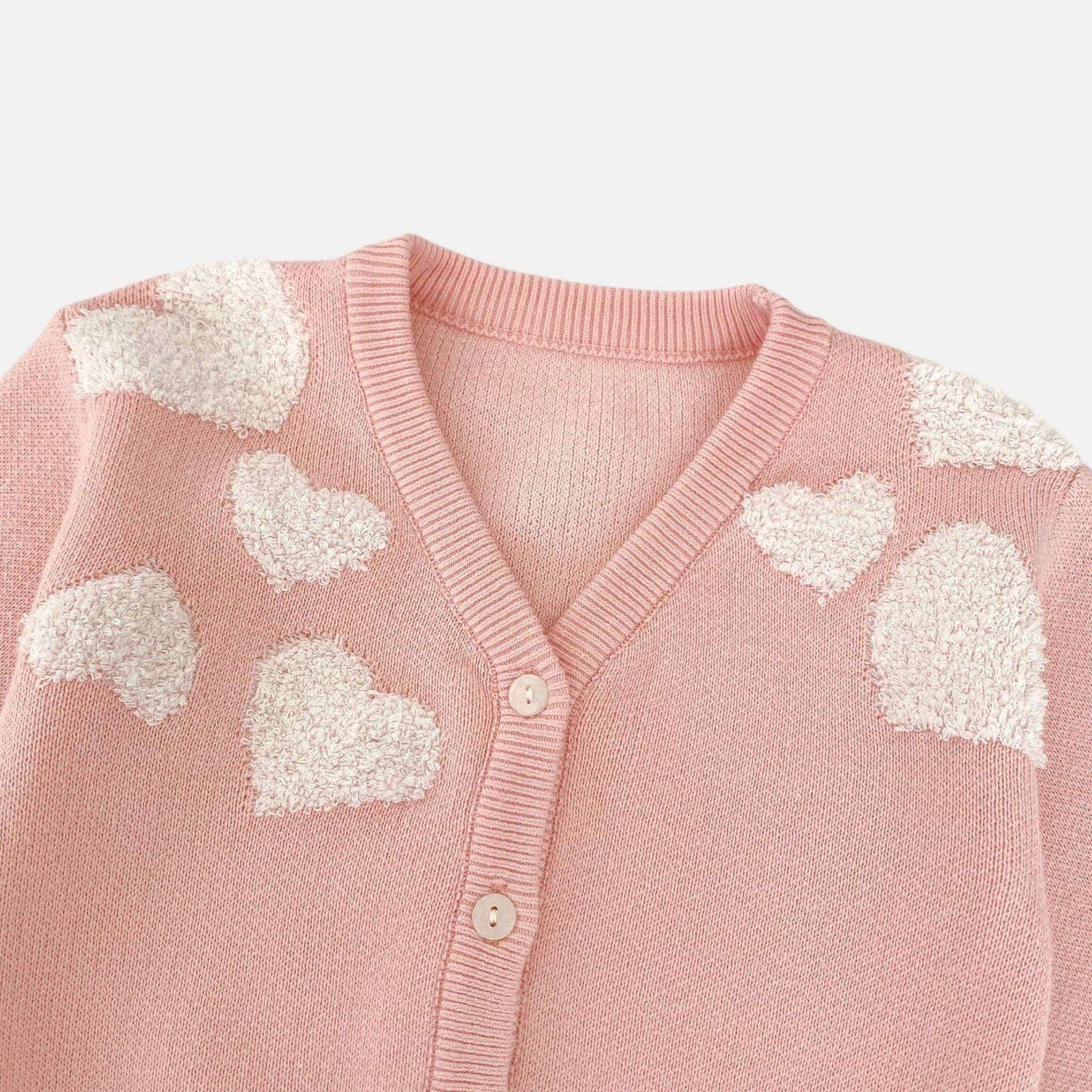 A delicate blush-pink cardigan adorned with subtle white heart motifs at the yoke, offering a touch of playfulness. Made in soft cotton knit, it drapes beautifully over tea dresses or pairs effortlessly with crisp pinafores. Ideal for adding a touch of quiet charm to everyday moments and special occasions alike.