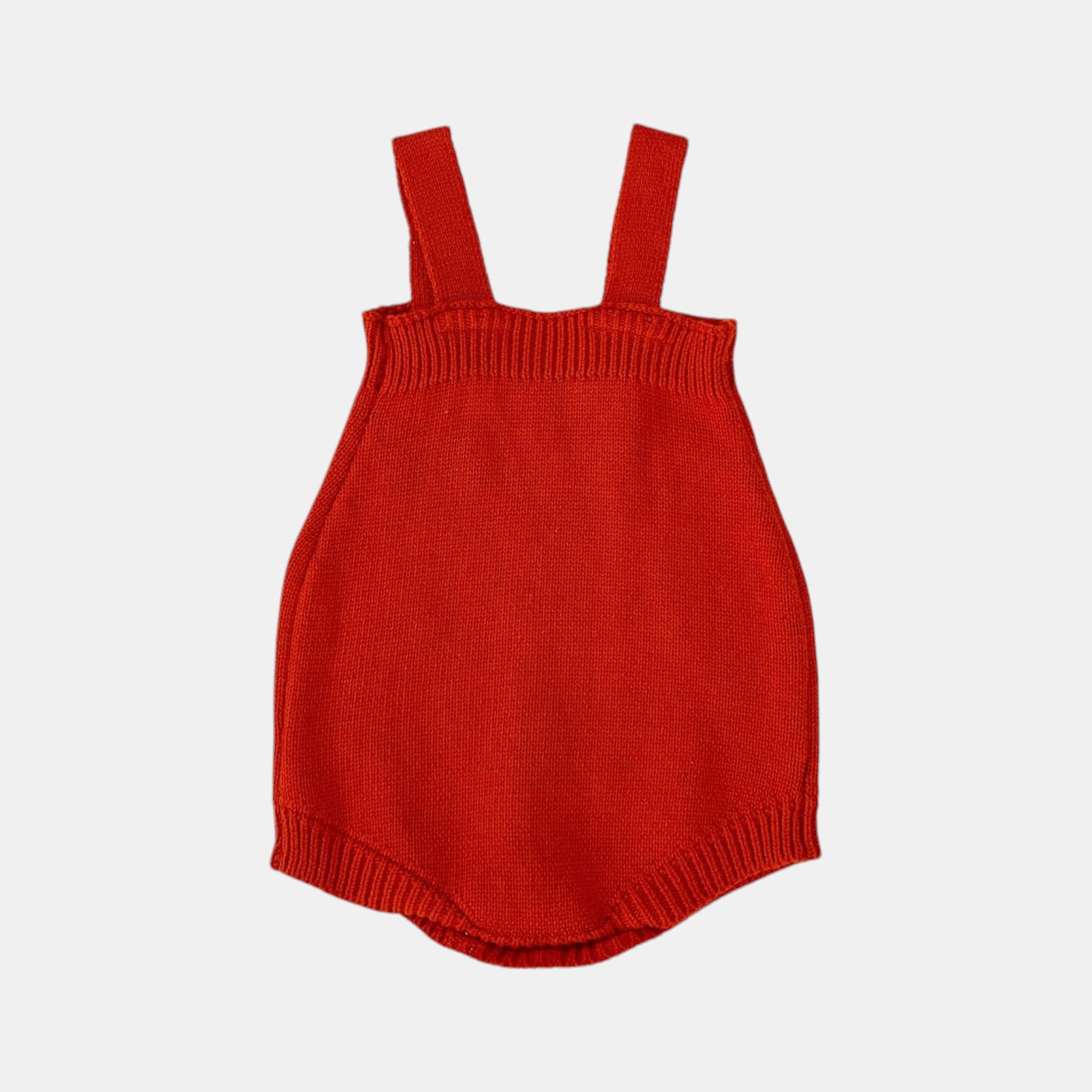 A red cotton knit romper embroidered with sweet hearts and dainty florals, with button fastenings making changes as easy as playtime. Pair with the coordinating cardigan for family photos or let it shine alone with bare knees and sandals. The kind of piece that looks even better after a day of cuddles and crawling adventures.