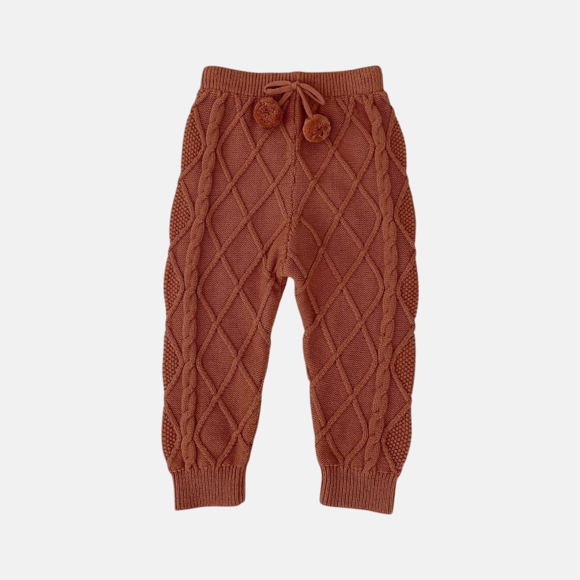 Rich chestnut trousers with a diamond lattice knit – the kind that pairs just as well with Sunday-best smocks as with well-loved play tees. The soft cotton moves with them during playground races, while the waistline pom-pom adds a wink of whimsy. Made for building blanket forts and crunching through leaves – warmth and texture, without the bulk.