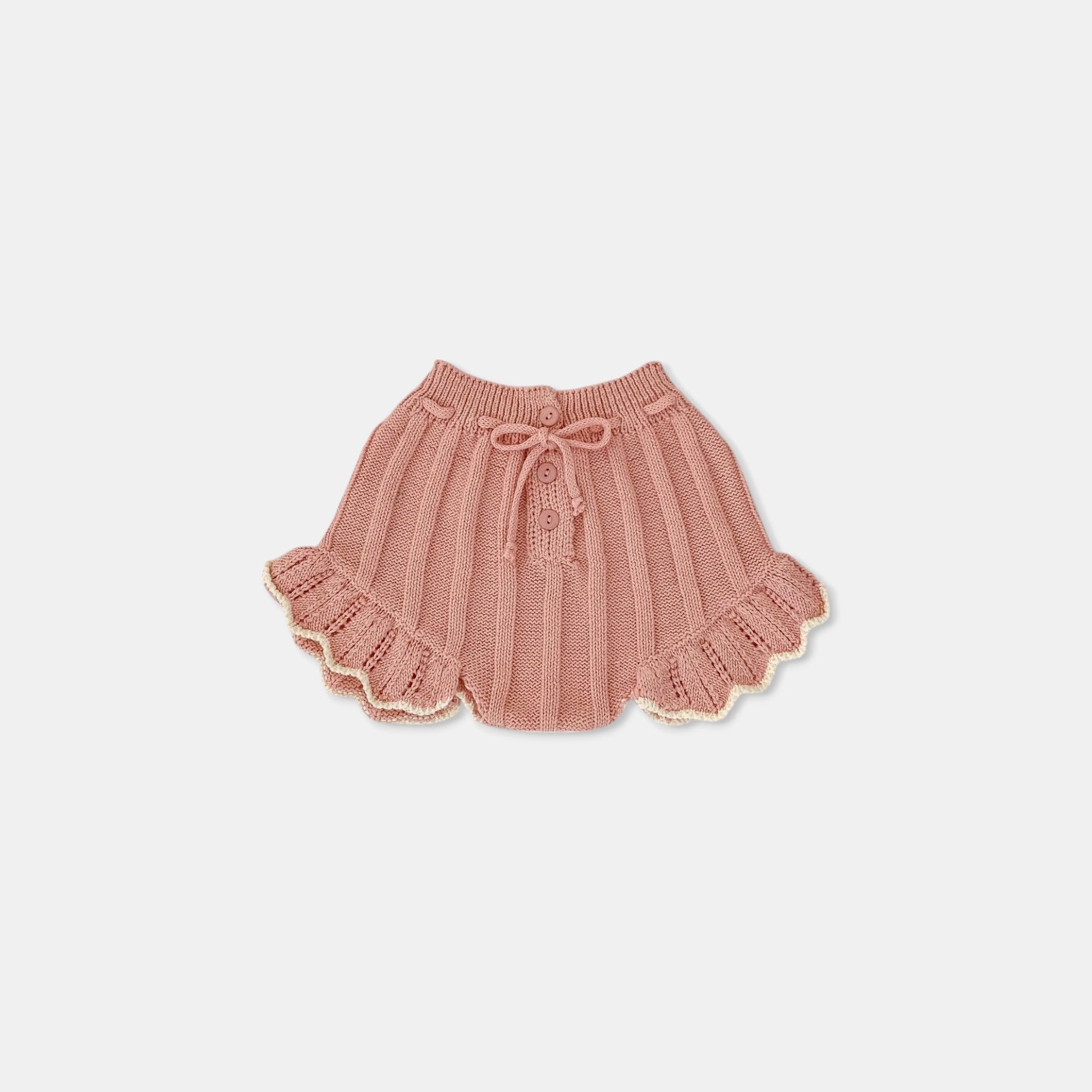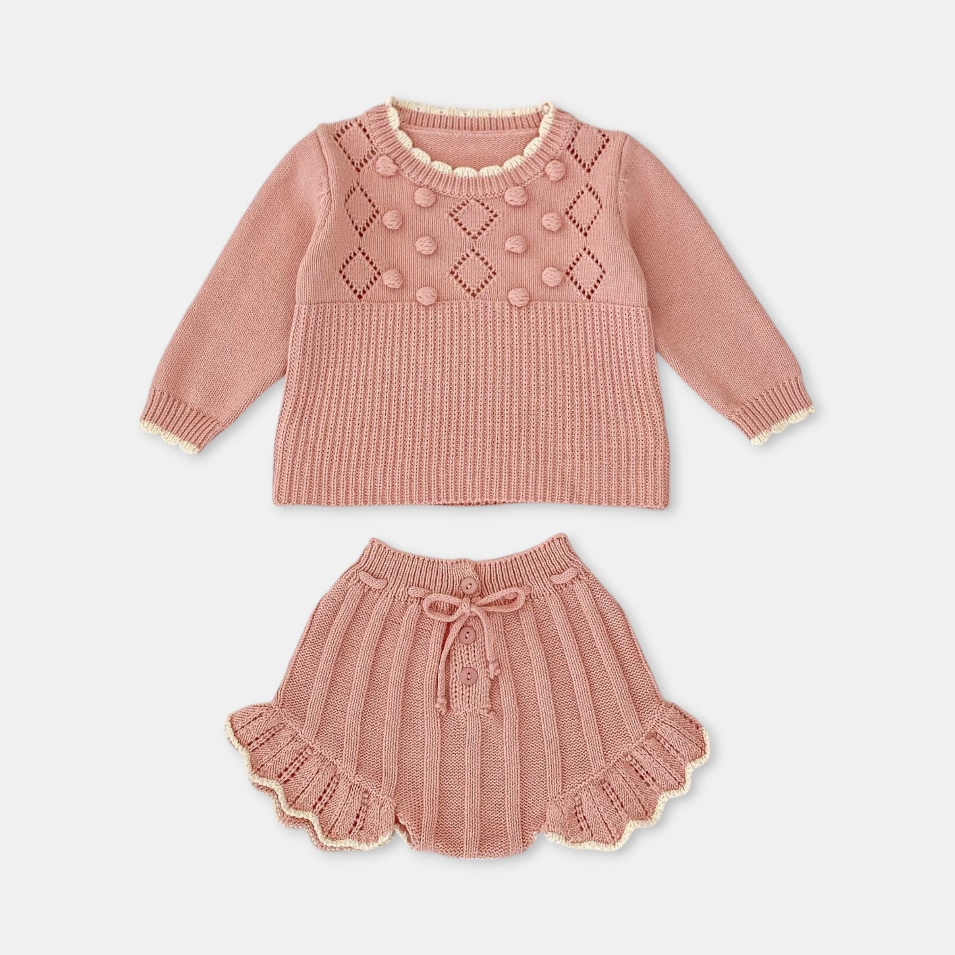 A dreamy pink cotton set that pairs a sweater with delightful pom-poms and an airy diamond-knit pattern. The ivory scalloped neckline and ruffled bloomers add a touch of vintage sweetness, perfect for both playtime and portraits. Lightweight yet cosy, it’s an outfit designed for making memories—soft on skin and easy to love.