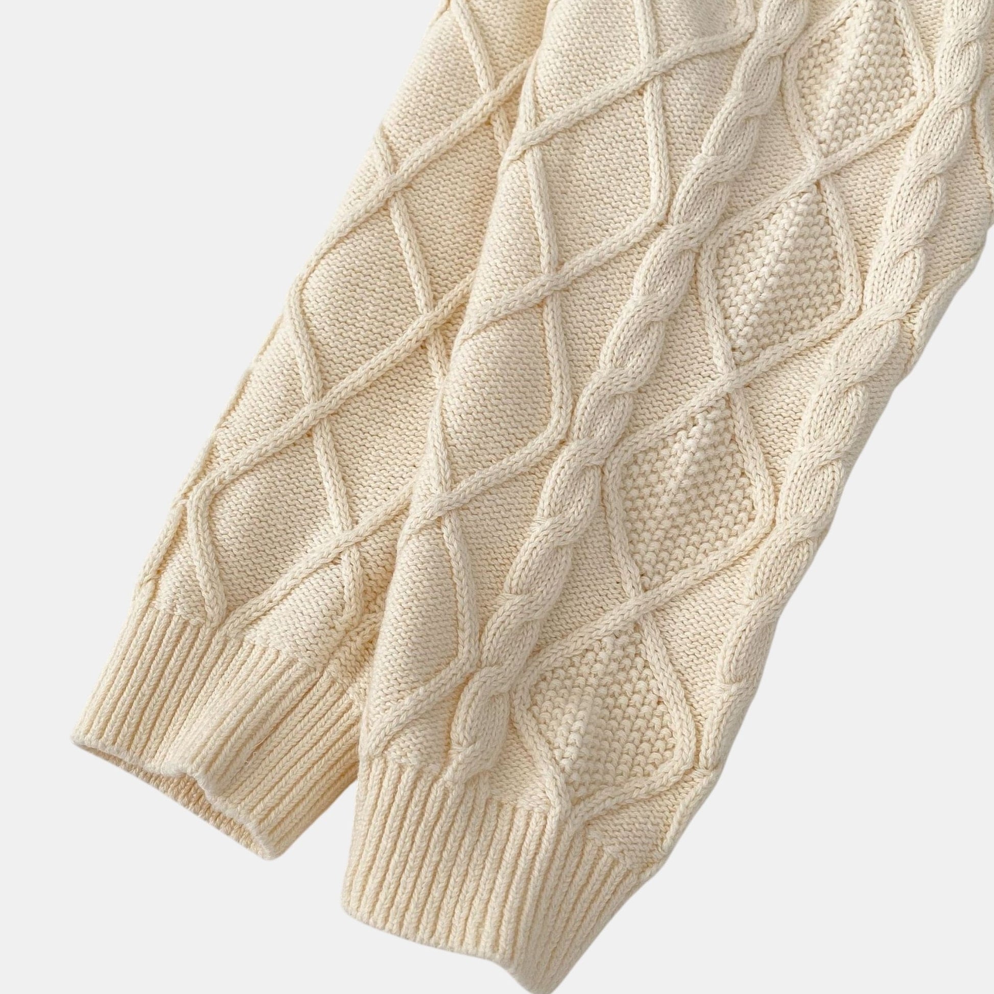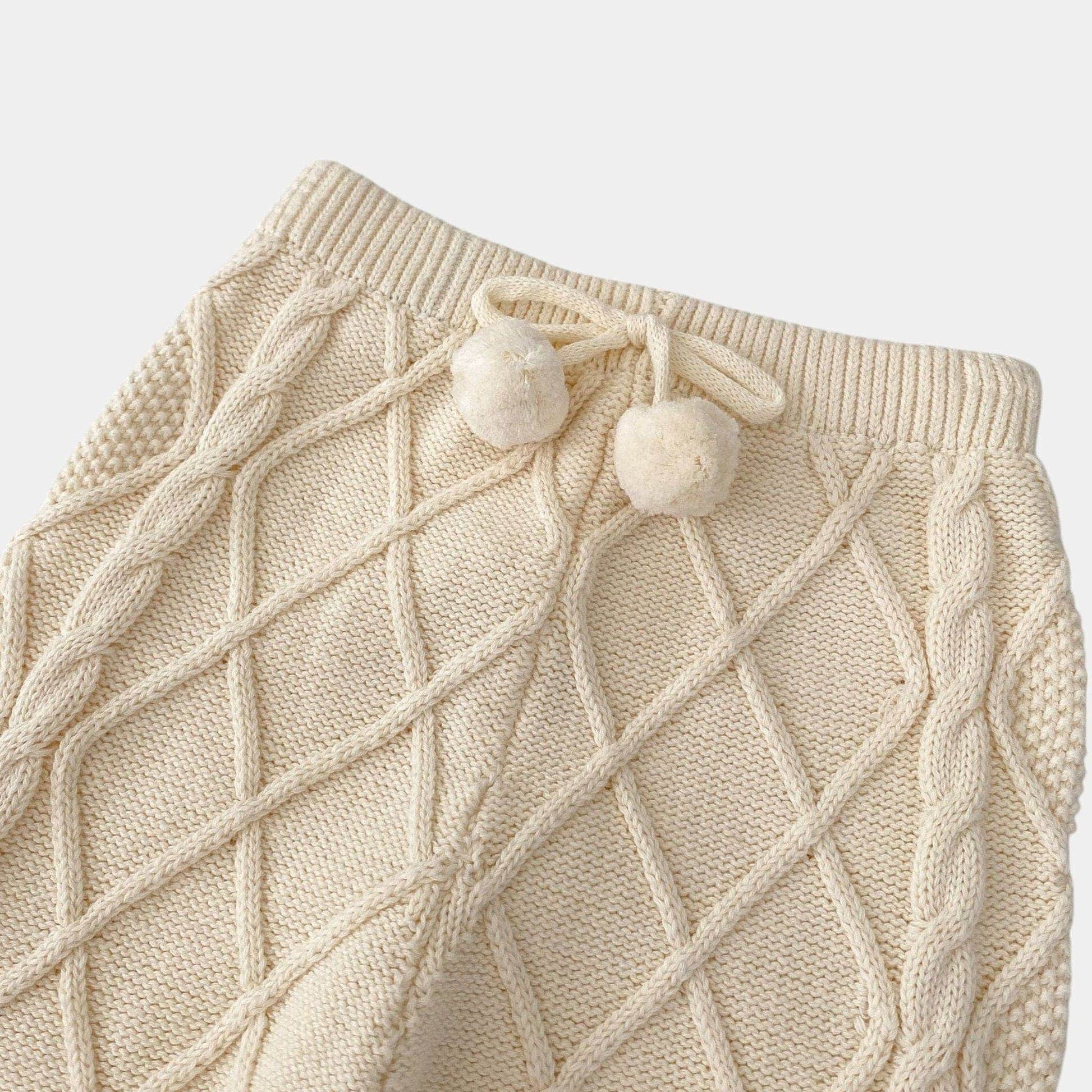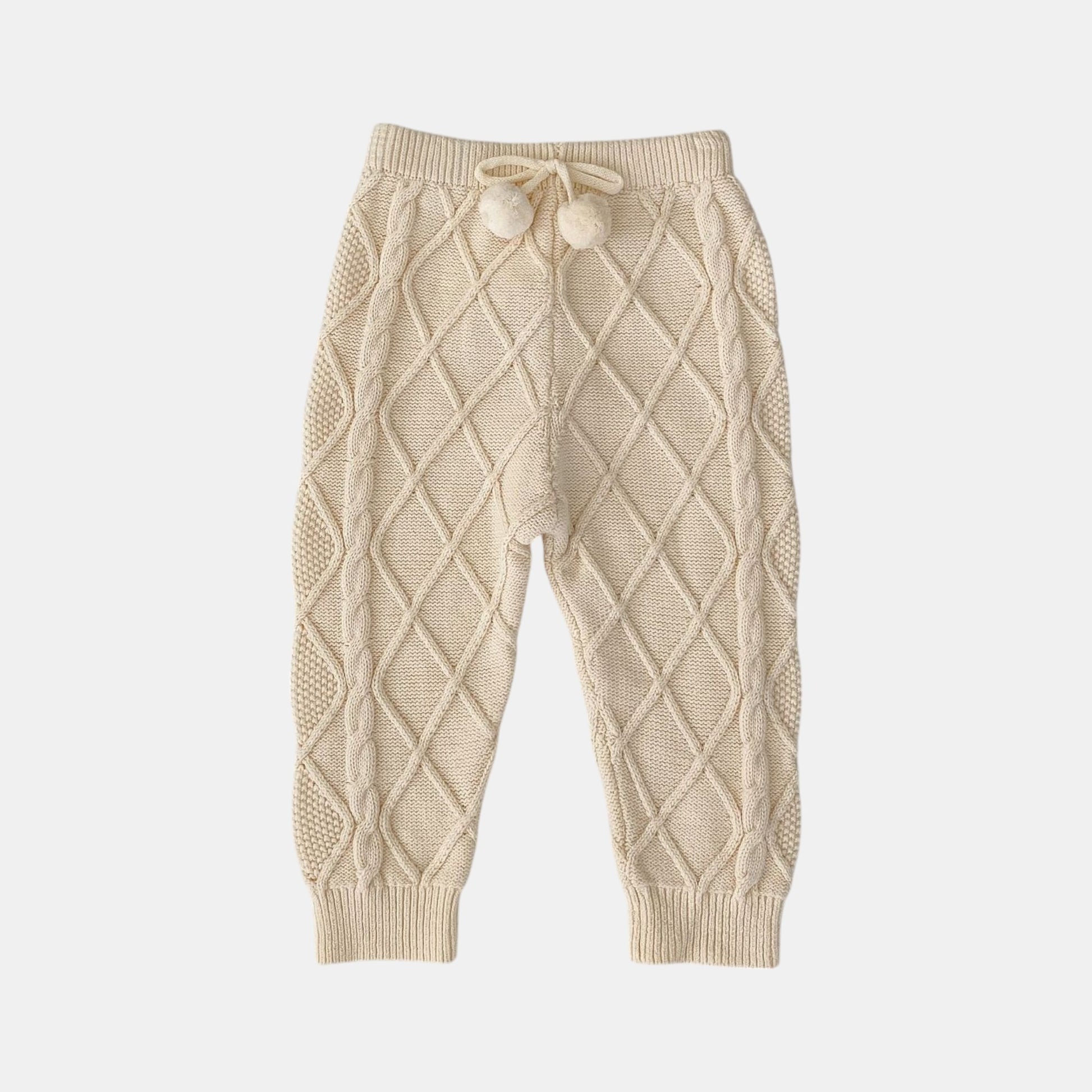 Cream cotton-knit trousers with a diamond lattice pattern and playful pom-pom waist. The breathable fabric and relaxed fit ensure comfort for everyday adventures. Pair with chunky cardigans for weekend walks or smocked tops for celebratory lunches. An understated staple with a touch of charm.