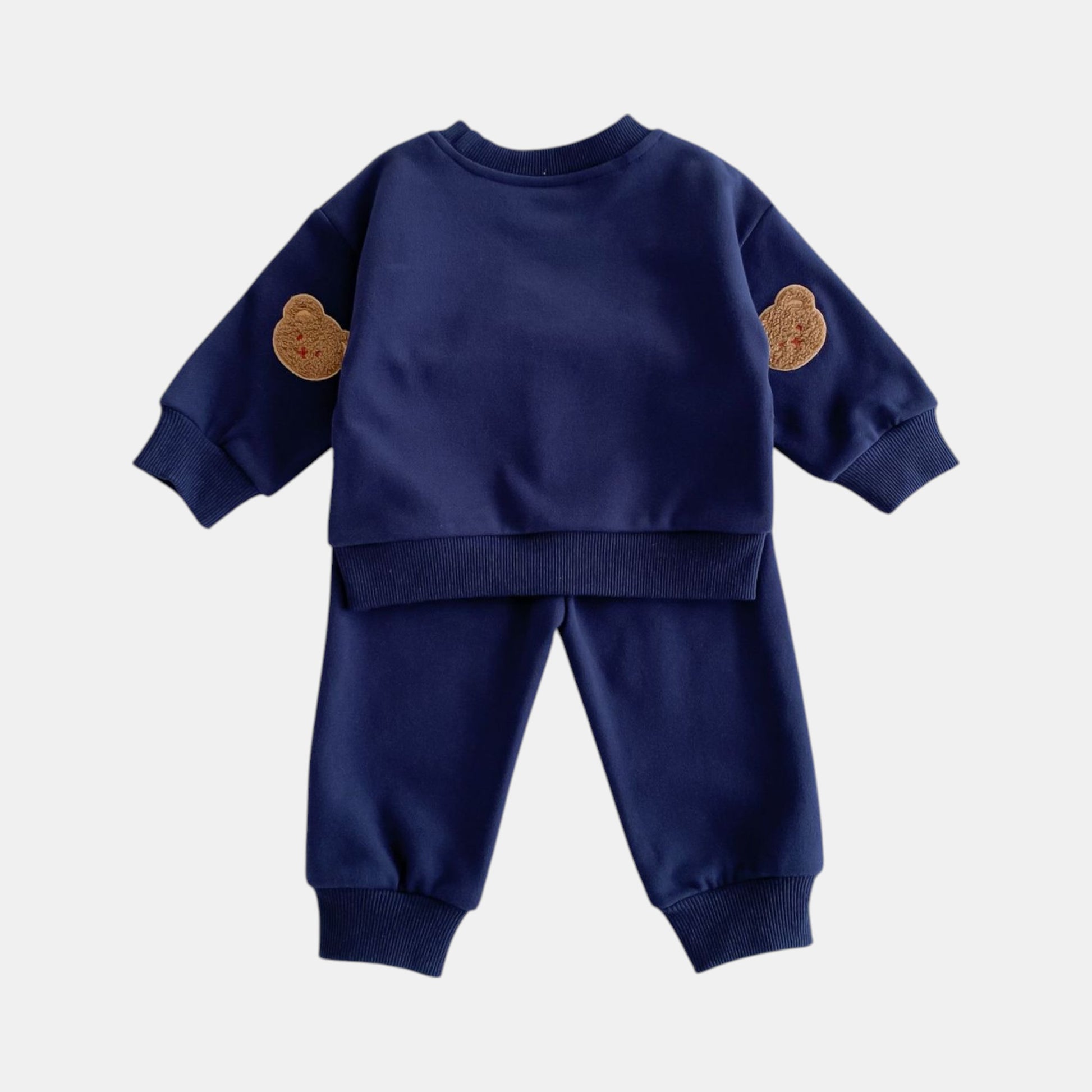 Rich navy cotton makes a perfect backdrop for the endearing brown bear appliqués featured on the chest and elbows. Designed for all-day comfort with elasticated finishes, this two-piece set is equal parts playful and practical—a lovely addition to any little wardrobe.