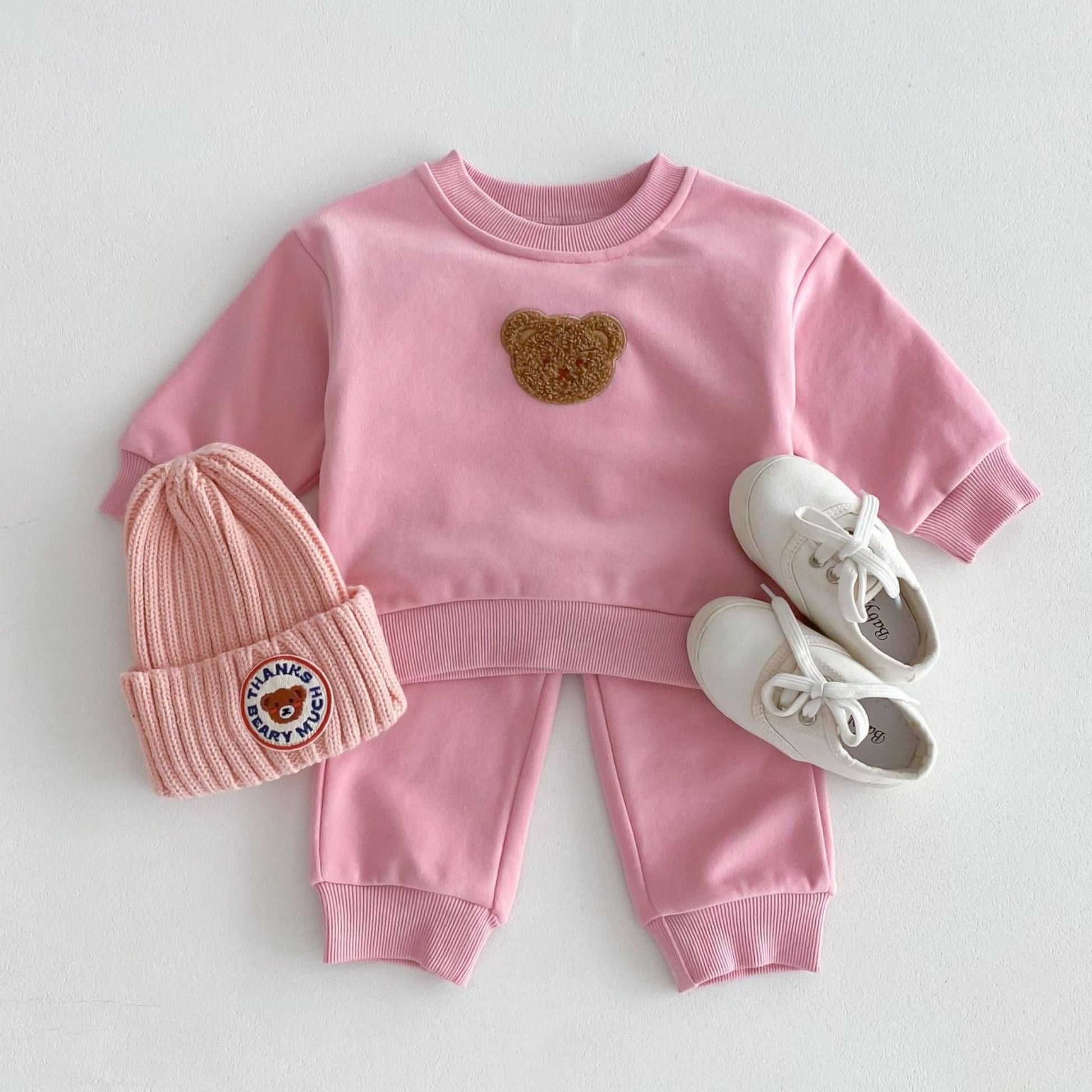 In a dreamy pink hue, this cotton lounge set brings a gentle warmth to everyday comfort. A cuddly bear appliqué sits at the chest, with matching little bear faces at each elbow—subtle details that make a big impression. Soft, breathable, and finished with elasticated trims, it’s made for little ones who love to snuggle and play.