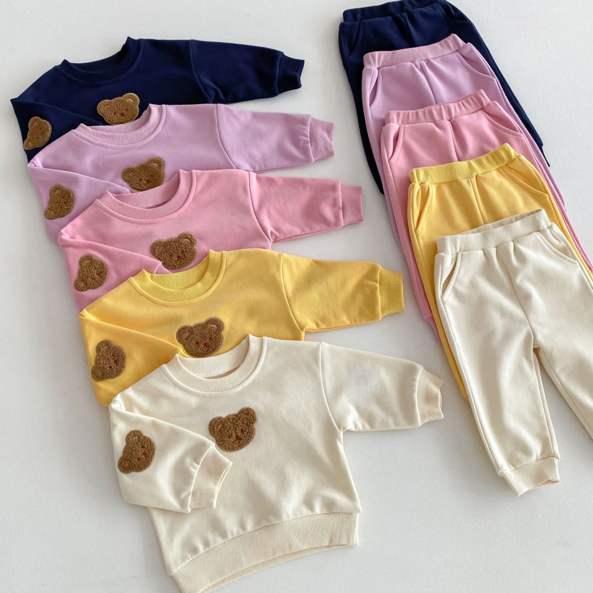 A soothing lilac cotton lounge set with an adorable brown bear appliqué on the chest and matching elbow details for playful charm. The relaxed sweater and elastic-waist joggers are crafted in breathable cotton, perfect for snuggles and playtime alike. Designed for comfort with a whisper of whimsy—ideal for slow mornings and everyday adventures.