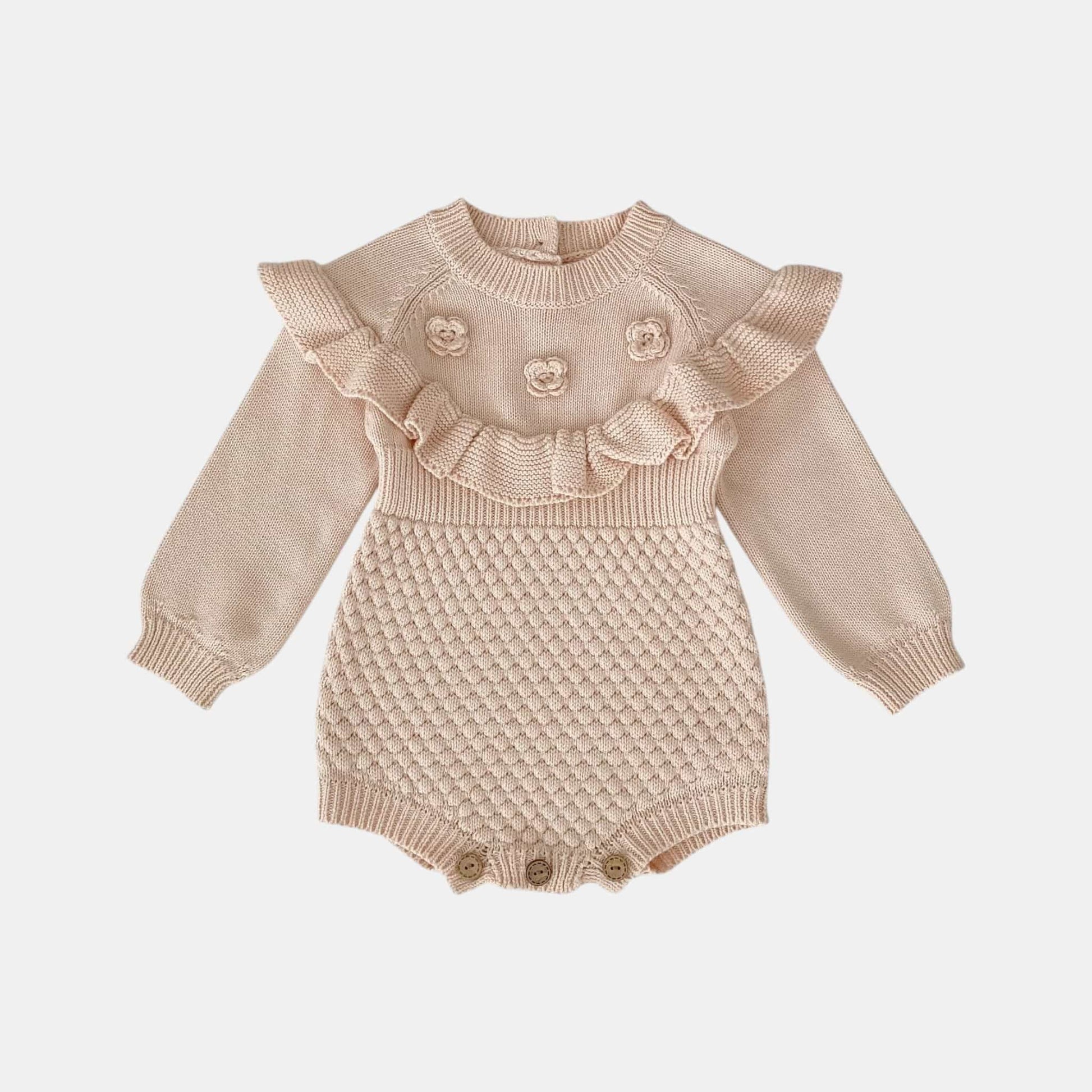 This blush cotton knit romper combines texture and charm with a raised knit pattern, ruffle detail on the chest, and delicate 3D roses. Long sleeves keep little ones cosy, and crotch buttons make changing simple. Perfect for morning cuddles, exploring the garden, or a relaxed afternoon with family.