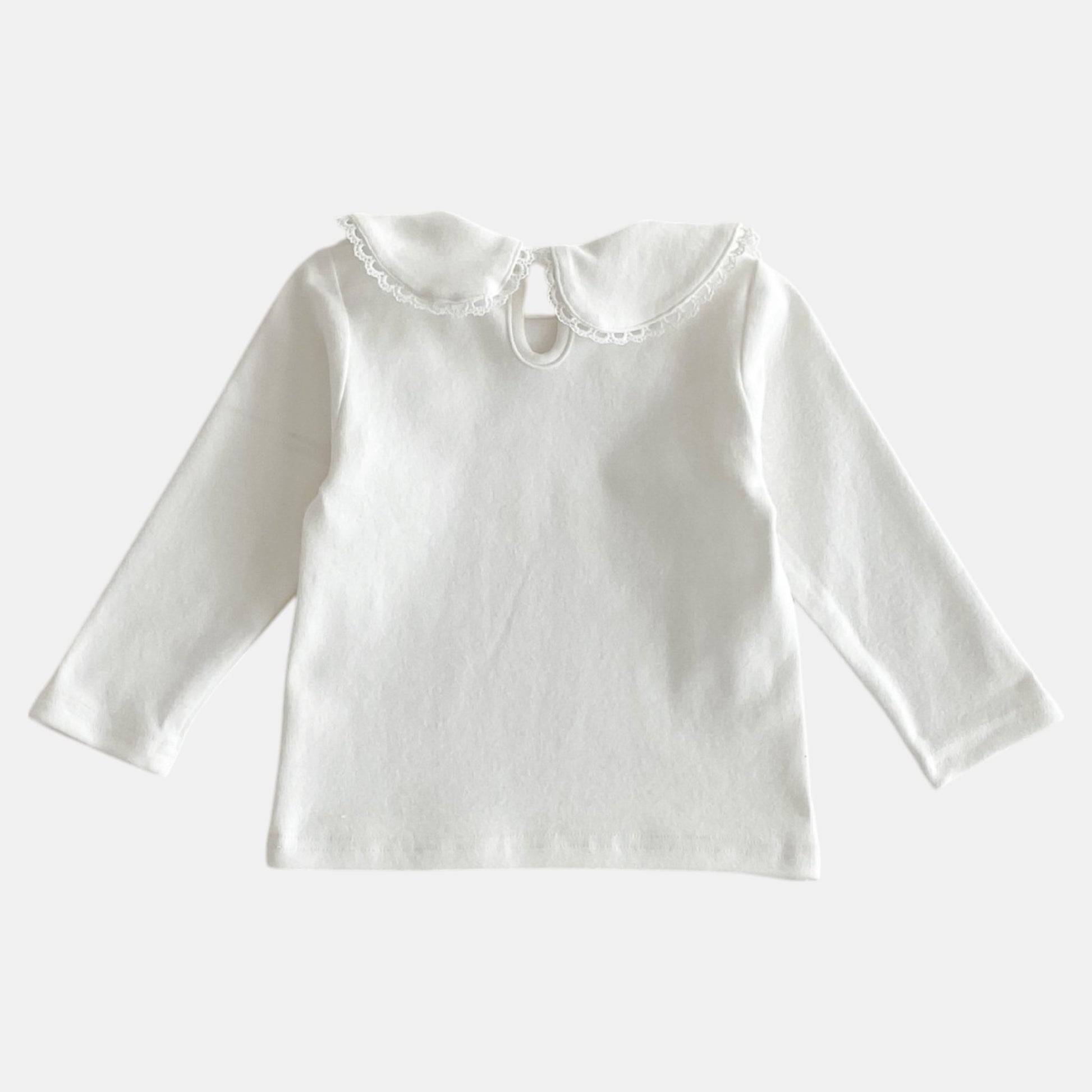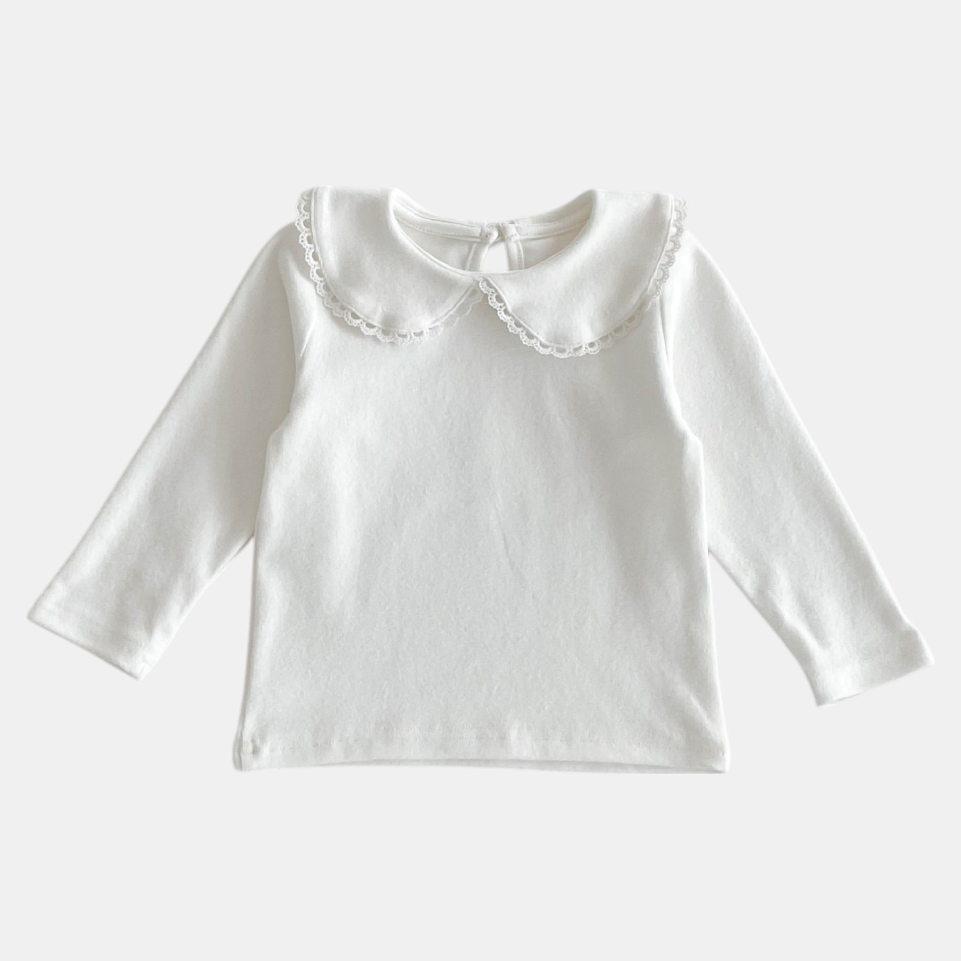 An ivory cotton top with a delicate Peter Pan collar, edged in scalloped lace for understated charm. The hint of stretch moves with them, whether they're twirling in skirts or building block towers. Layer it under pinafores for tea parties or pair with jeans for everyday magic.