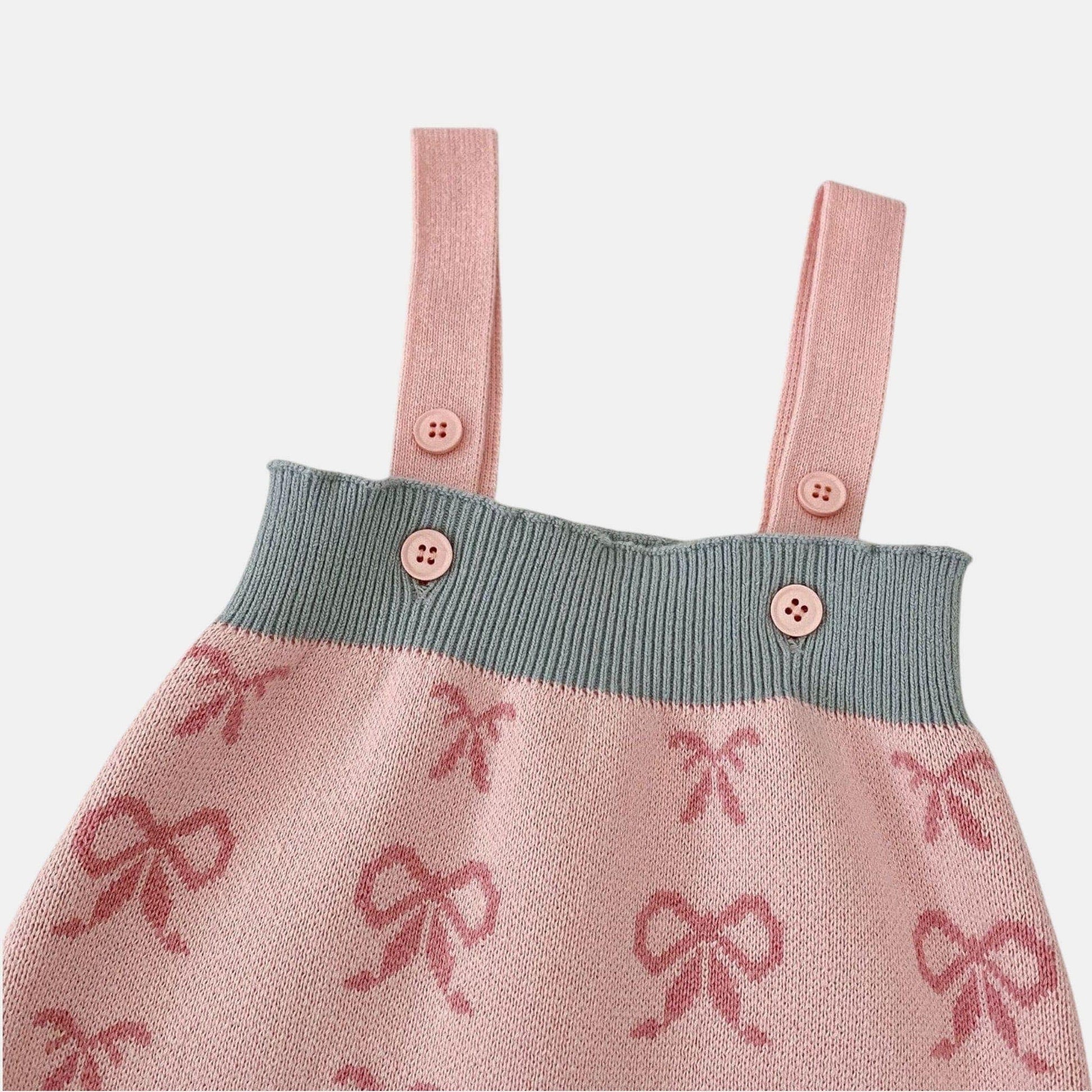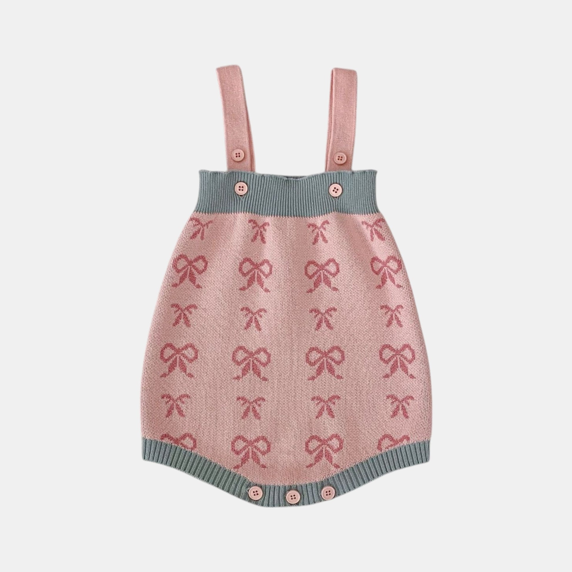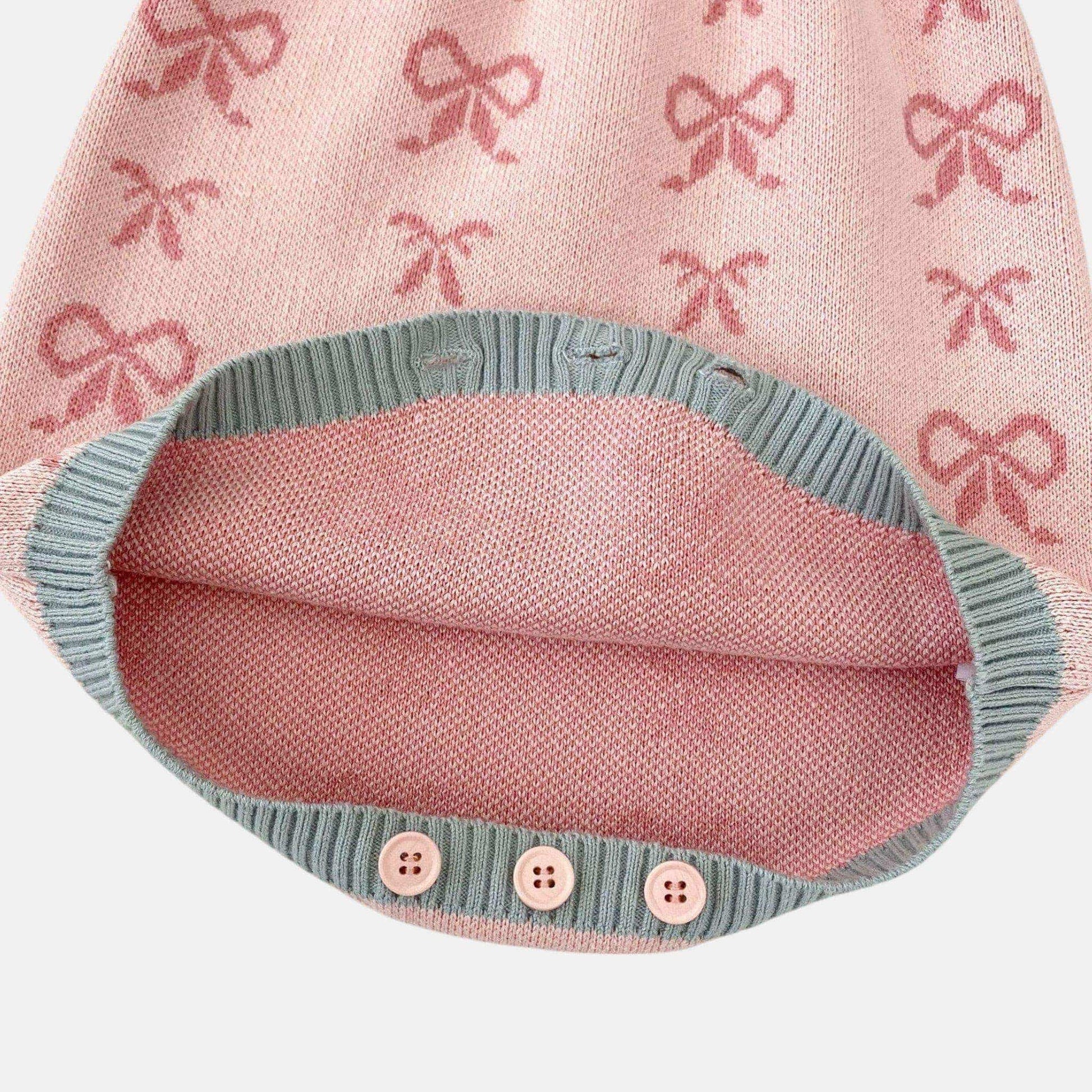 A pink jacquard cotton romper with delicate grey edging and playful bow motifs—easy to dress and even easier to love. The shoulder and crotch buttons make for quick changes, while the breathable fabric keeps little ones comfy. Wear it with the matching cardigan for sweet coordination, or layer it over a white bodysuit when you want the bows to take center stage. Perfect for garden picnics, pram strolls, and all the little adventures in between.