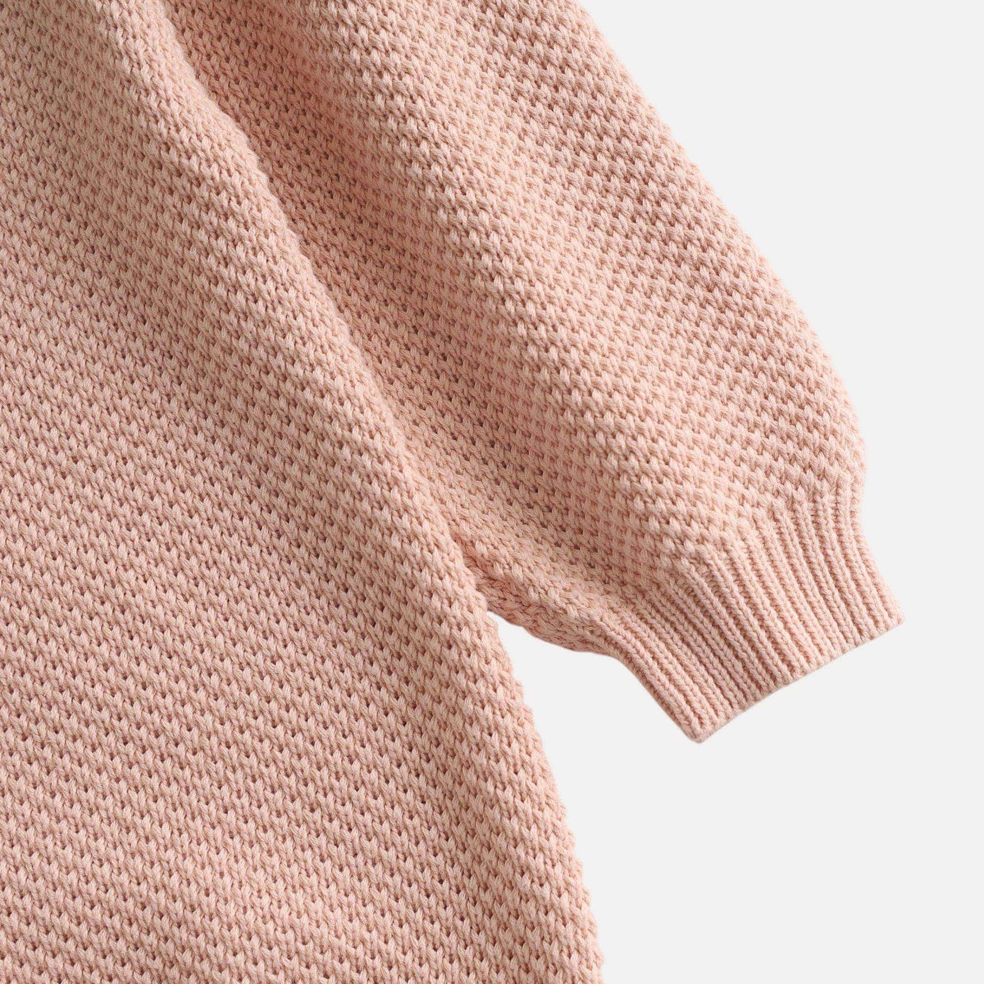 This soft pink knit romper features a classic polo collar with two buttons and convenient crotch buttons for easy dressing. Long sleeves keep little ones cosy, making it perfect for playtime, naptime, or layering under cardigans on cooler days.