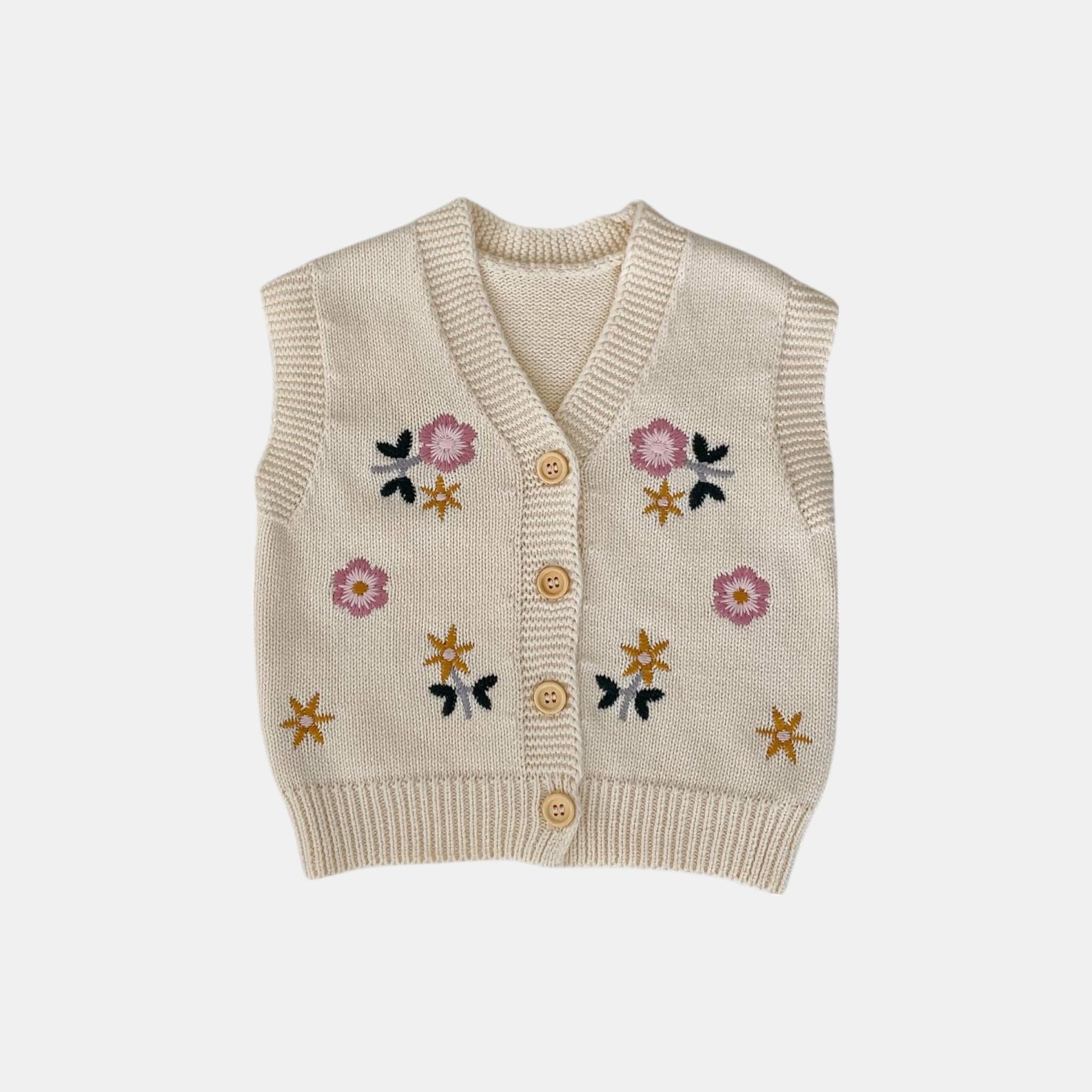 A timeless cotton knit vest with a delicate V-neck and sweet floral embroidery, perfect for layering. The breathable fabric and easy button-front make it ideal for playdates or special occasions. Pair it with the matching romper for a coordinated look, or wear it solo for effortless everyday charm.