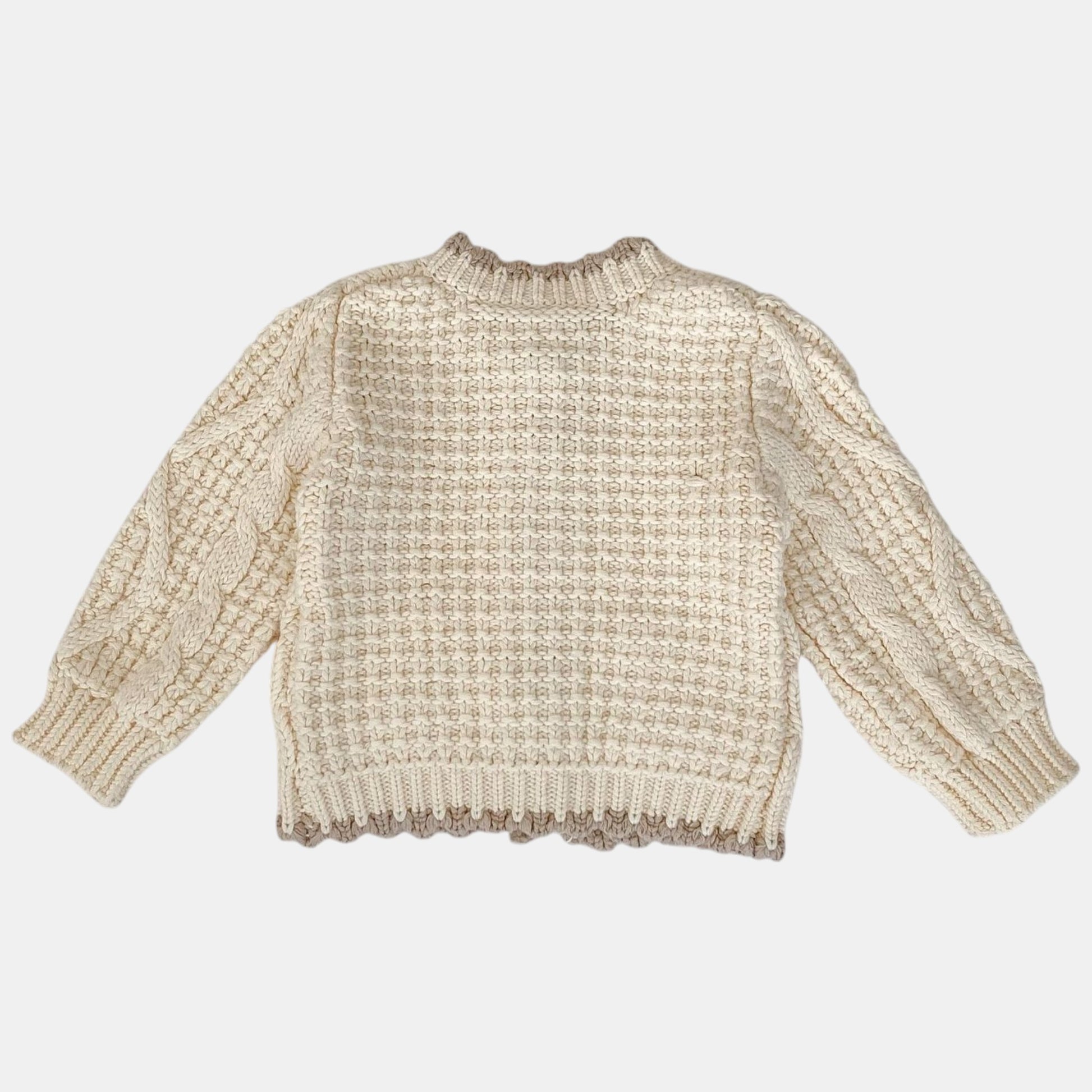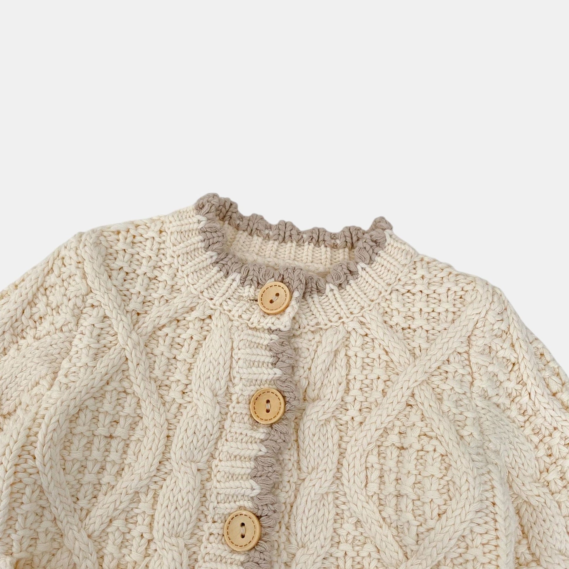 A cream cotton cardigan with classic braid detailing and taupe scallop trim—soft, timeless, and easy to layer. The button-front design and practical pockets add everyday functionality, while the unisex cut works for school runs, weekend walks, or chilly playground adventures.
