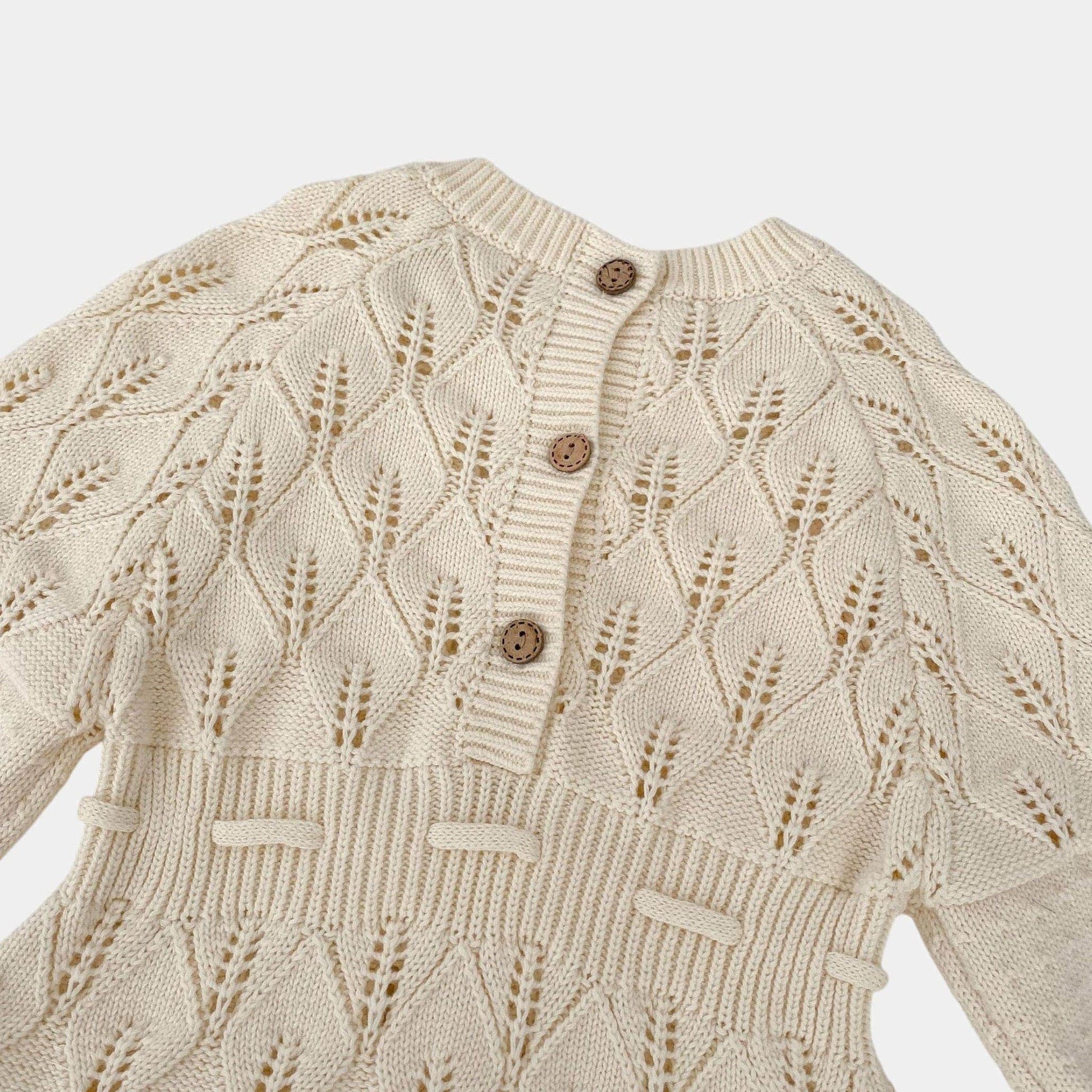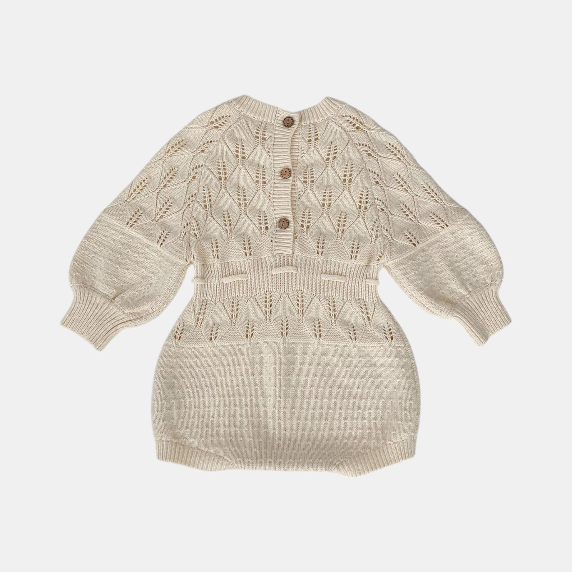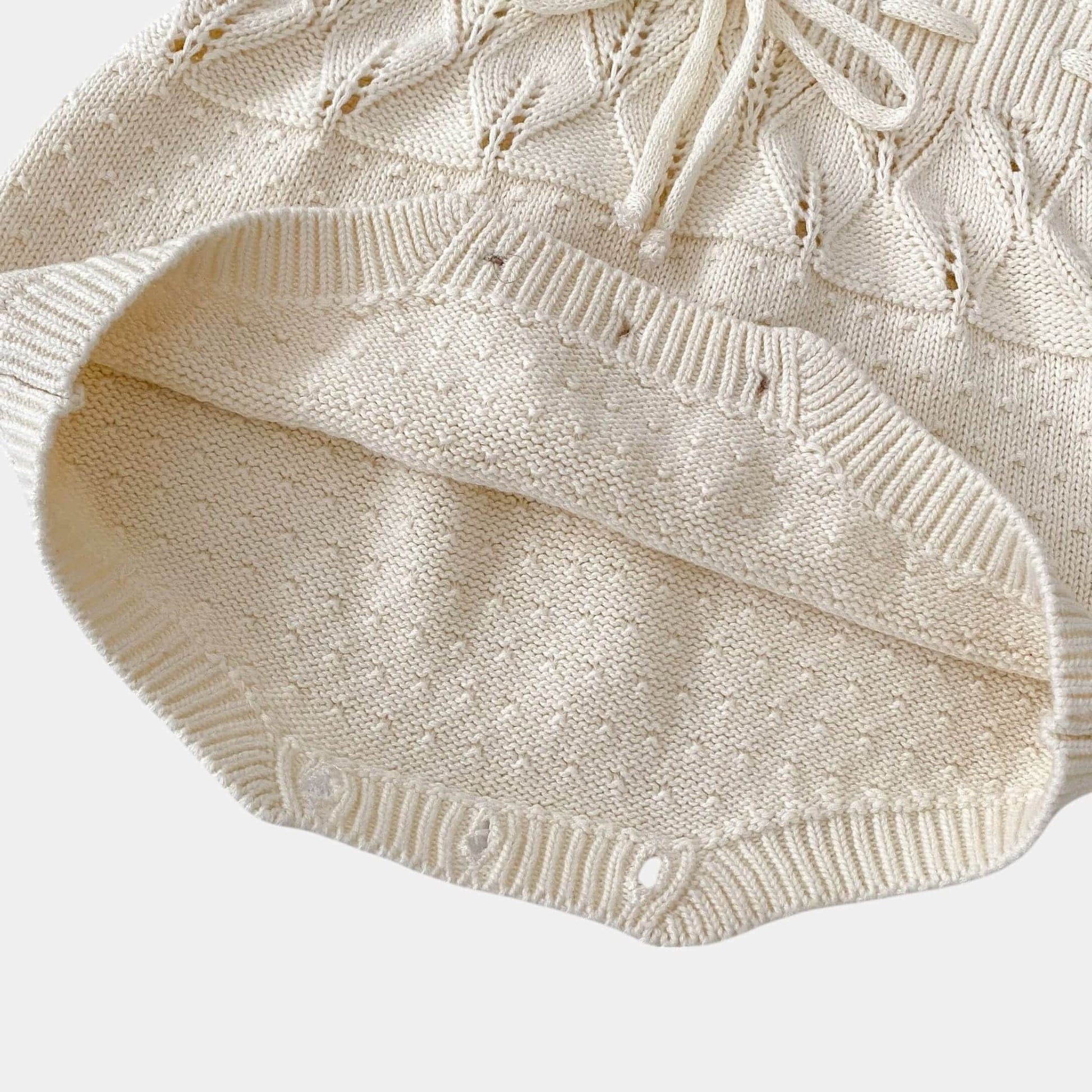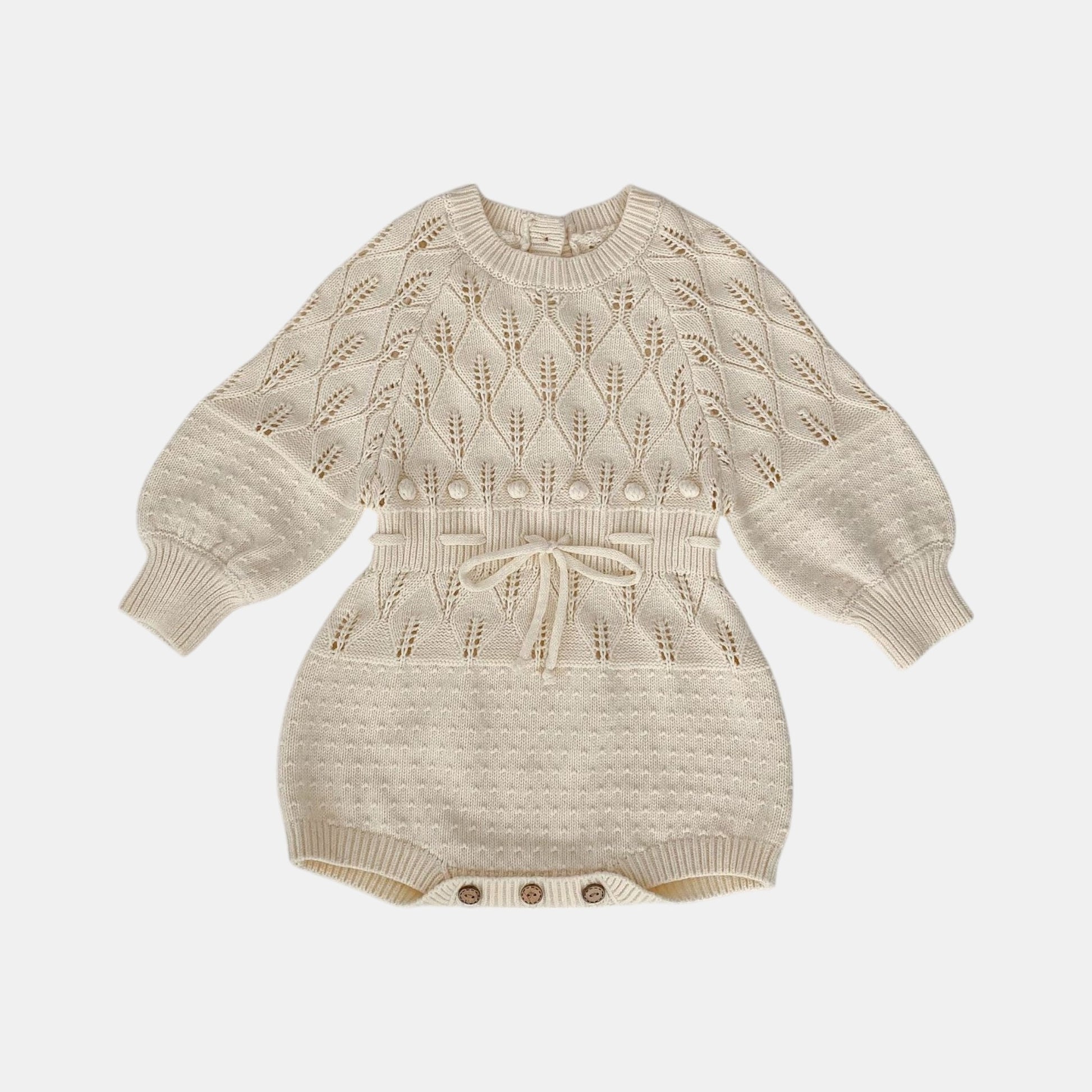 A cream cotton pointelle romper with long sleeves and subtle texture, finished with handmade fabric balls and a self-tie waist bow for sweet detail. The button-front crotch ensures easy dressing, while the breathable knit keeps them comfortable from morning play to naptime. Style with knit booties for a cosy look or a linen sunhat for garden adventures.