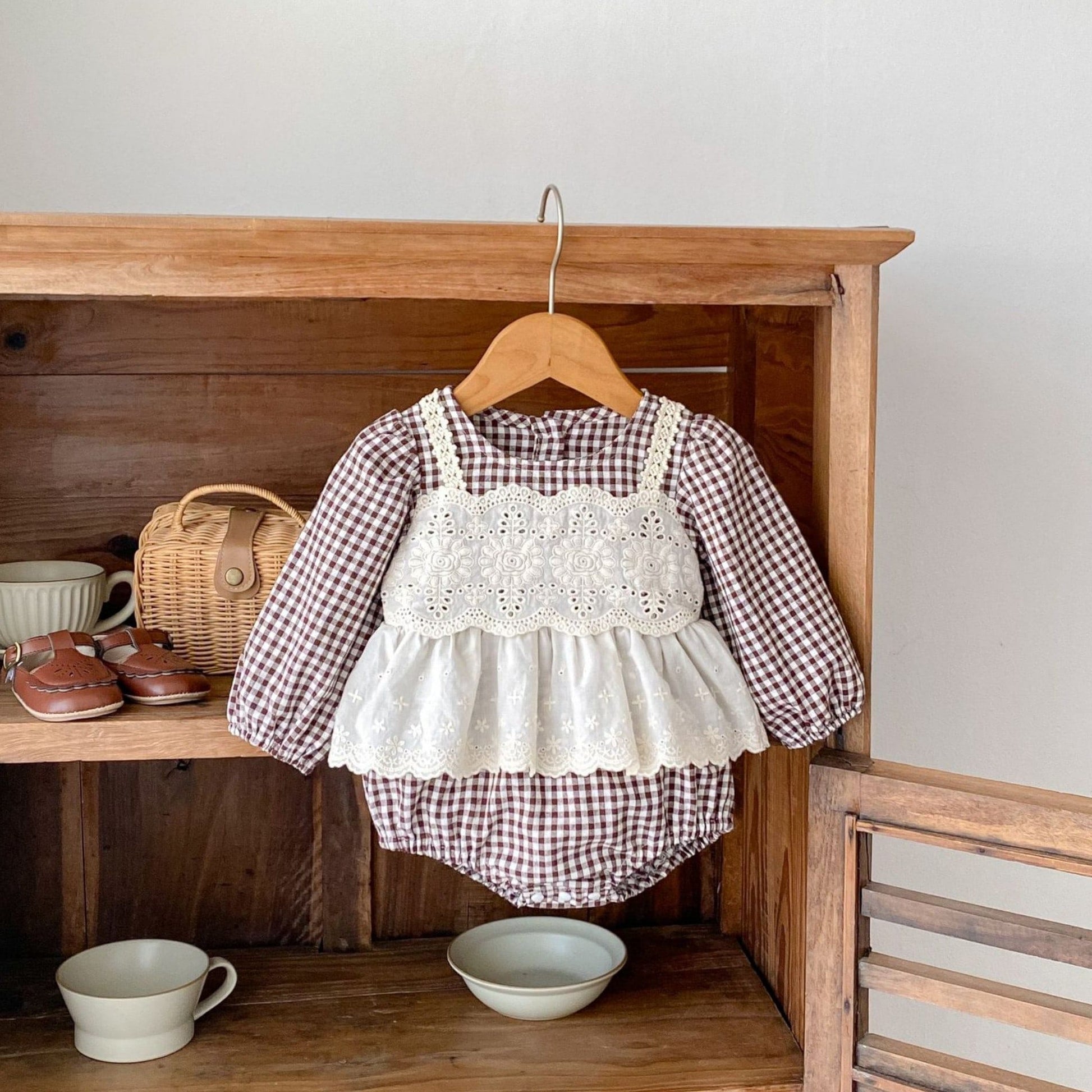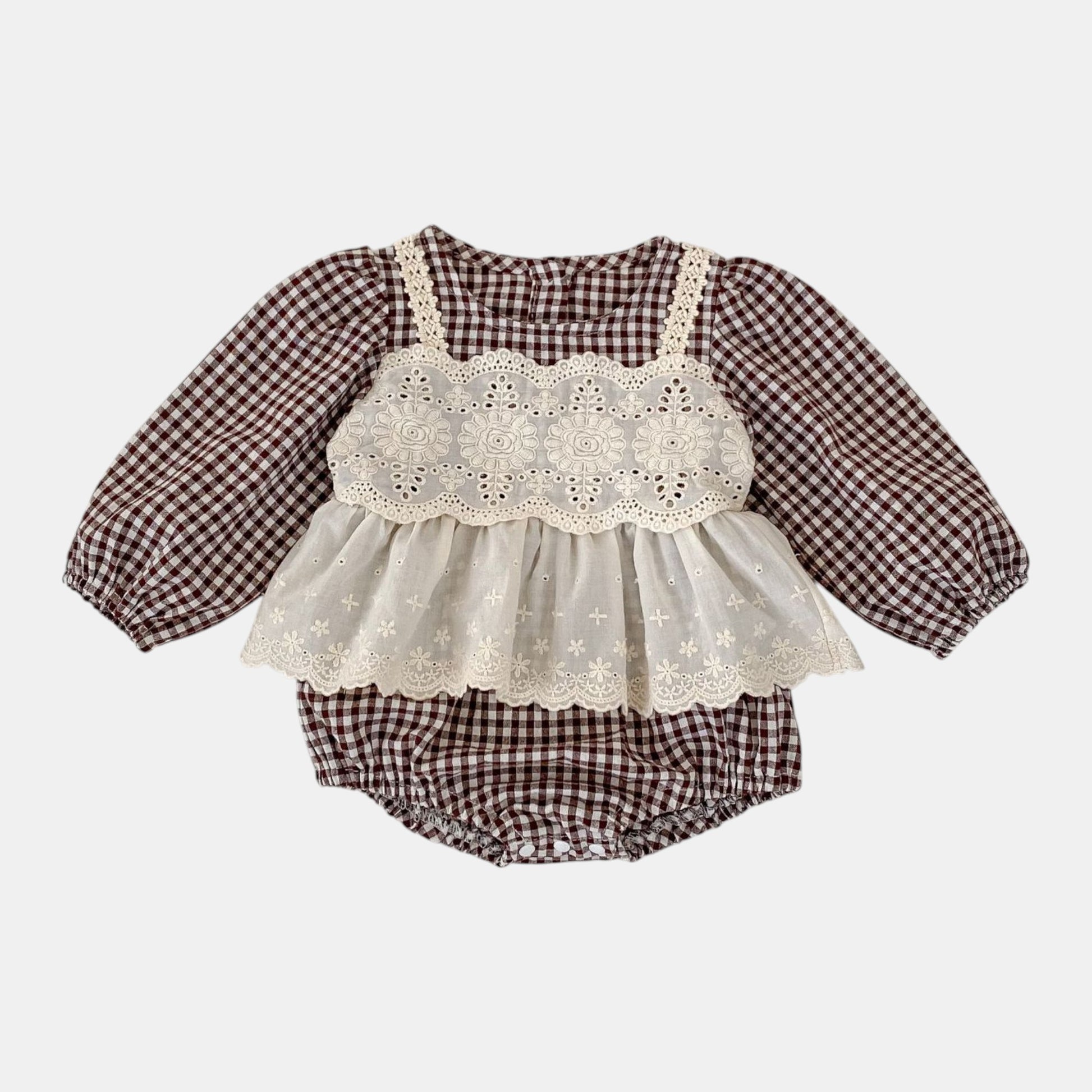 Erin Gingham Lace Romper - Brown (3m-24m)