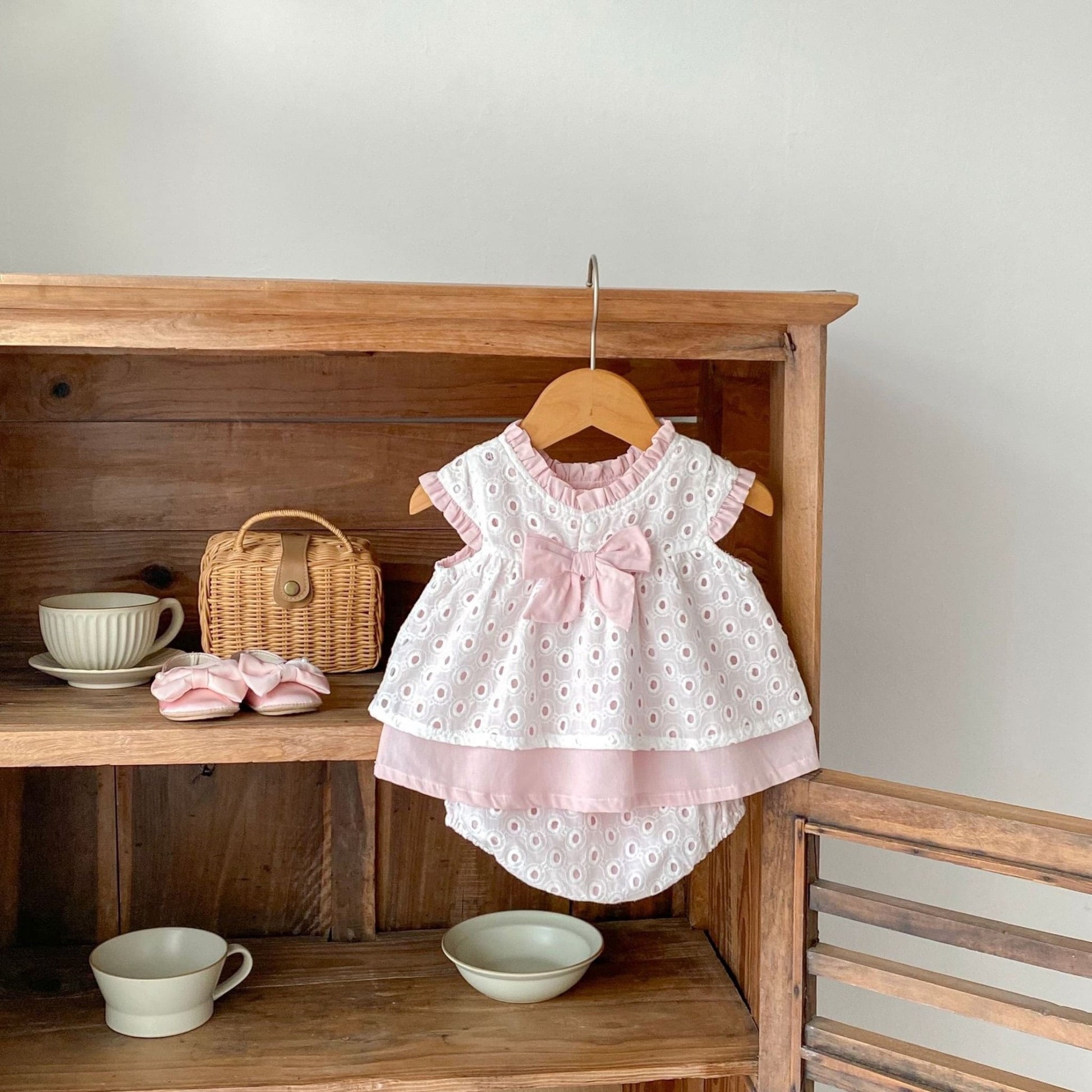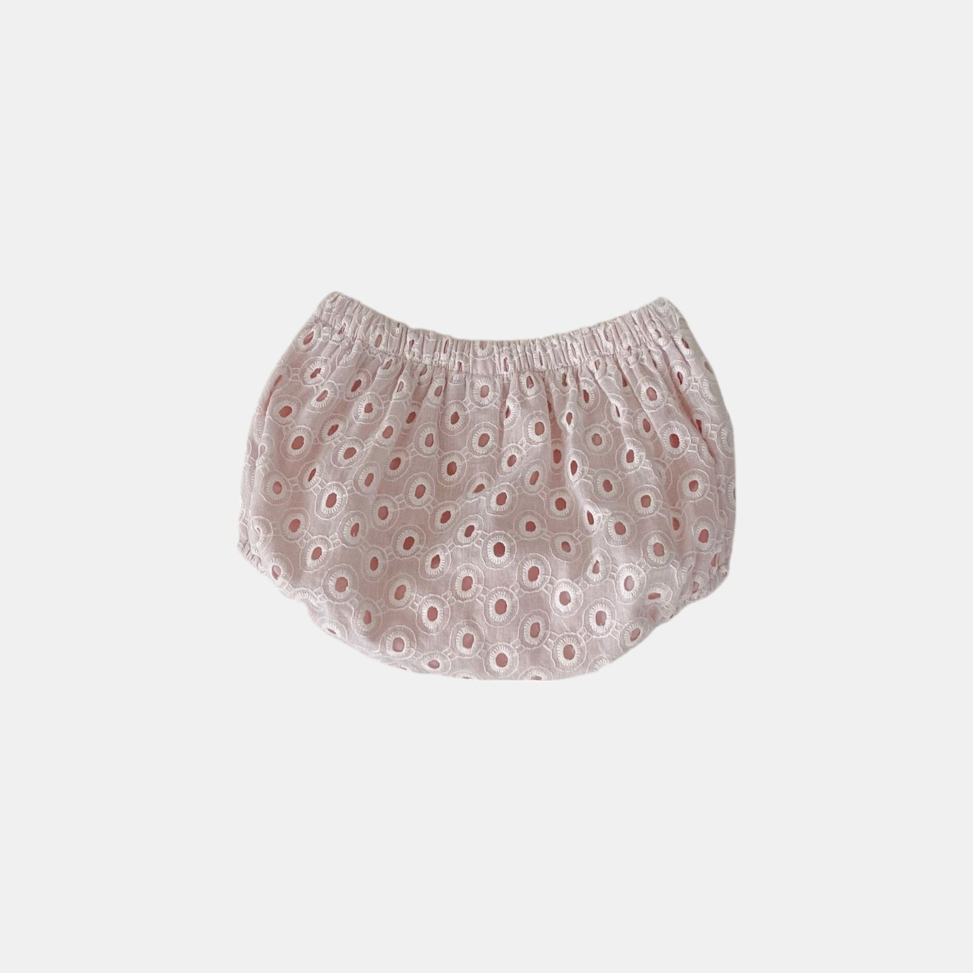 A delicate blush pink cotton set featuring a sleeveless eyelet lace top with a dainty back bow, paired with elasticated bloomers for easy movement. The breathable fabric and airy design make it ideal for warm summer days, whether for garden parties or seaside strolls. Sweetly simple and effortlessly fresh.