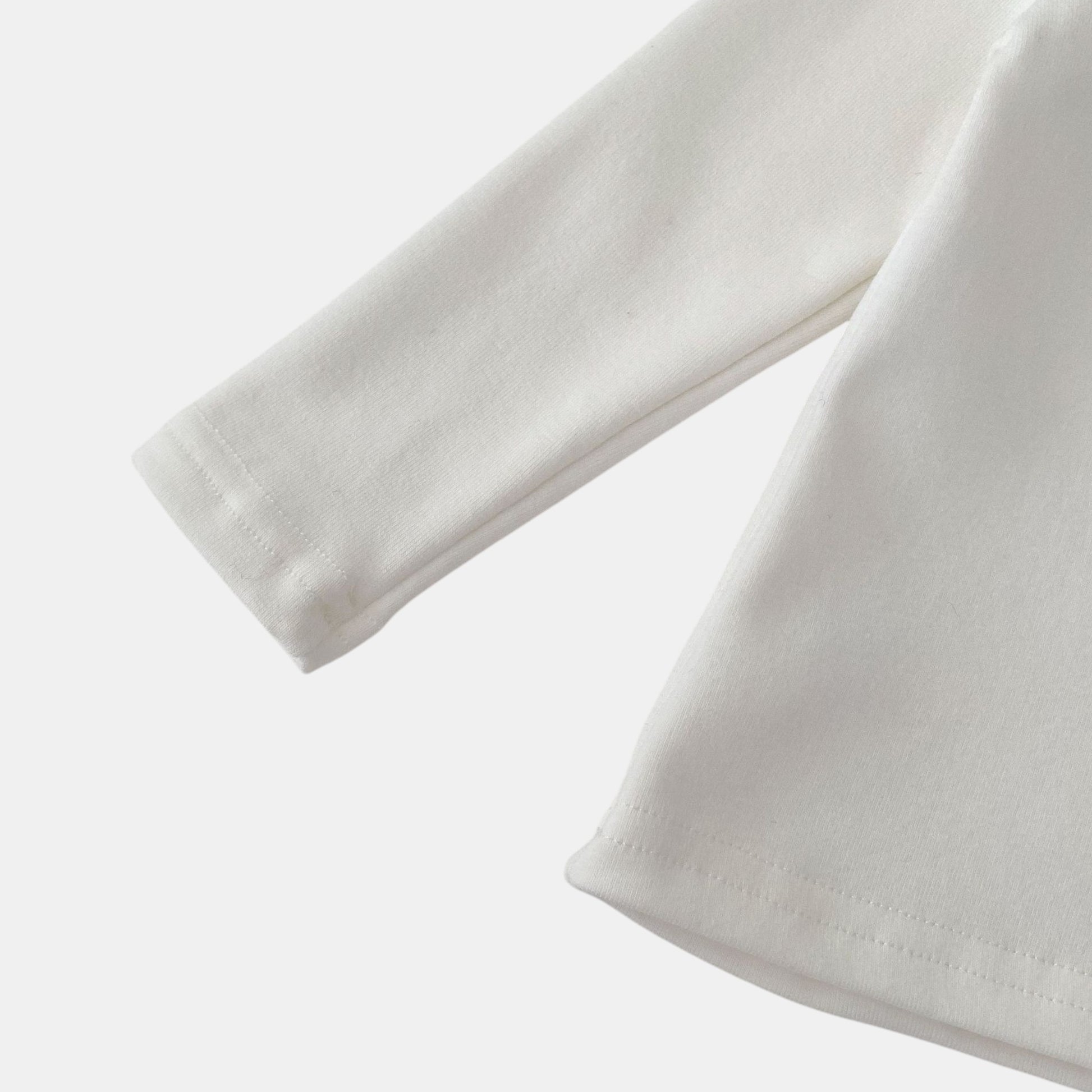 An ivory cotton long sleeve top with a floral lace ruffle collar—soft, breathable, and designed with a hint of stretch for easy movement. The woven fabric drapes gently, while the lace detail adds a touch of understated sweetness. Perfect for pairing with bloomers for portraits, or layering under pinafores for everyday adventures.