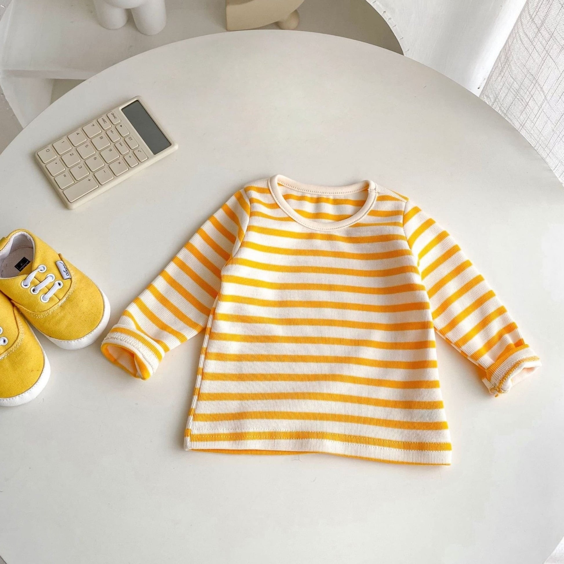 A sunshine-yellow ribbed long-sleeve top with horizontal stripes—classic, cheerful, and designed for play. Made from a soft cotton-elastane blend that moves with them, whether they’re climbing, crafting, or curled up for storytime. Unisex and effortless, it layers neatly under pinafores or pairs with jeans for easy everyday style.