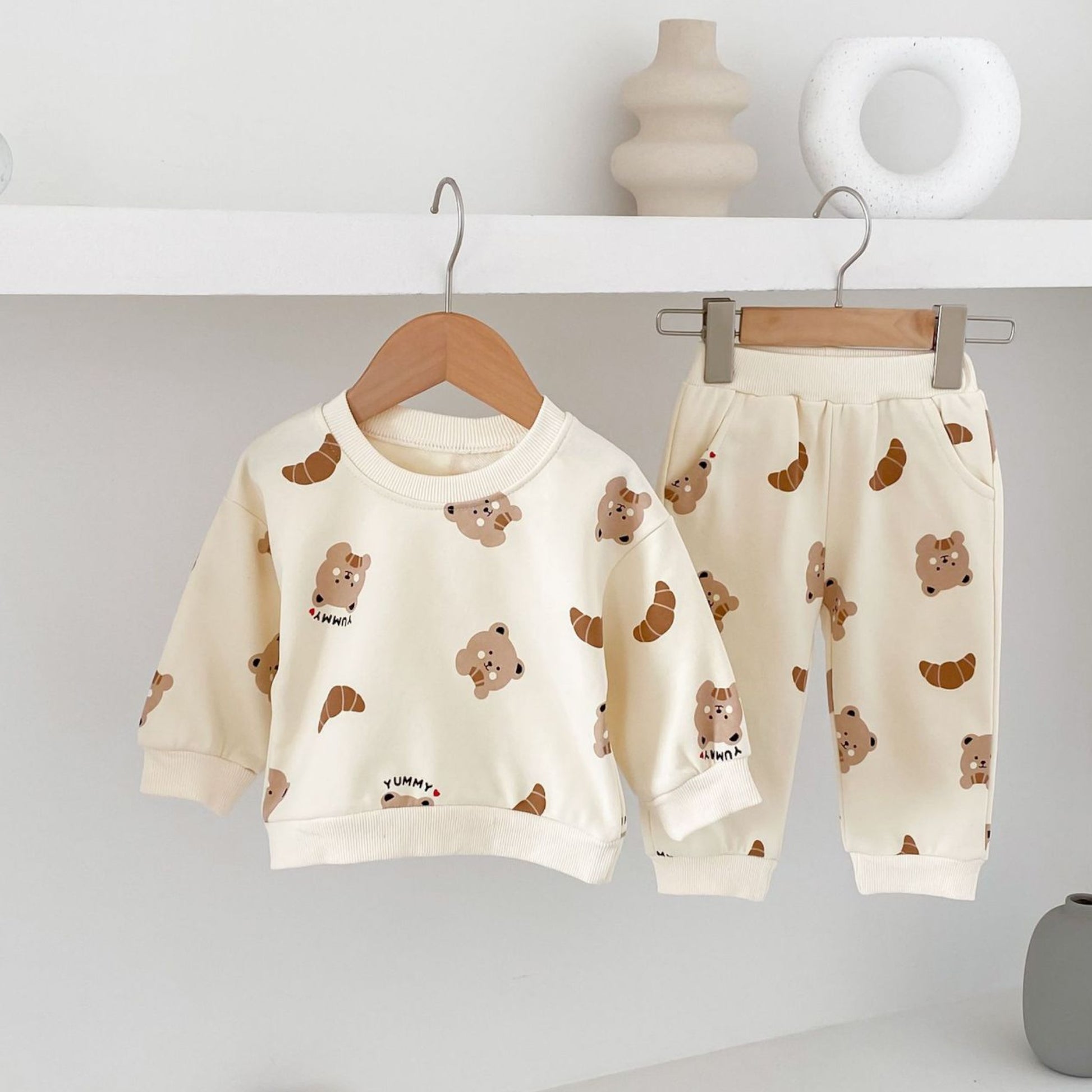 This cosy lounge set features an adorable bear enjoying a delicious croissant, bringing a playful, Parisian-inspired charm. The comfy cotton sweater and elasticated waist joggers ensure easy movement for lounging, playtime, or casual outings. Perfect for little food lovers and cuddle-filled days.