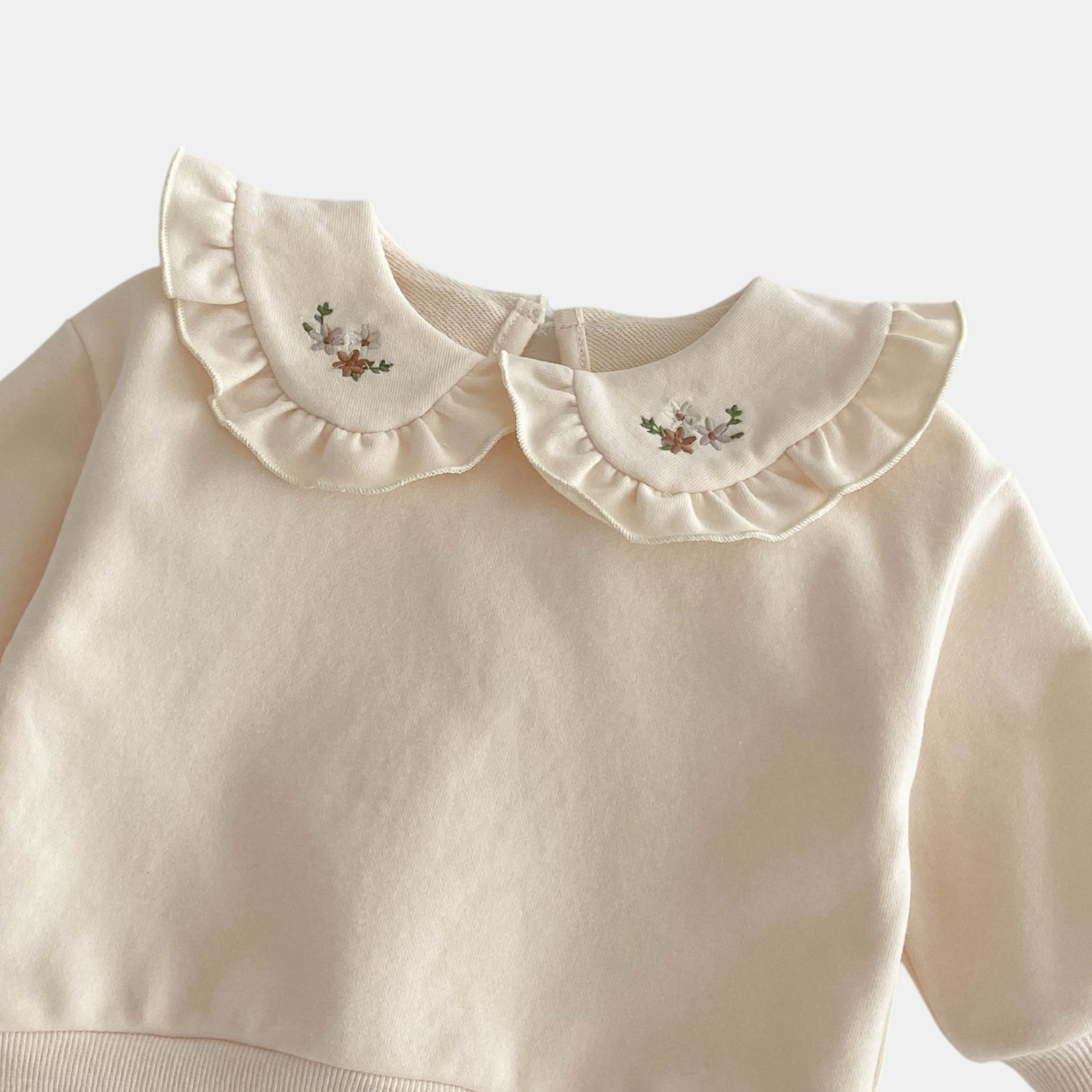 A cream cotton lounge set with a softly ruffled collar and delicate floral embroidery—equal parts sweet and snug. The sweater’s relaxed fit and elastic-cuffed joggers move with them, whether they’re building pillow forts or strolling to the café. Understated enough for everyday, special enough for weekend brunches.