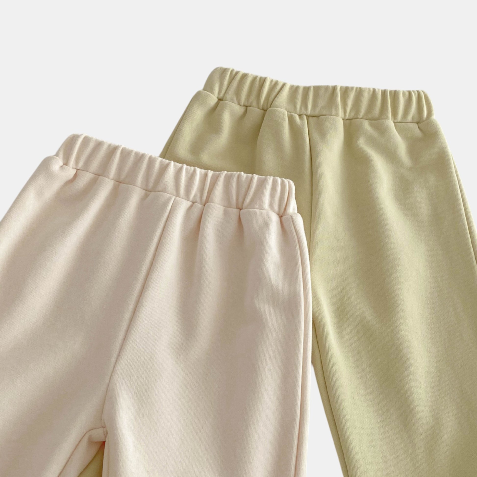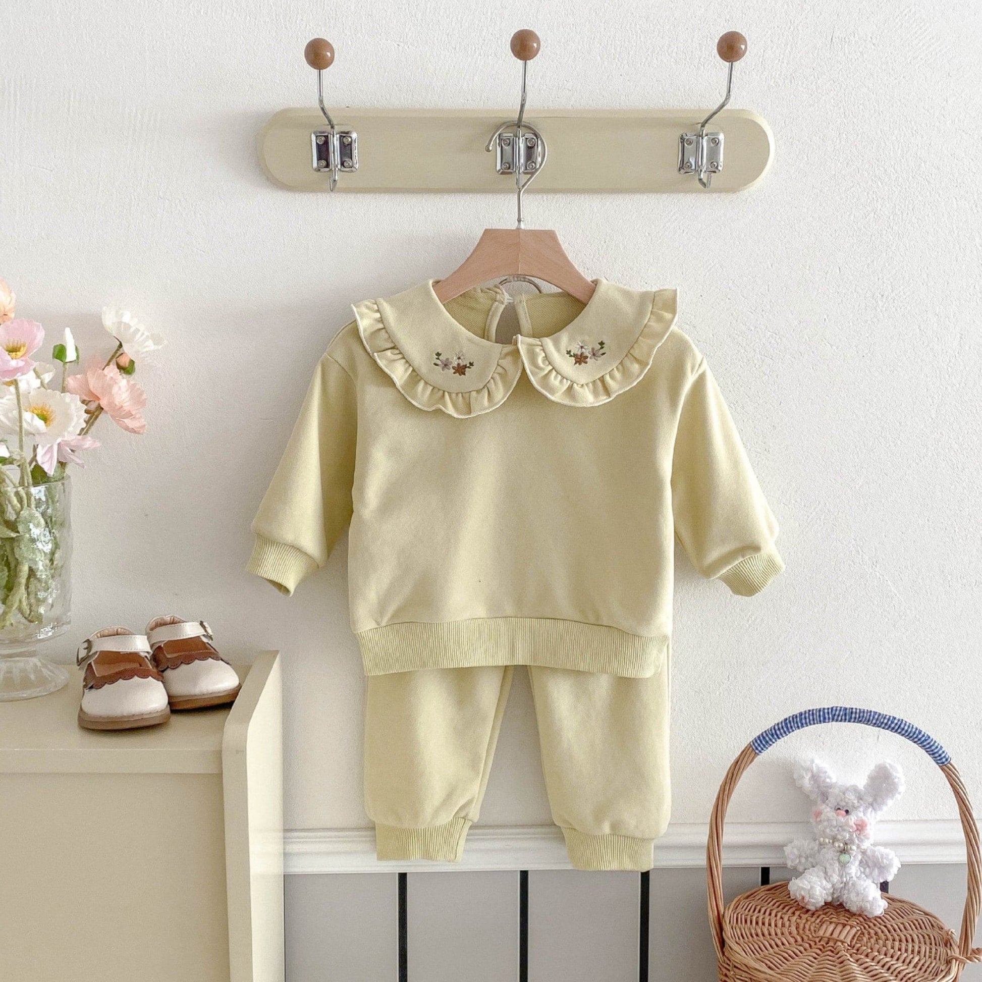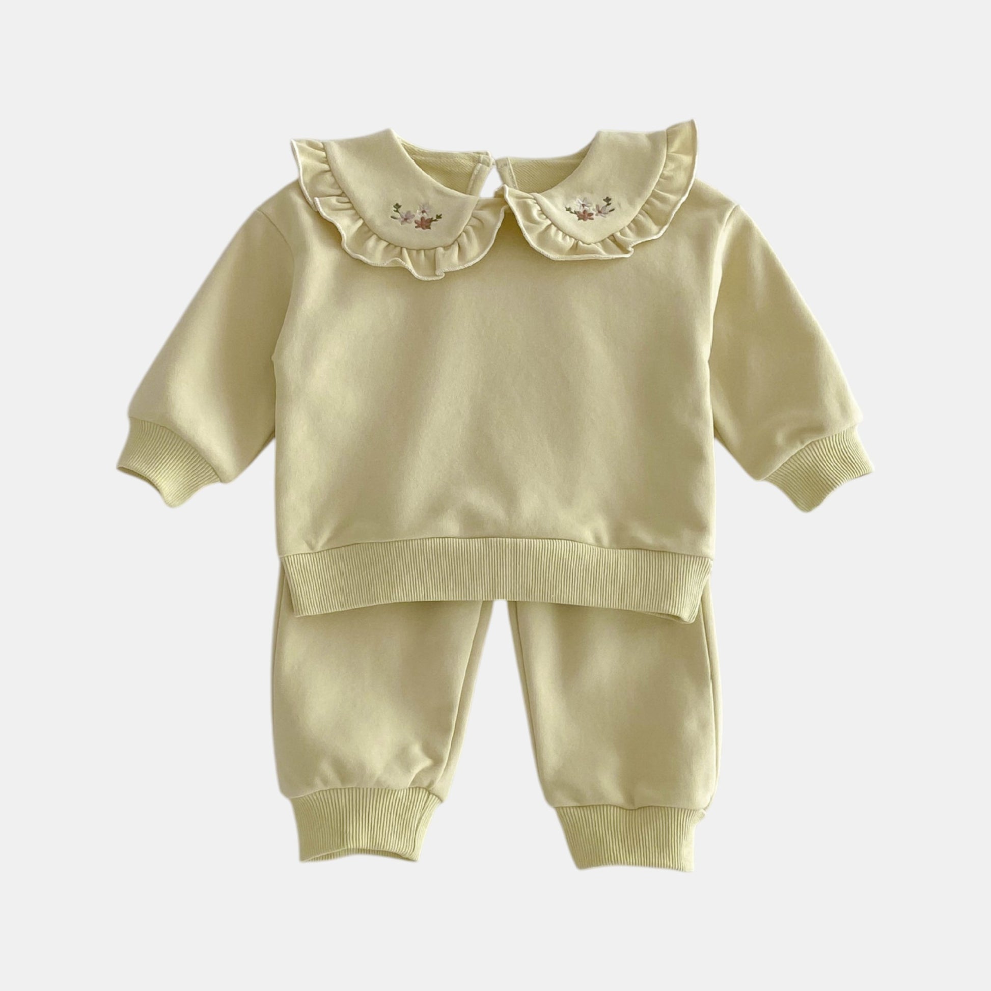 A soft light green cotton lounge set with a dainty ruffled collar and delicate floral embroidery. The relaxed sweater and elastic-waist joggers move with them, whether they’re chasing butterflies or curled up with a book - for childhood’s perfect balance of magic and calm.