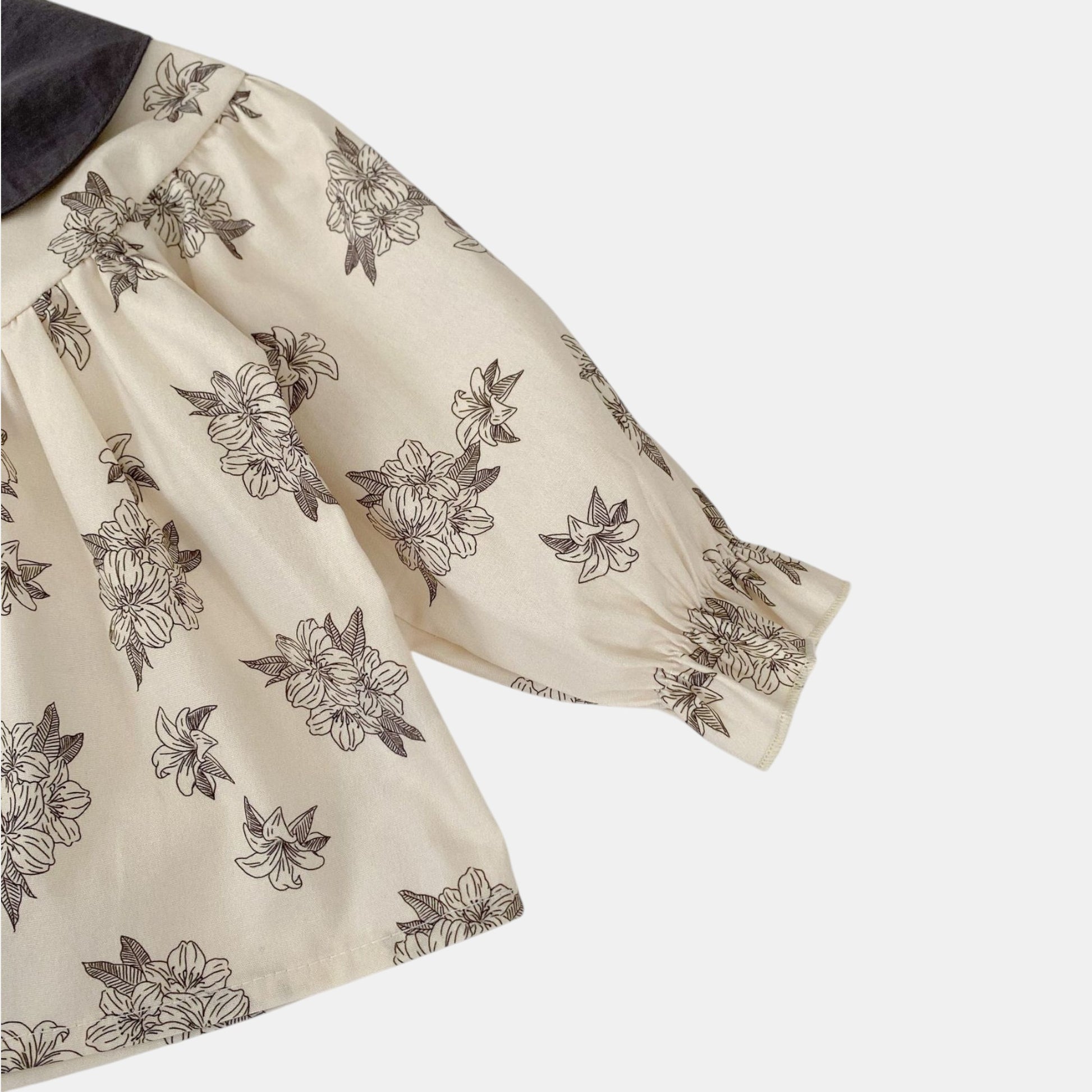 Delicate yet striking, this cotton set brings a touch of floral elegance to your little one's wardrobe. The cream blouse features a contrast dark grey collar and a charming allover blossom print, its button-front making dawn-to-dusk wear effortlessly sweet. Paired with dark grey bloomers—cut for movement with an elasticated waist—the set transitions seamlessly from nursery mornings to celebratory afternoons, its quiet charm as enduring as it is sweet.