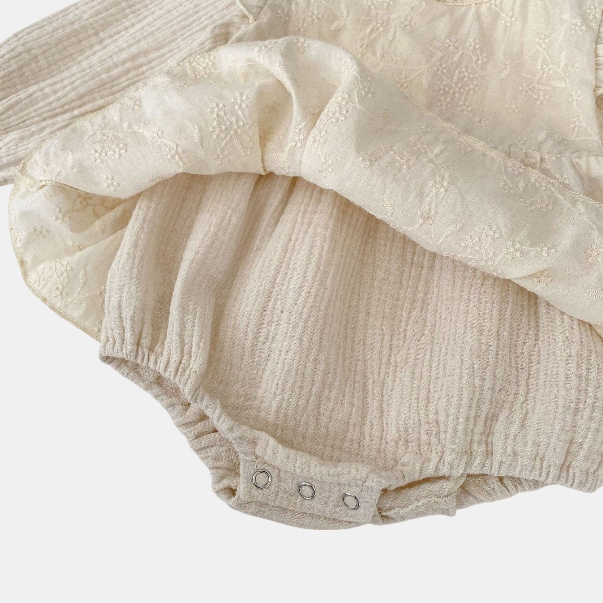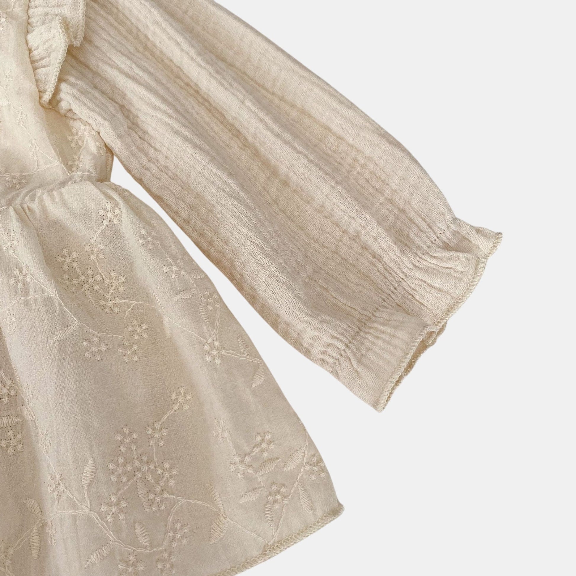 Delicate cotton romper dress with trailing floral embroidery, designed for twirling (and occasional tumbles). Style with tiny ballet flats for a first birthday photoshoot, or keep it simple with bare feet and a sunhat for everyday magic. The kind of piece that looks just as sweet with cake smudges as it does in frames.