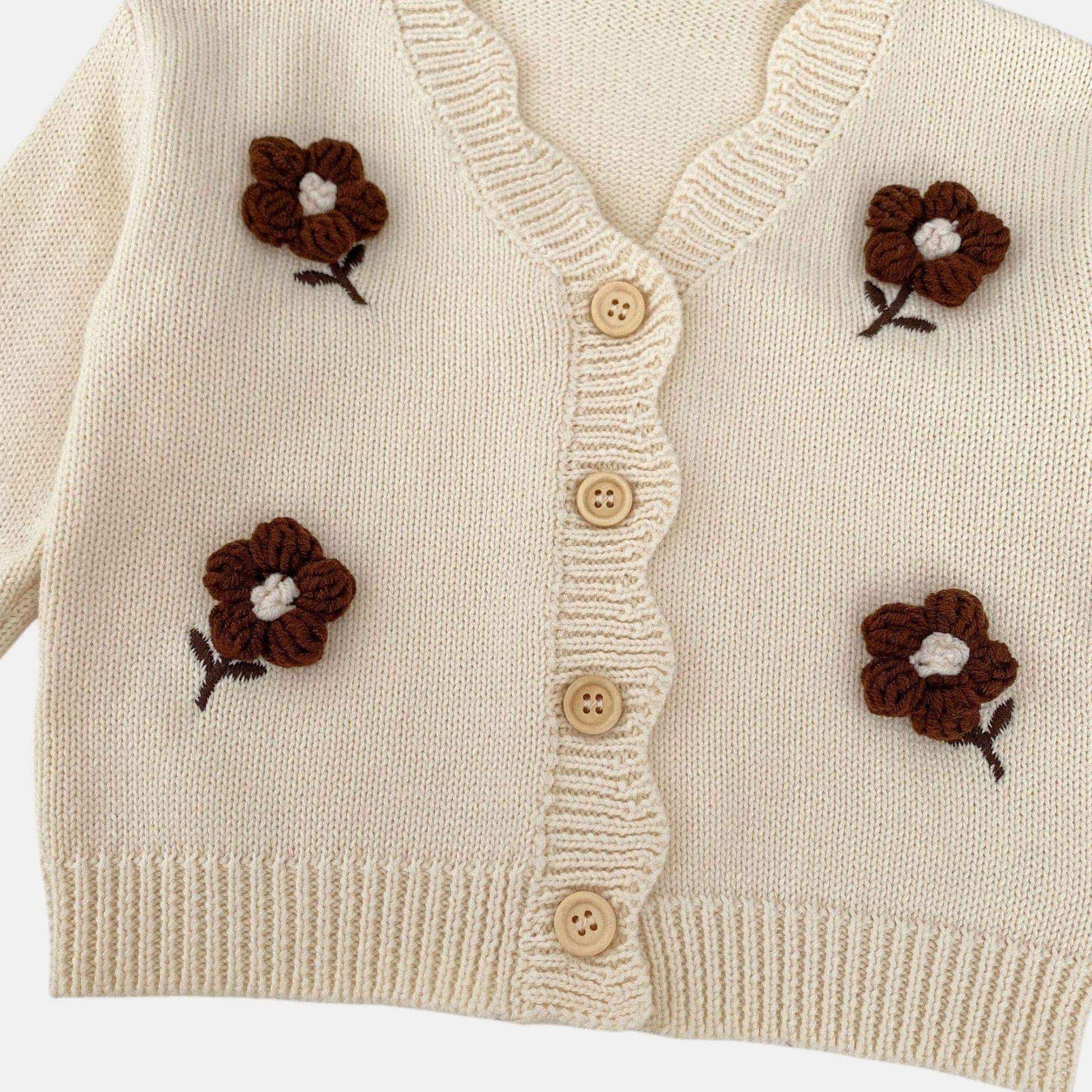 A timeless layer with soft scallop edges and subtle 3D floral detailing. The relaxed cream knit cardigan slips easily over tees and dresses, while the brown flower accents add just the right hint of texture. Perfect for playground visits, weekend errands or curling up with a favourite book – it’s the easy-going essential your little one will reach for every day.