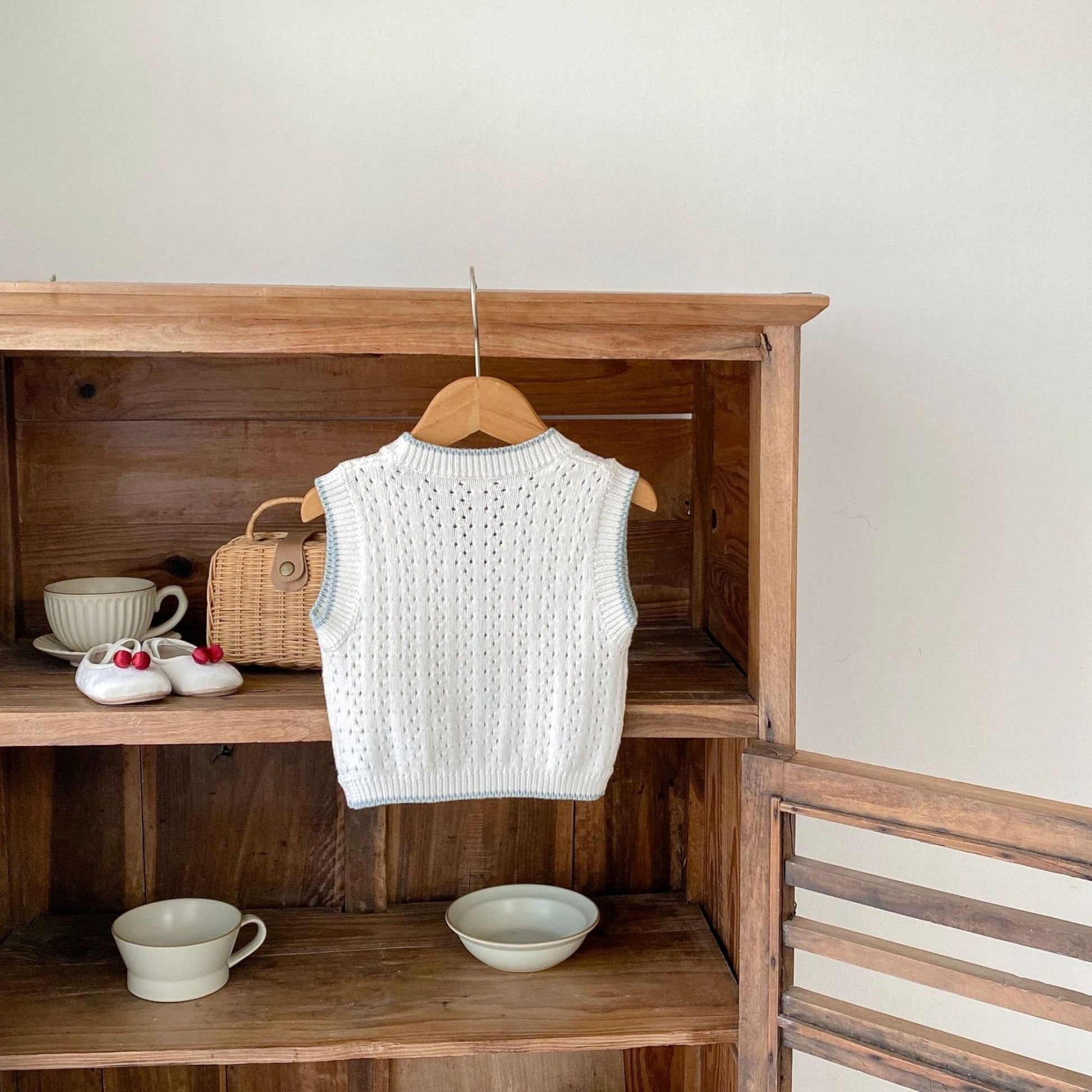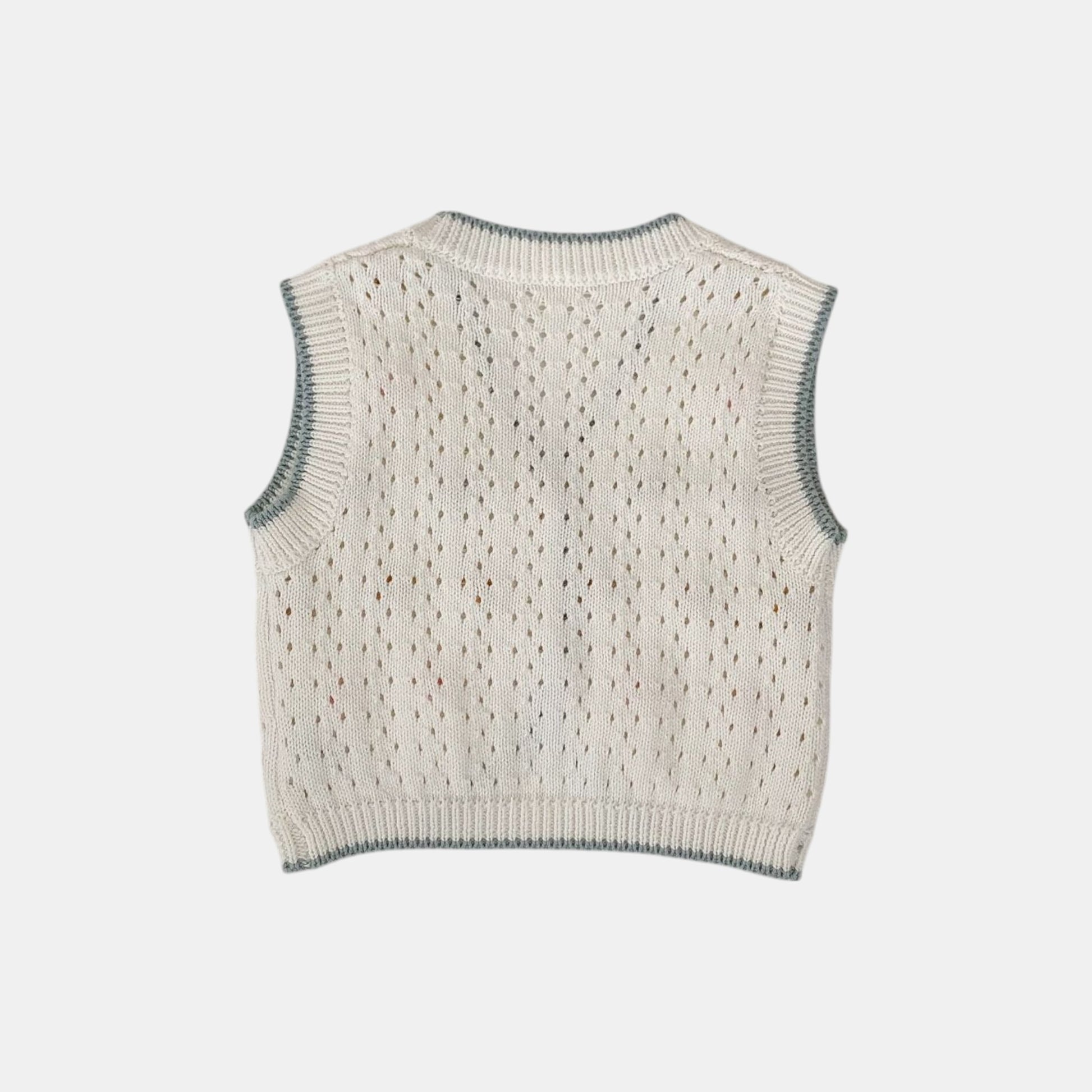 An ivory pointelle knit vest with soft blue edge trim and subtle button-front closure. The handmade balls in muted tones add a playful yet understated texture—perfect for layering over tees or blouses. Lightweight, breathable, and designed to be the sweetest little detail in their everyday adventures.