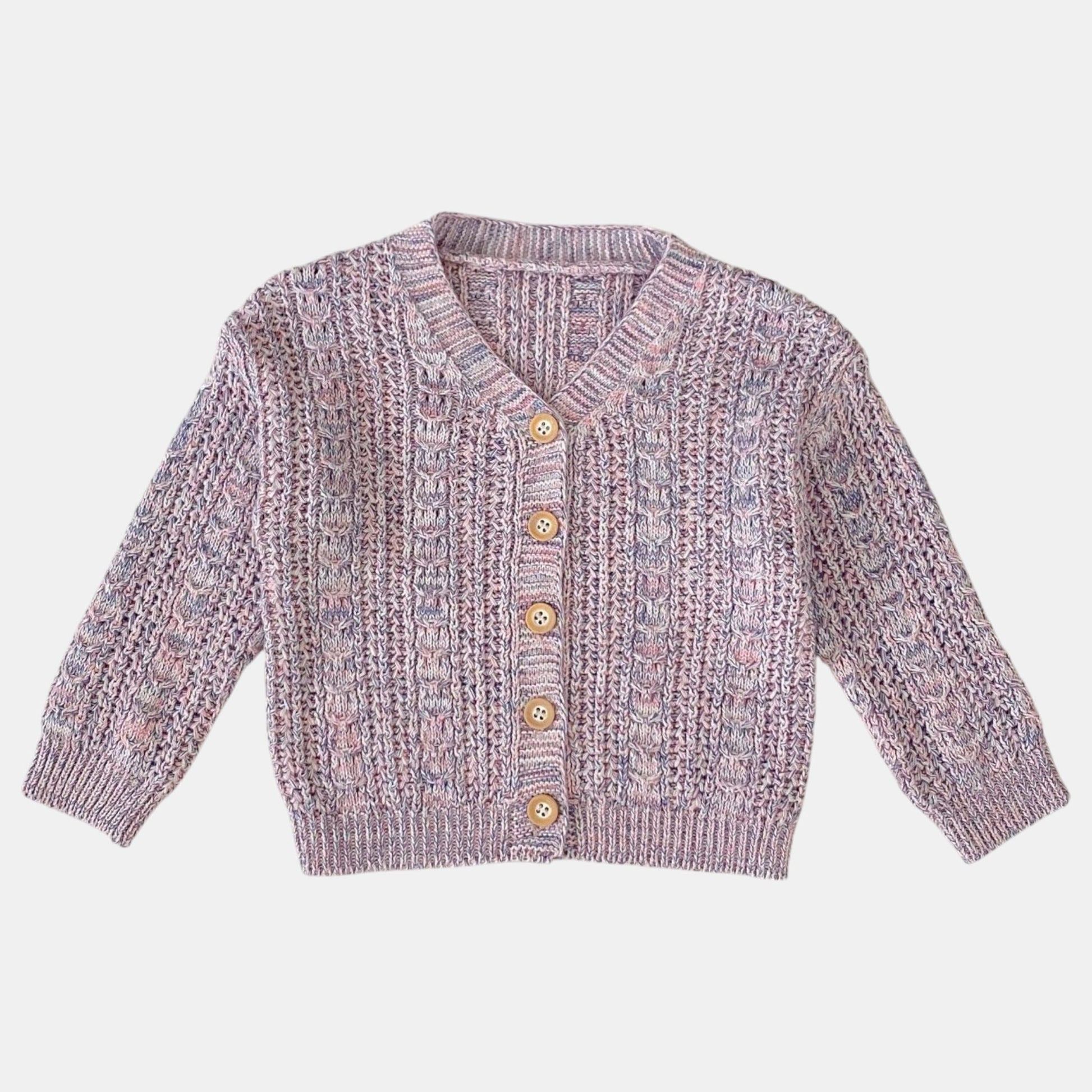 Wrap your little one in the whimsical charm of this lavender blush knit cardigan, crafted from 100% cotton for breathable softness. Gentle hues of purple, pink, and white intertwine like a pastel sunrise, while delicate vertical braids add a touch of textured elegance. With a classic V-neck and button-front, it’s perfect for layering on crisp days, whether for garden adventures or cosy storybook afternoons—blending comfort with enchanting style.