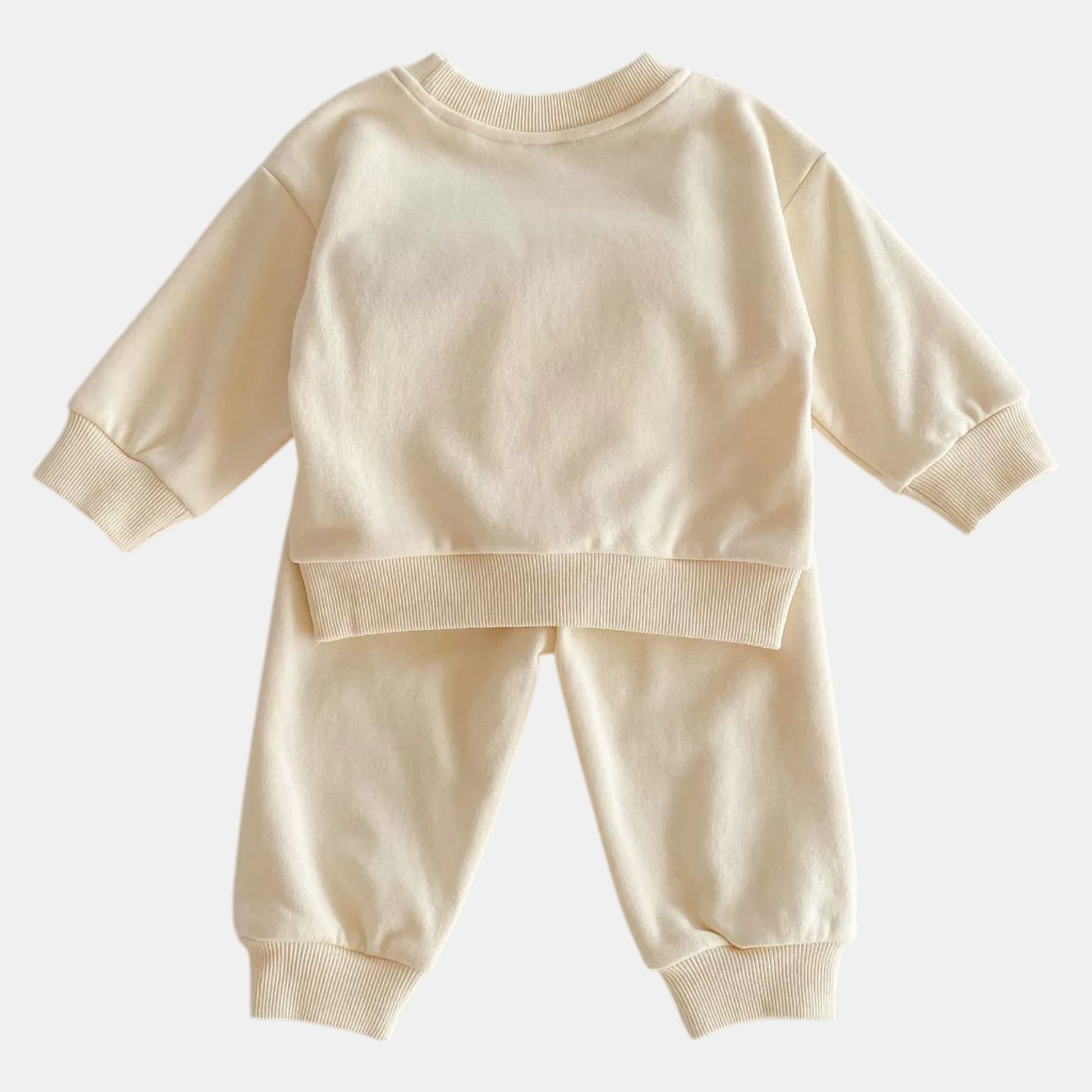 A vanilla cream cotton lounge set with a playful goldfish peeking from the sweater—soft, sweet, and effortlessly charming. The elastic cuffs and waistband keep them cosy during naps or playtime, while the neutral shade pairs easily with any accessory. Add leather moccasins for weekend adventures or a knitted bonnet for crisp morning walks—a timeless set that grows with their curiosity.