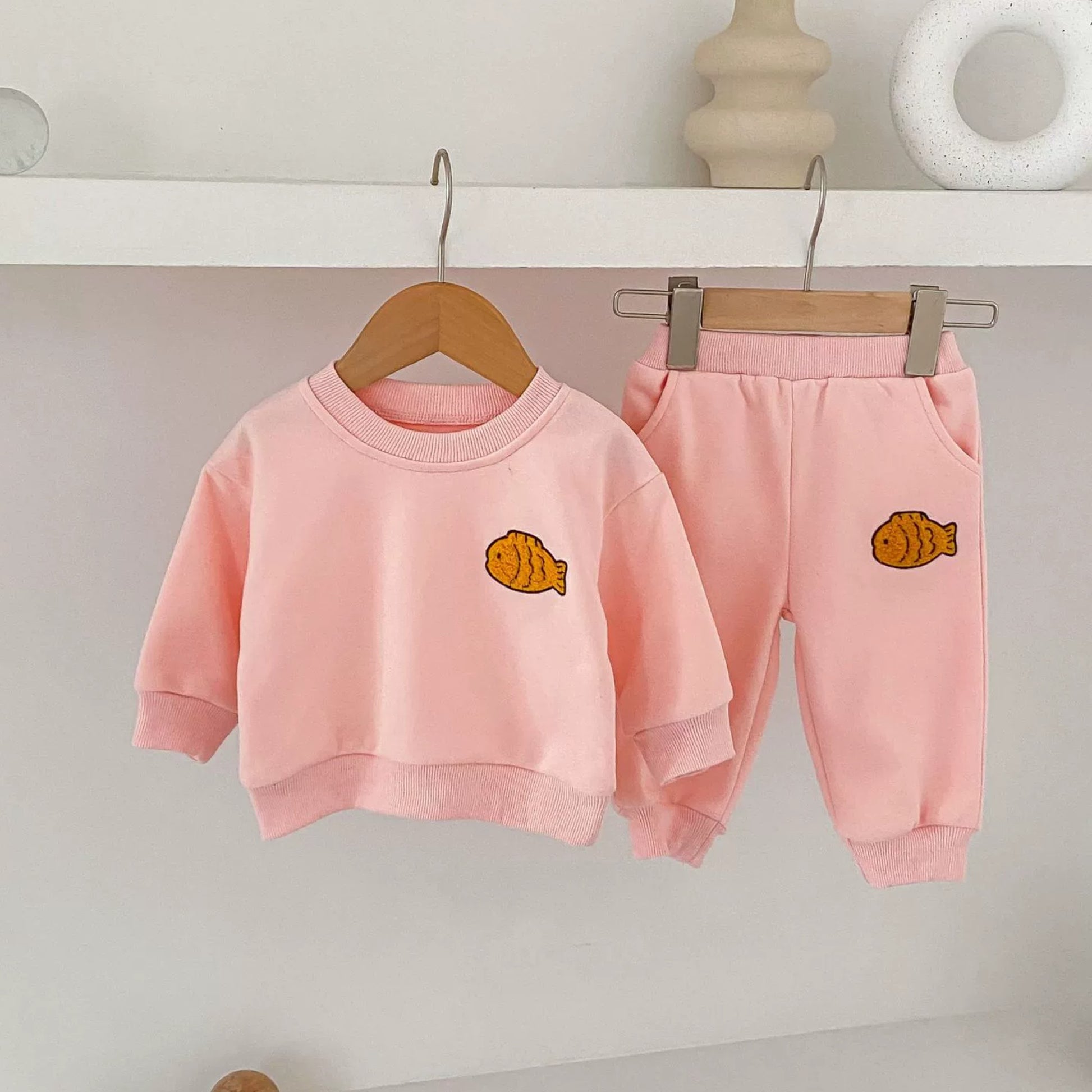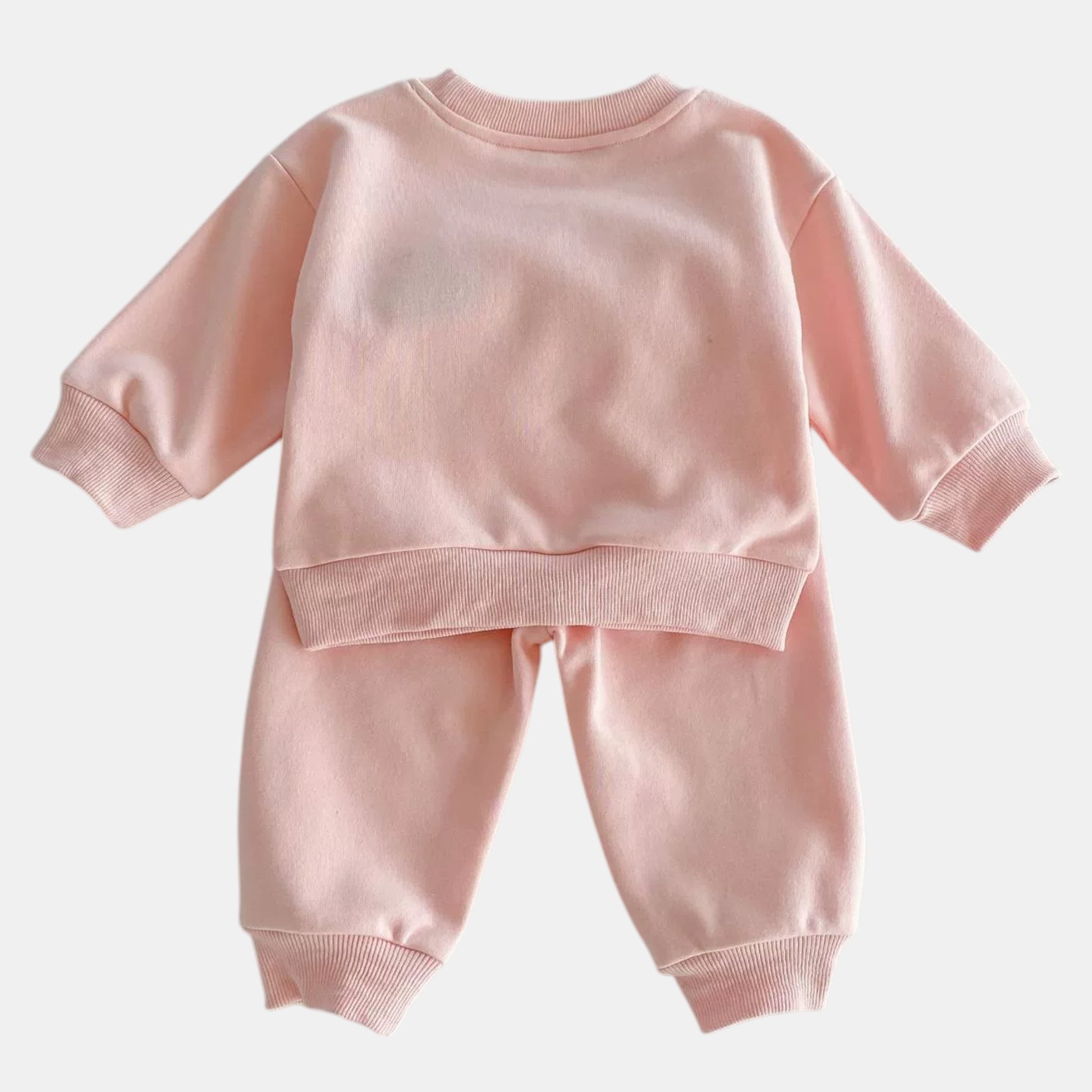 A soft pink cotton lounge set with a playful goldfish detail—cosy for lazy mornings and garden adventures alike. The elastic cuffs and waistband ensure comfort, while the breathable cotton keeps them fresh through playtime and naps. Add knitted booties for chilly afternoons or a sunhat for park outings to complete the look