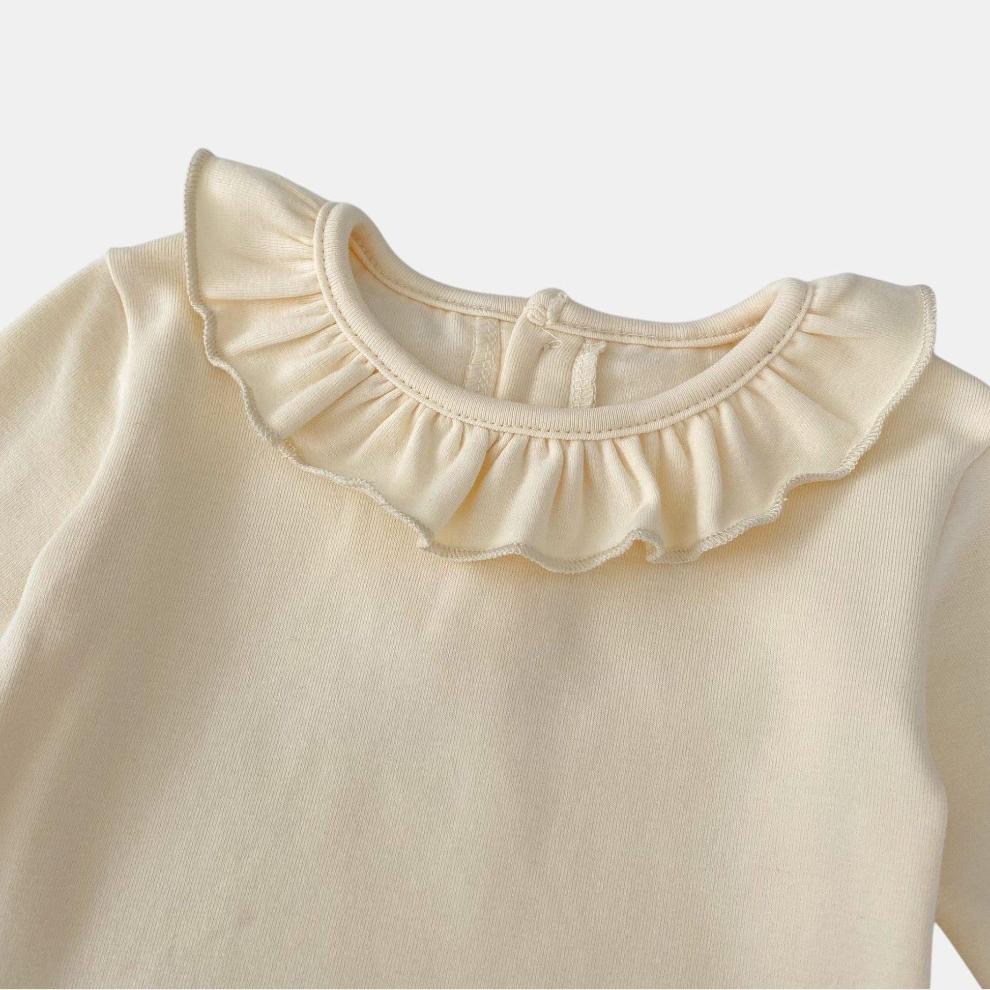 A cream cotton top with a delicate ruffle collar – the kind that elevates everyday outfits effortlessly. Style it under pinafores on cooler days, or pair with denim for weekend adventures. Designed to be the top that gets pulled from the drawer again and again, always looking quietly polished.