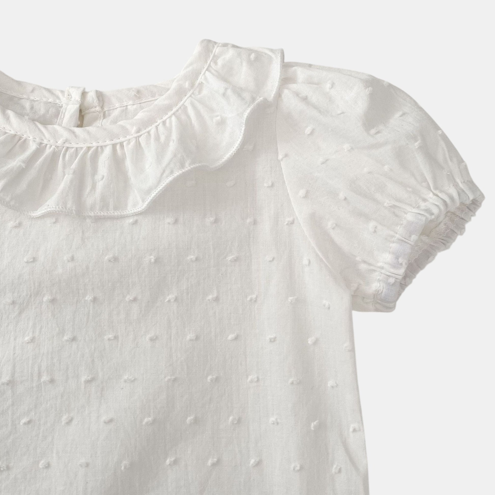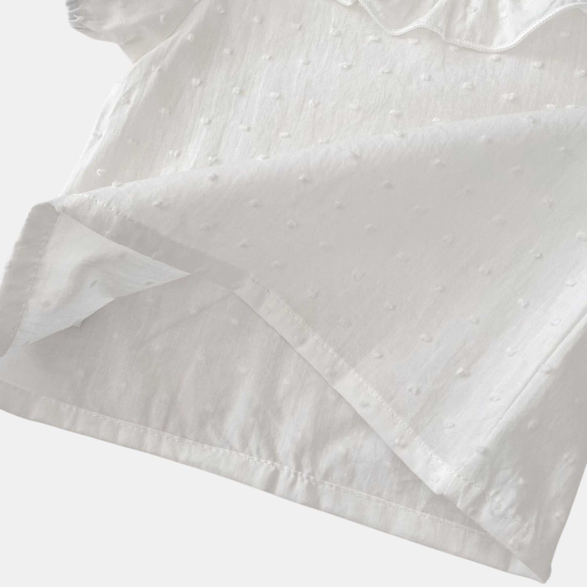 Light and airy, this white cotton plumeti top is perfect for warmer days. Puff short sleeves with elasticated cuffs and a delicate ruffle collar add subtle charm, while the soft, breathable fabric keeps little ones cool and comfortable during playtime or sunny outings.