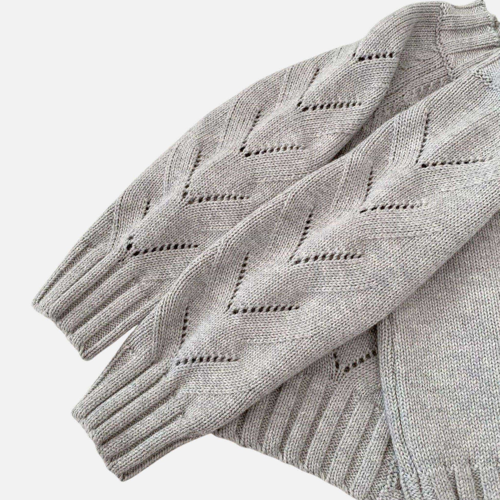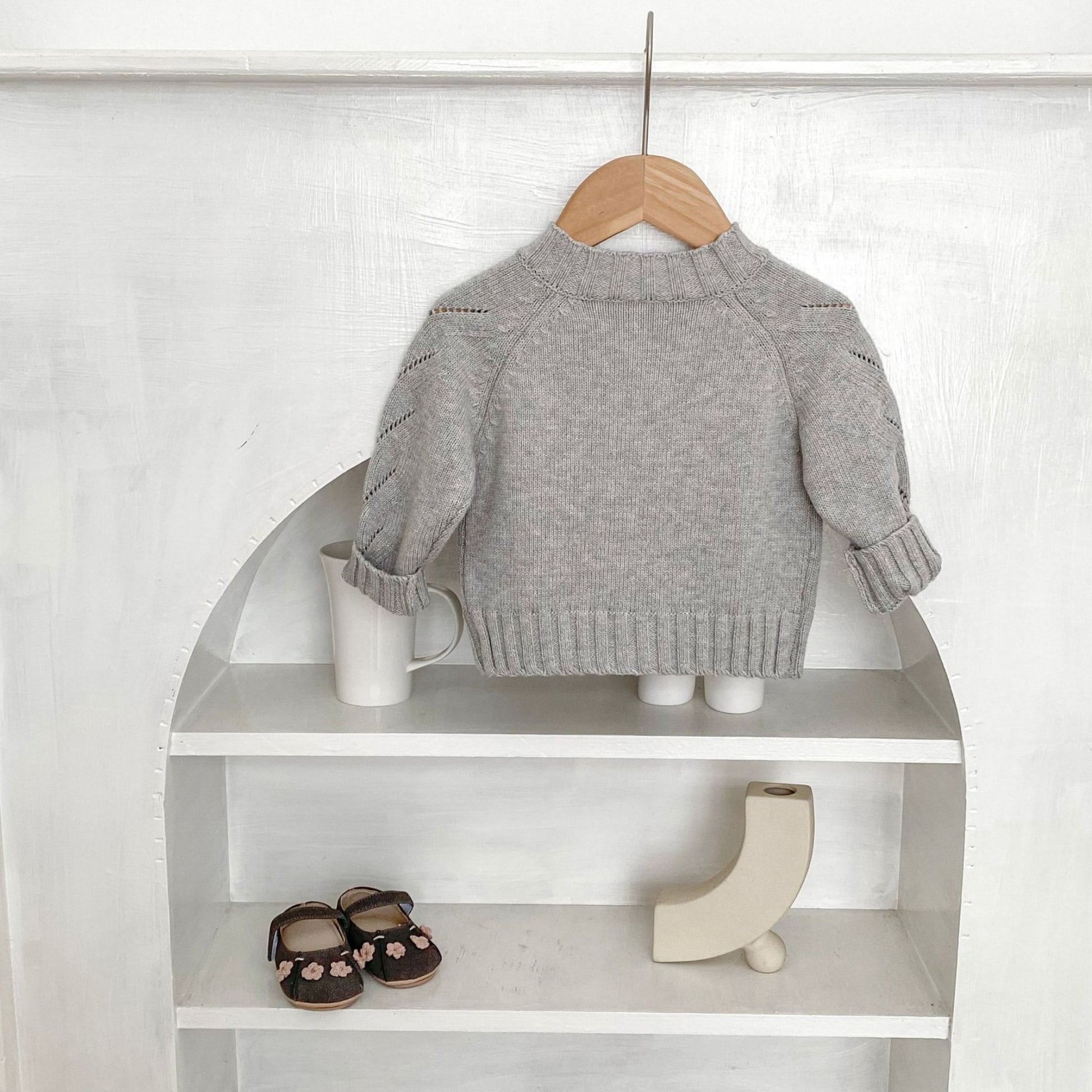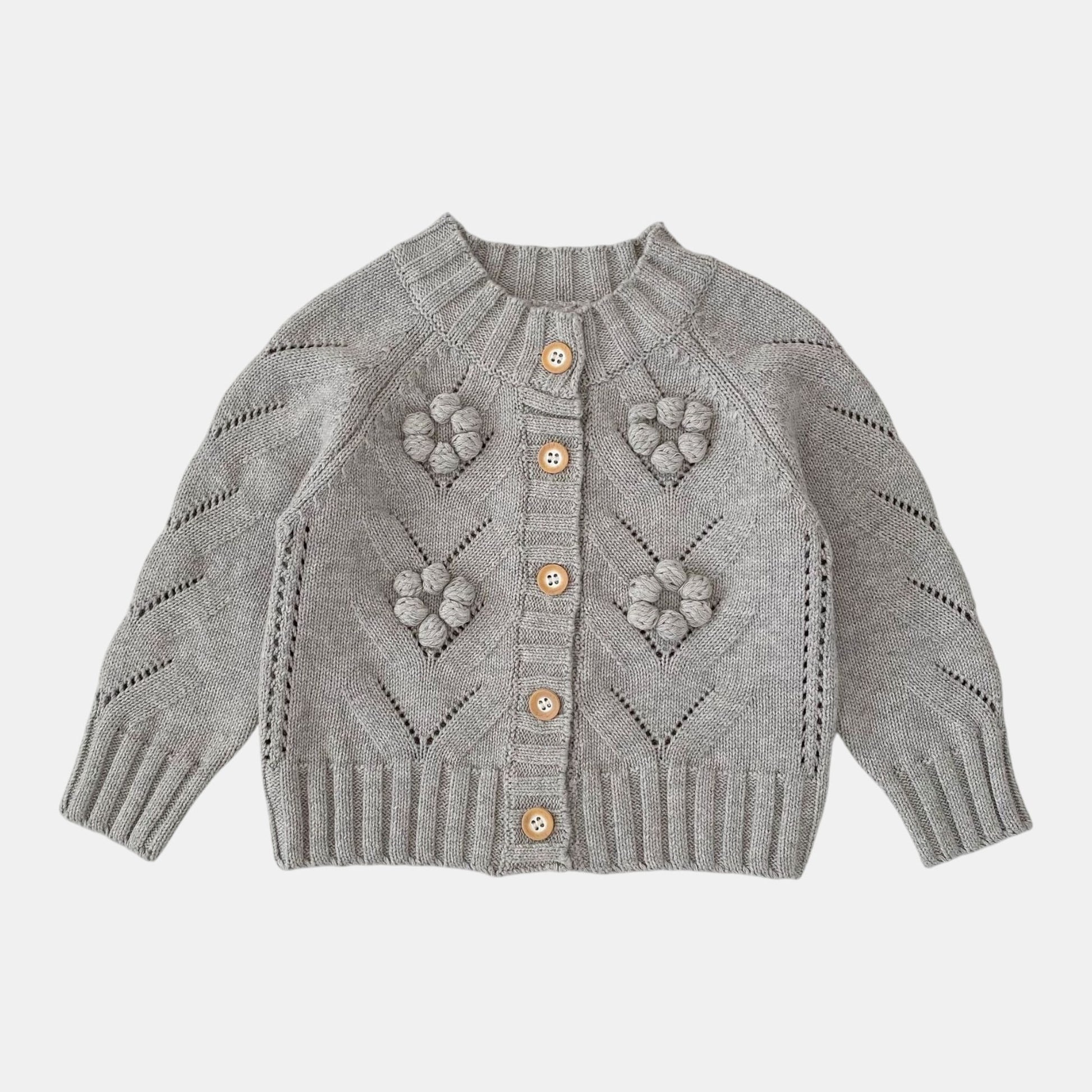 A charming grey knit cardigan with handmade flower-shaped balls and delicate knitted patterns for a subtle, artisanal feel. Comfortable and cosy, it’s ideal for layering during cooler mornings, family outings, or quiet indoor play.