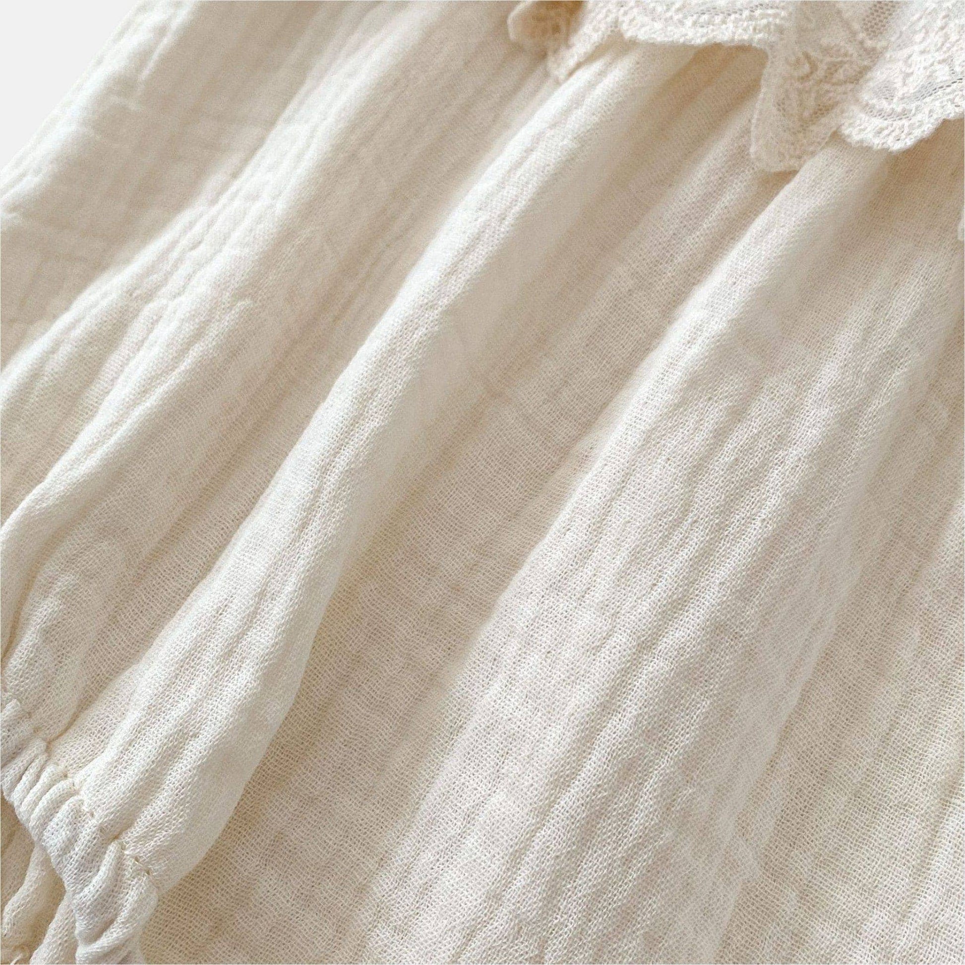 A cream cotton romper with delicate floral lace ruffles – soft enough for all-day wear, special enough to turn heads at garden parties. The elastic cuffs and snap buttons make dressing easy, while the lace adds a touch of charm. Perfect for when you want them to look polished without sacrificing playtime comfort. The kind of piece that still looks lovely after being twirled in, napped in, and thoroughly lived in