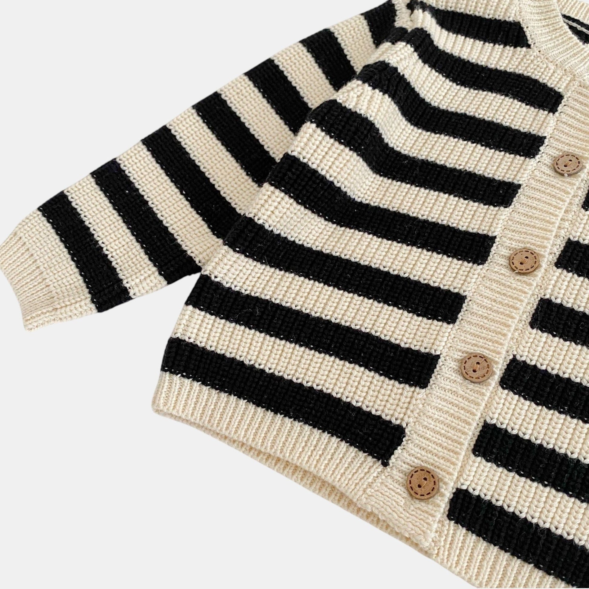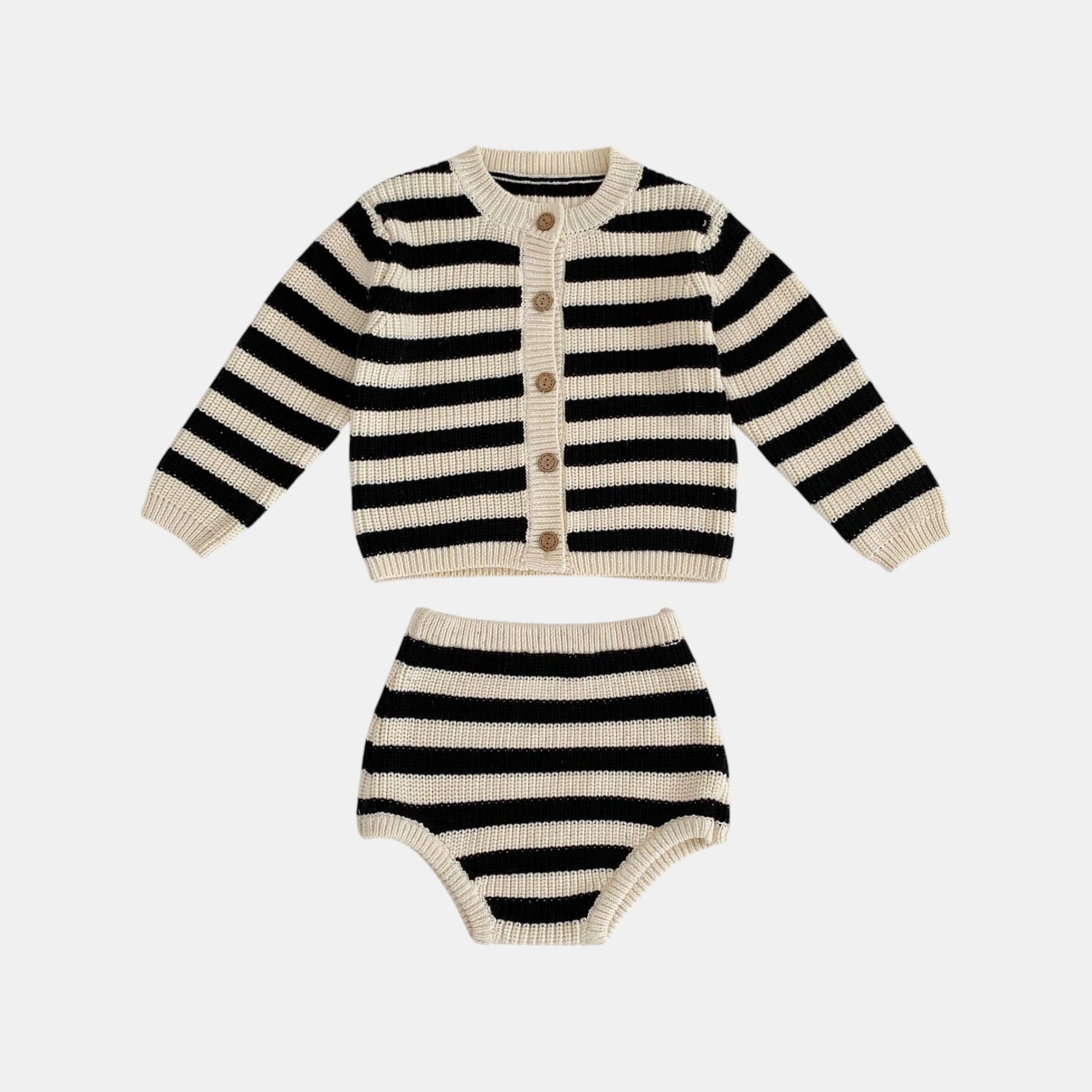 A cream cotton knit set with timeless black stripes – the cardigan buttons neatly over a bodysuit, while elasticated bloomers promise playground-ready ease. Add a knit beret for a touch of French flair, or let the stripes speak for themselves. From café outings to crêpe-fueled playdates, it’s a set designed for the sweetest moments.