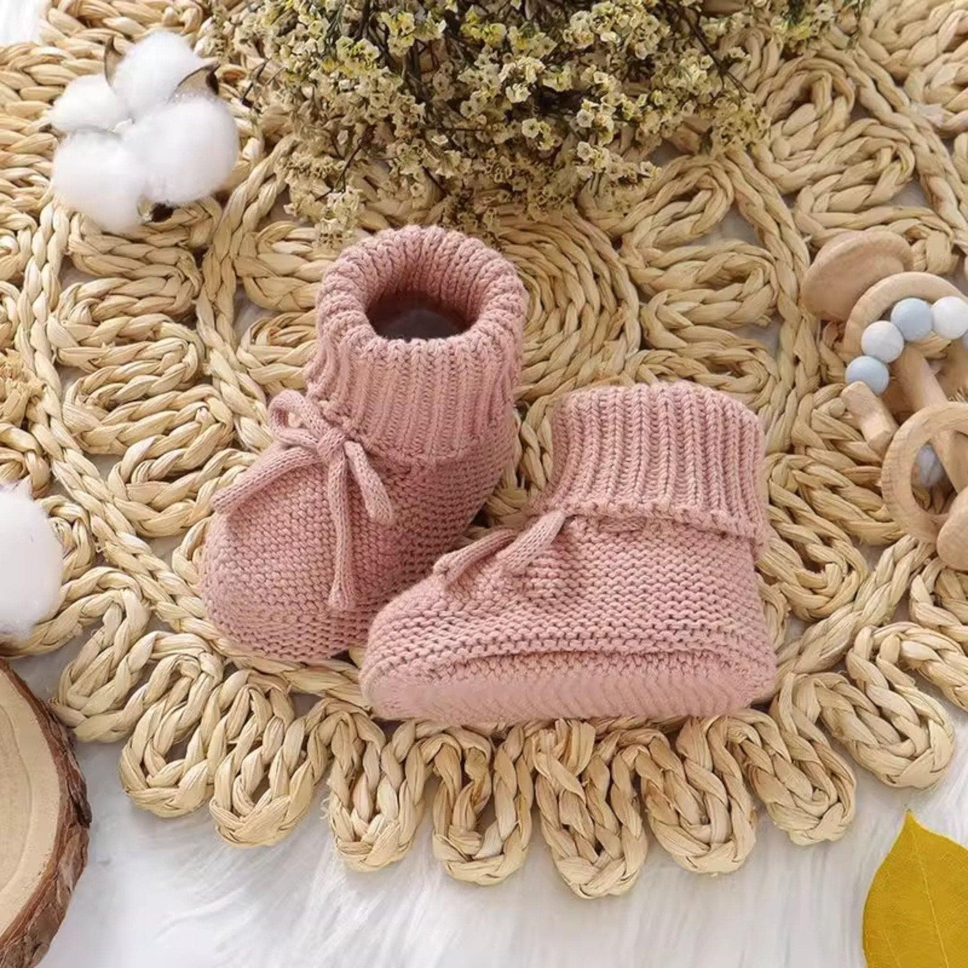 Gentle pink cotton booties are finished with a sweet bow and a versatile foldable cuff for short or taller styling. Style with a dress or soft leggings for playful days. Ideal for tiny feet padding around at home or in the garden.